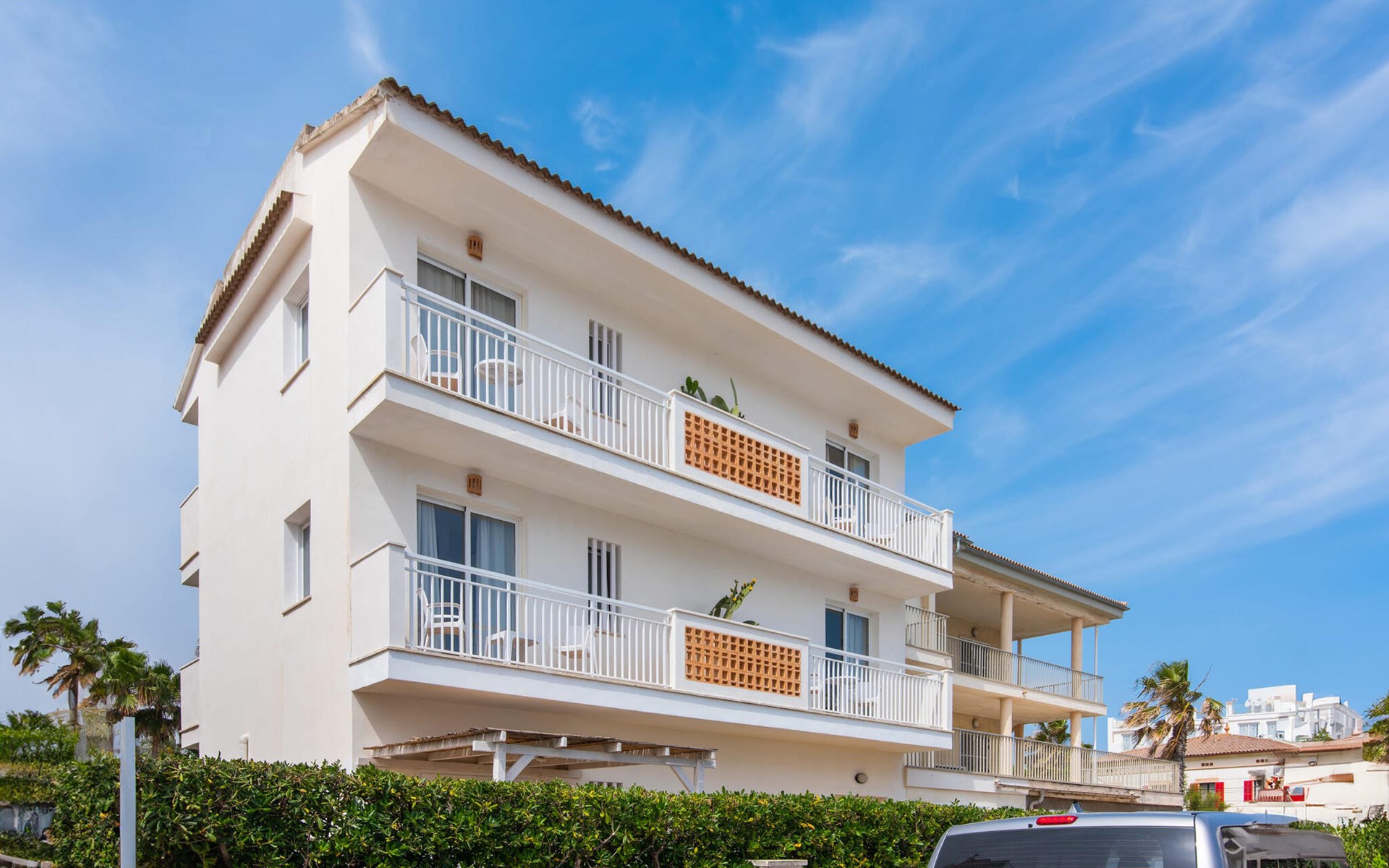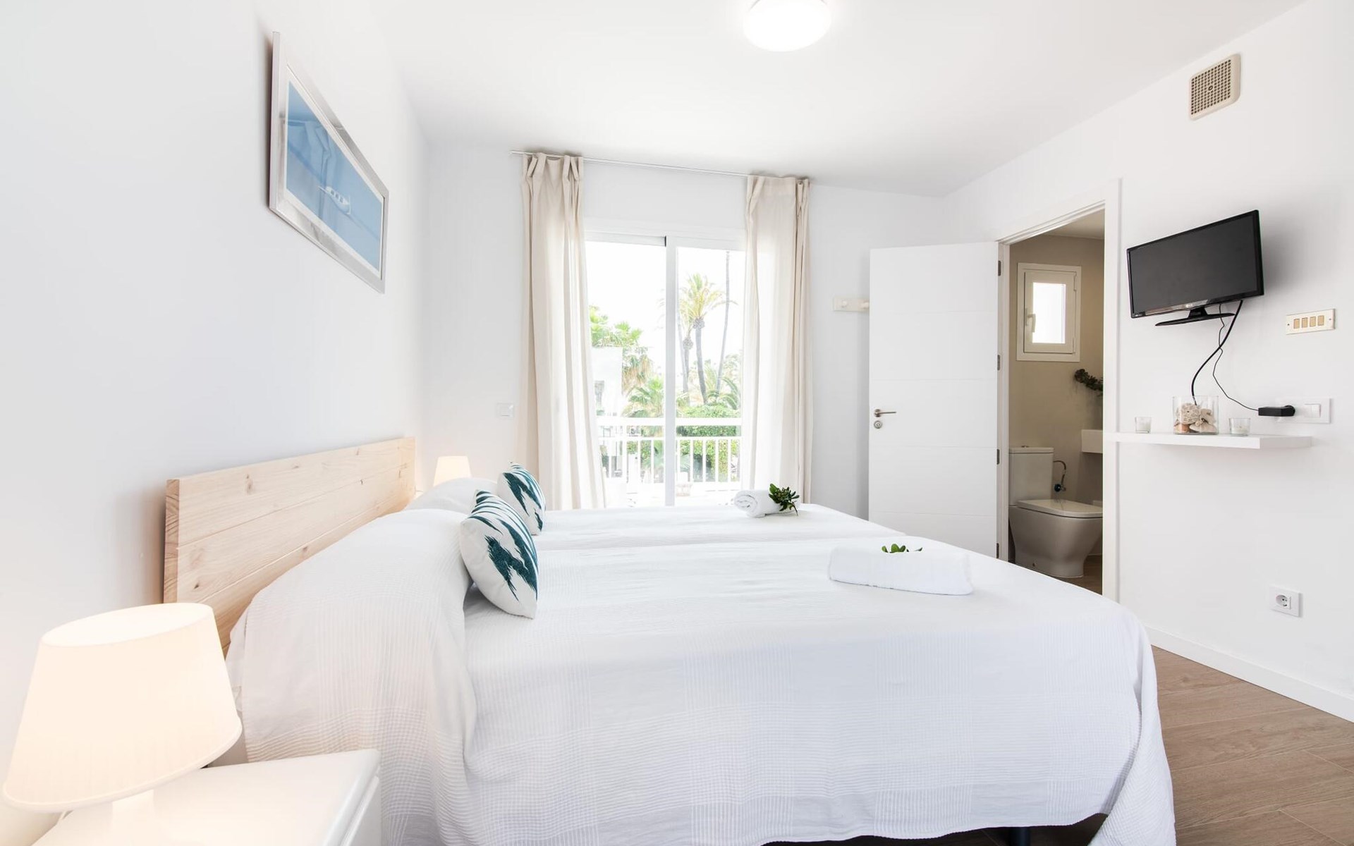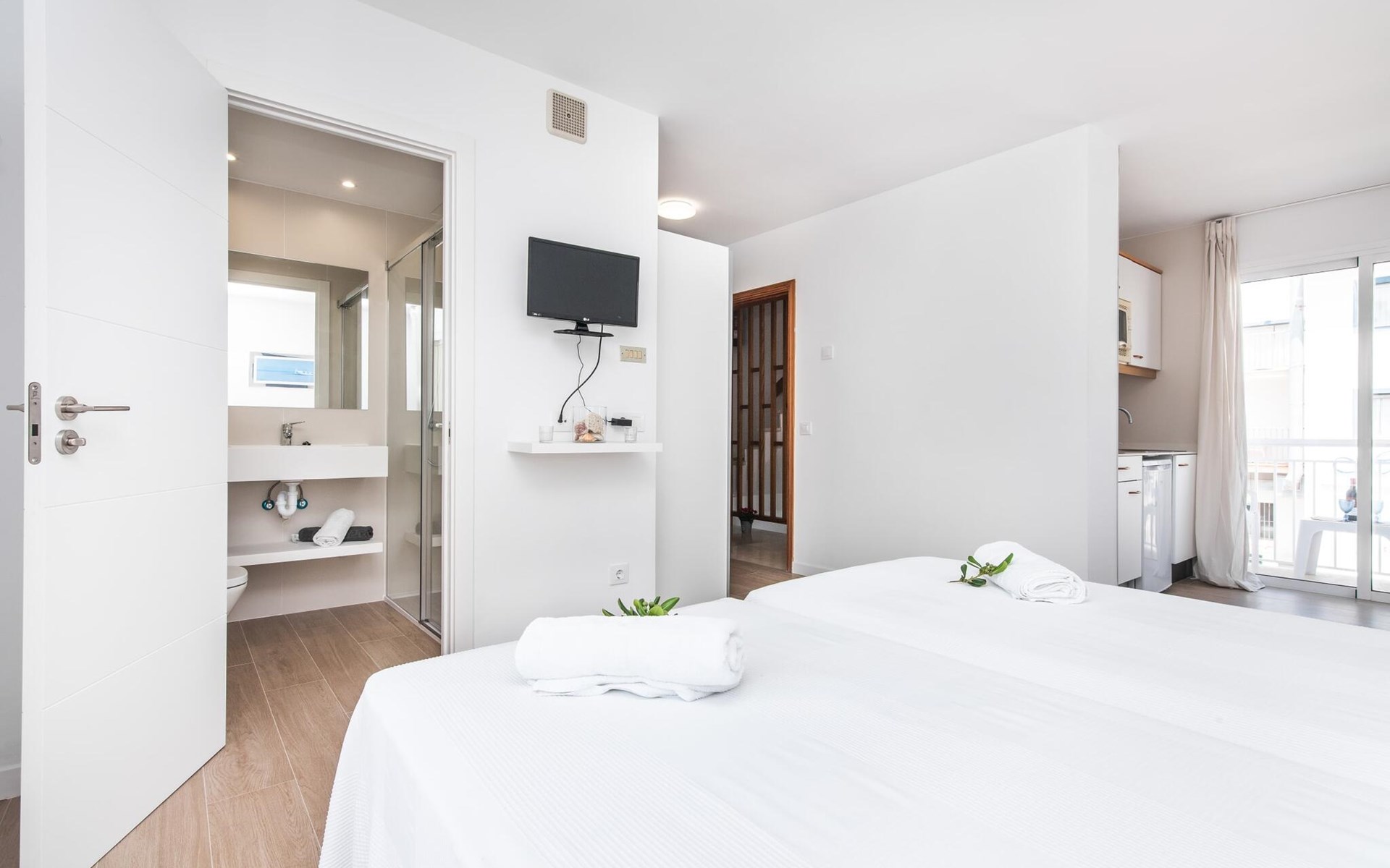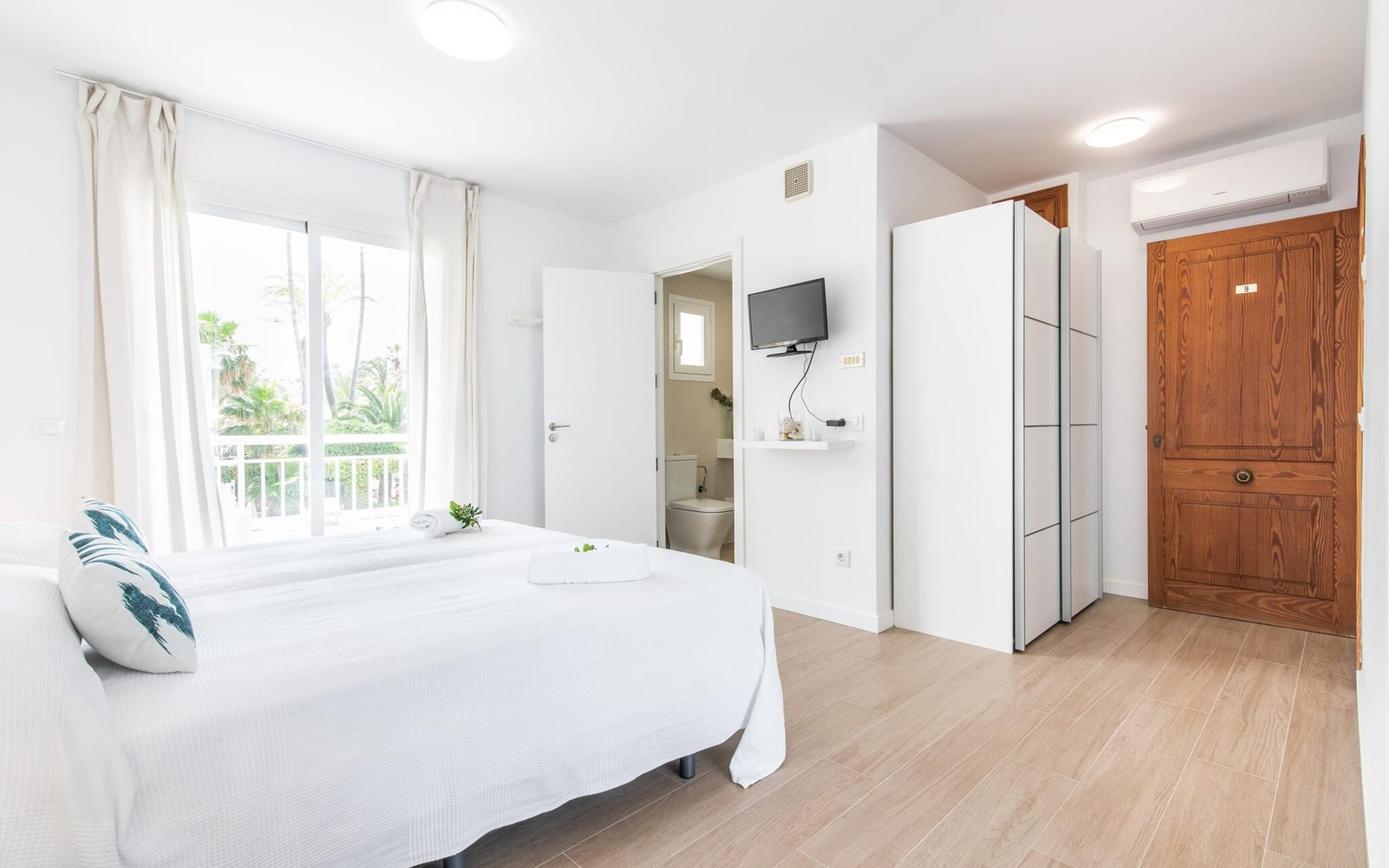 Thanks to an ingenious room concept, the Confluentia Playa 9 holiday apartment offers a cosy living area with plenty of natural light. It is open-plan and consists of a neat sleeping and dining area equipped with German and English satellite TV and an integrated kitchen with direct access to the balcony. This is a great place to spend time together indoors and ideal for self-catering. Lots of white and some colourful accents create a fresh, summery flair. The presence of heating and air conditioning ensures perfect indoor temperatures at all times. A chic, modern bathroom with a walk-in shower rounds off the inviting living comfort of this holiday apartment for two in Mallorca. The modern Confluentia Playa 9 holiday apartment is located near the centre of Can Picafort and directly on the north coast of Mallorca. In this beautiful village you will find restaurants, bars, discos and a variety of shopping facilities. The sandy beach is within walking distance and the bay of Alcúdia is just a few metres away. The area around Can Picafort is also ideal for cycling.