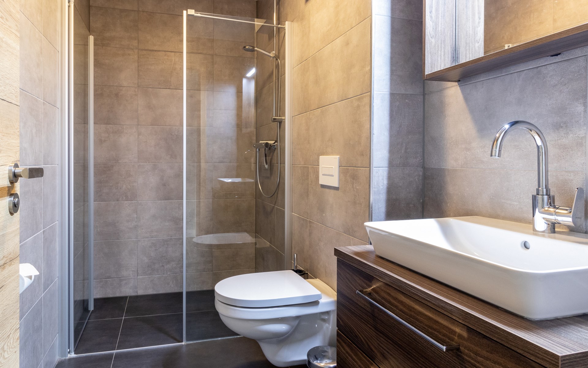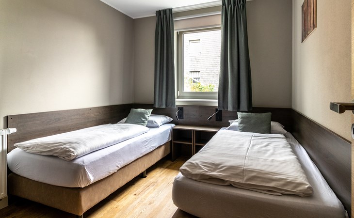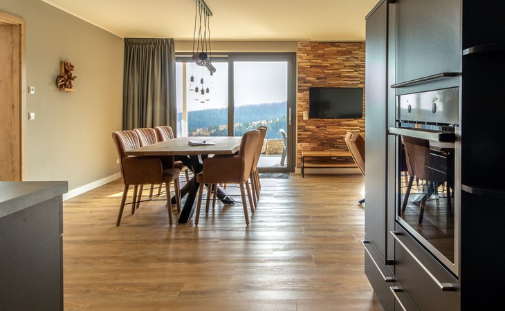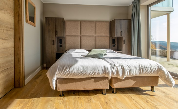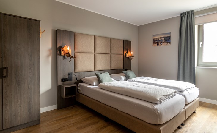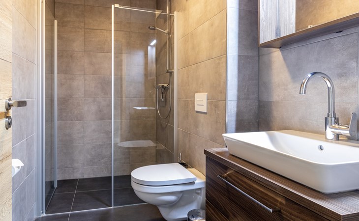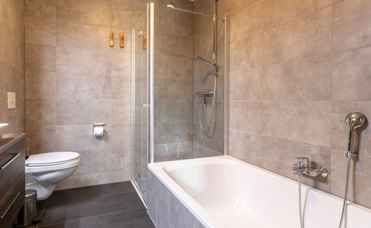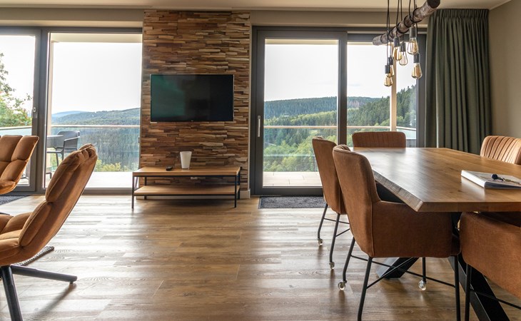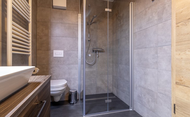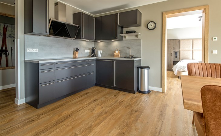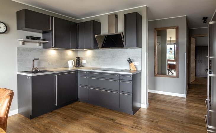 This holiday apartment with 4 rooms is suitable for 6 persons. It is spacious, light and cozy and the beautiful view from this luxurious apartment is the cherry on top. The stylish living room has a comfortable sofa and, if you book a preferred location, offers you access to either a south-facing balcony or a terrace. In the luxurious and fully equipped kitchen you will not lack anything when it comes to cooking and kitchen utensils. The three bedrooms for two persons have sufficient cupboard space. The first bedroom is furnished with a double bed, the second and a third with two single beds each. You can also relax in the bathtub in the bathroom. Both bathrooms also have a walk-in shower. Bicycles and skis can be stored in the general storage area of the building. There is also a washing machine and tumble dryer for shared use on the top floor.