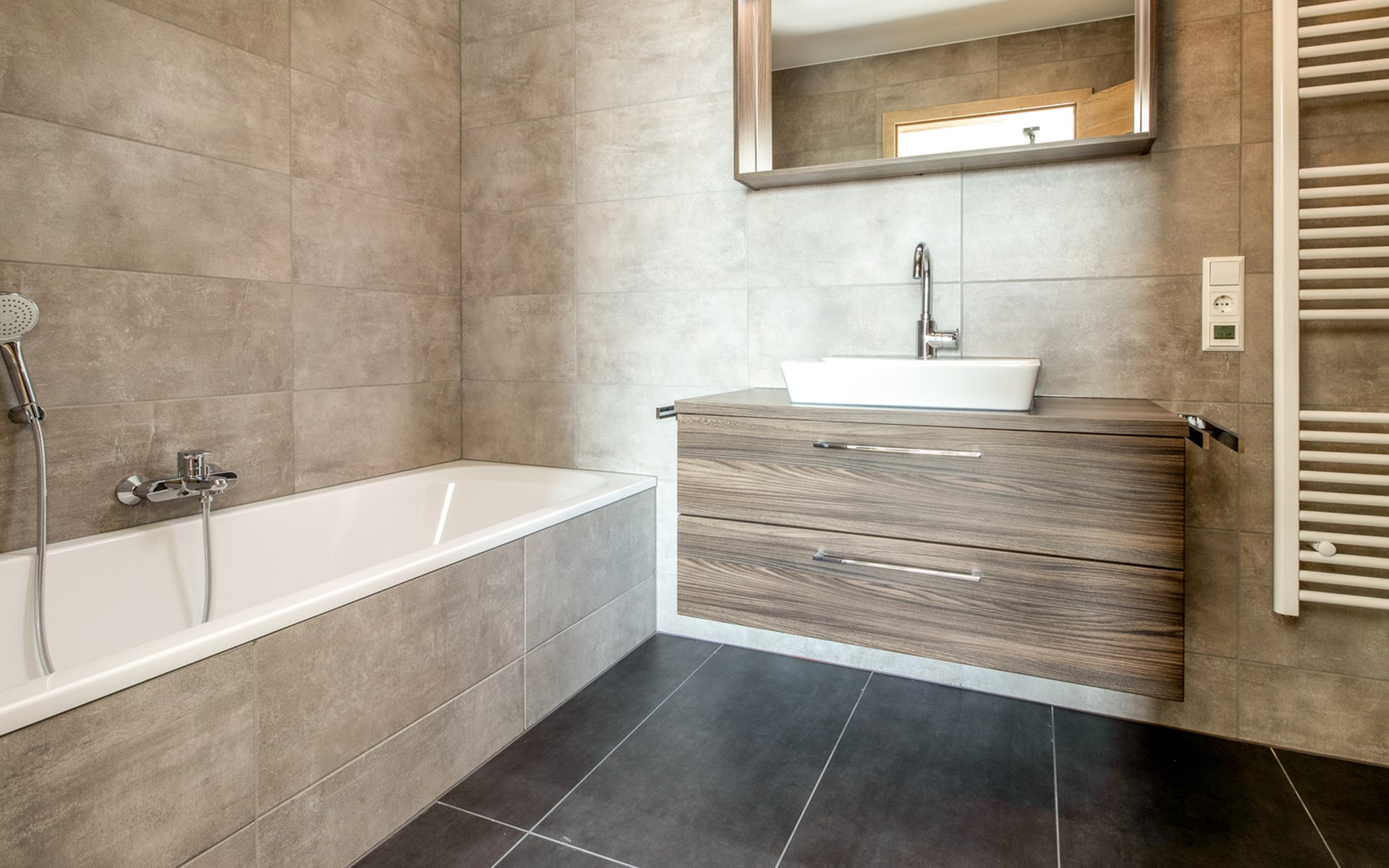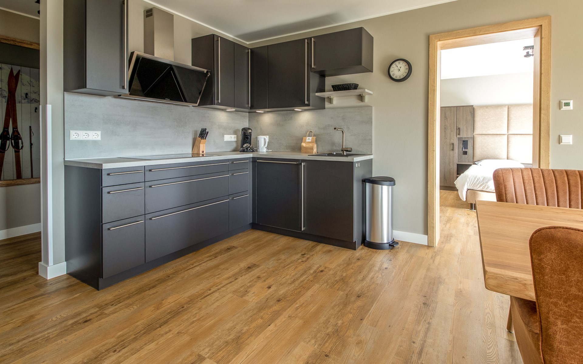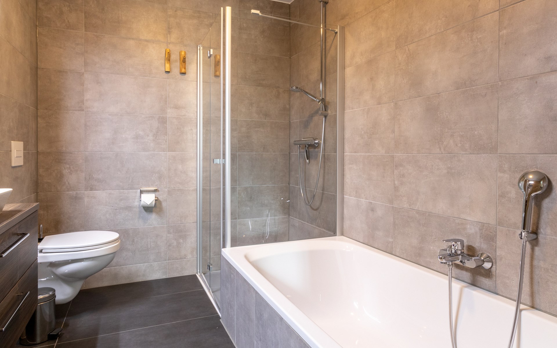 This holiday apartment with 4 rooms is suitable for 6 persons. It is spacious, light and cozy and the beautiful view from this luxurious apartment is the cherry on top. The stylish living room has a comfortable sofa and, if you book a preferred location, offers you access to either a south-facing balcony or a terrace. In the luxurious and fully equipped kitchen you will not lack anything when it comes to cooking and kitchen utensils. The three bedrooms for two persons have sufficient cupboard space. The first bedroom is furnished with a double bed, the second and a third with two single beds each. You can also relax in the bathtub in the bathroom. Both bathrooms also have a walk-in shower. Bicycles and skis can be stored in the general storage area of the building. There is also a washing machine and tumble dryer for shared use on the top floor.