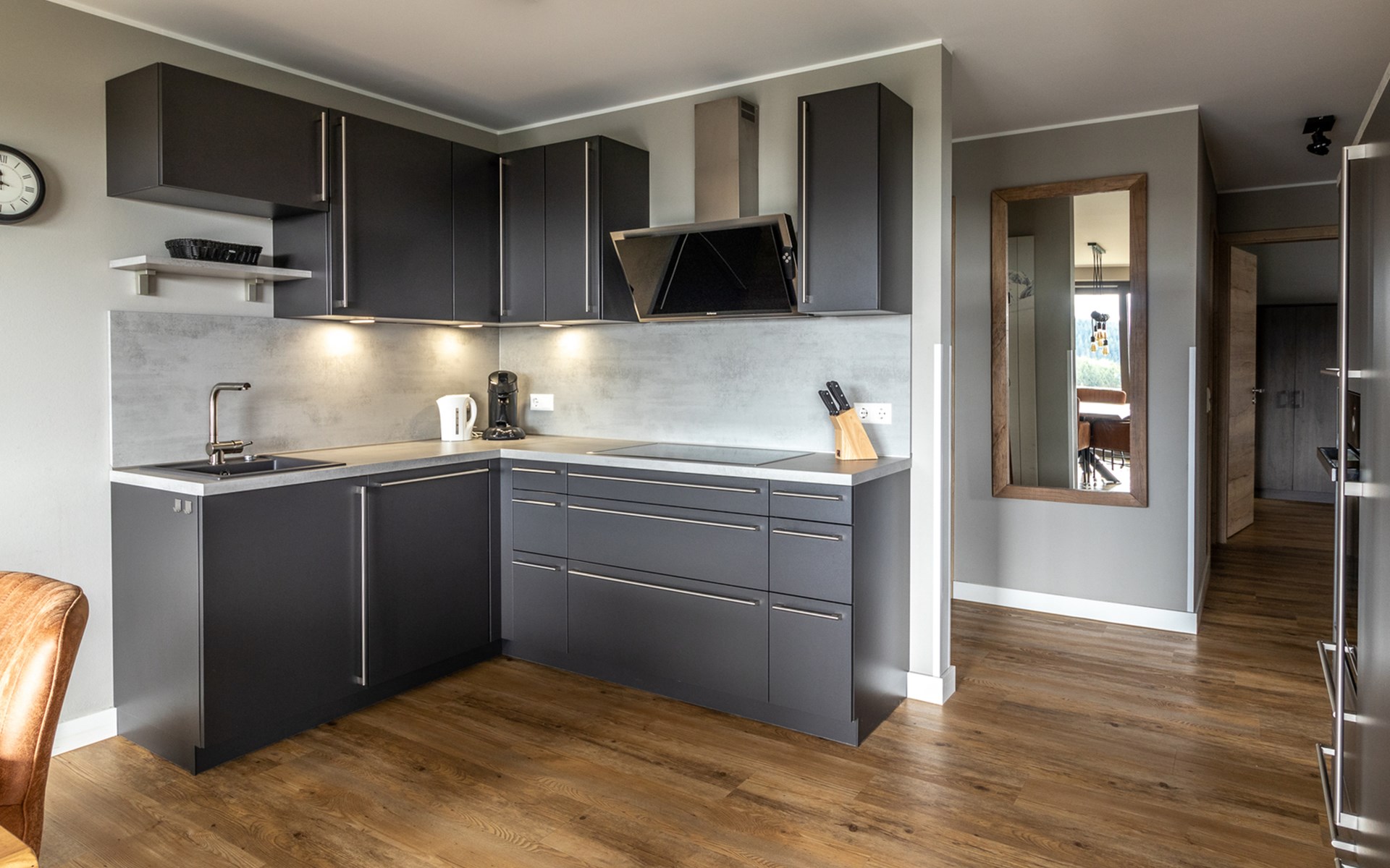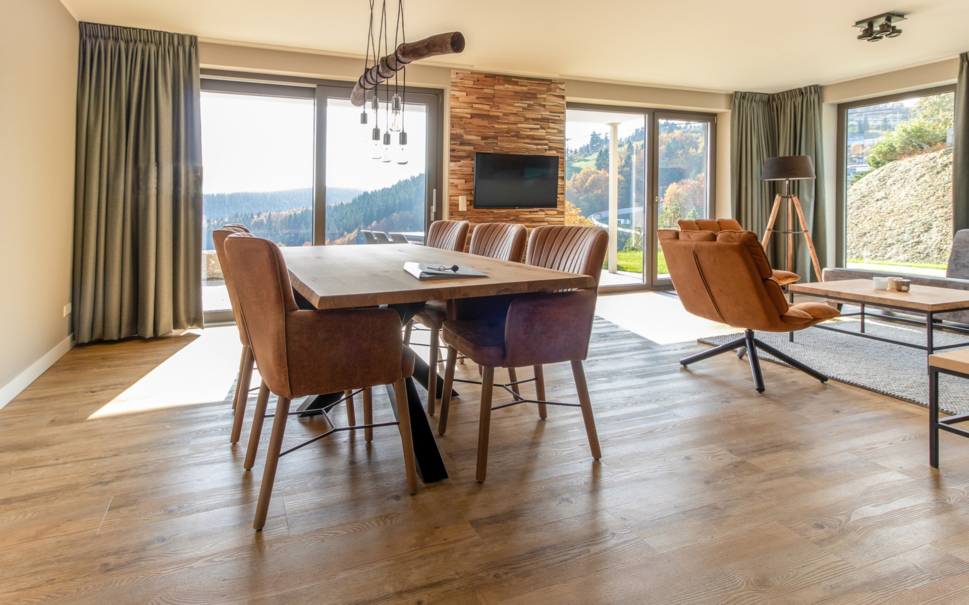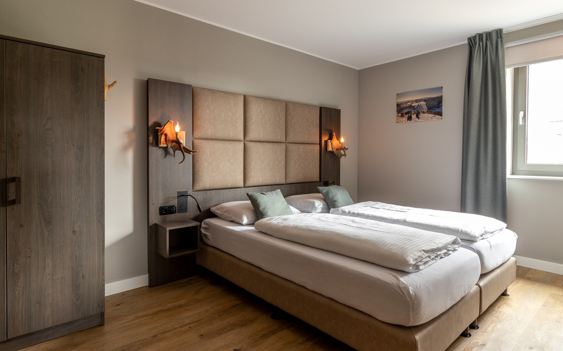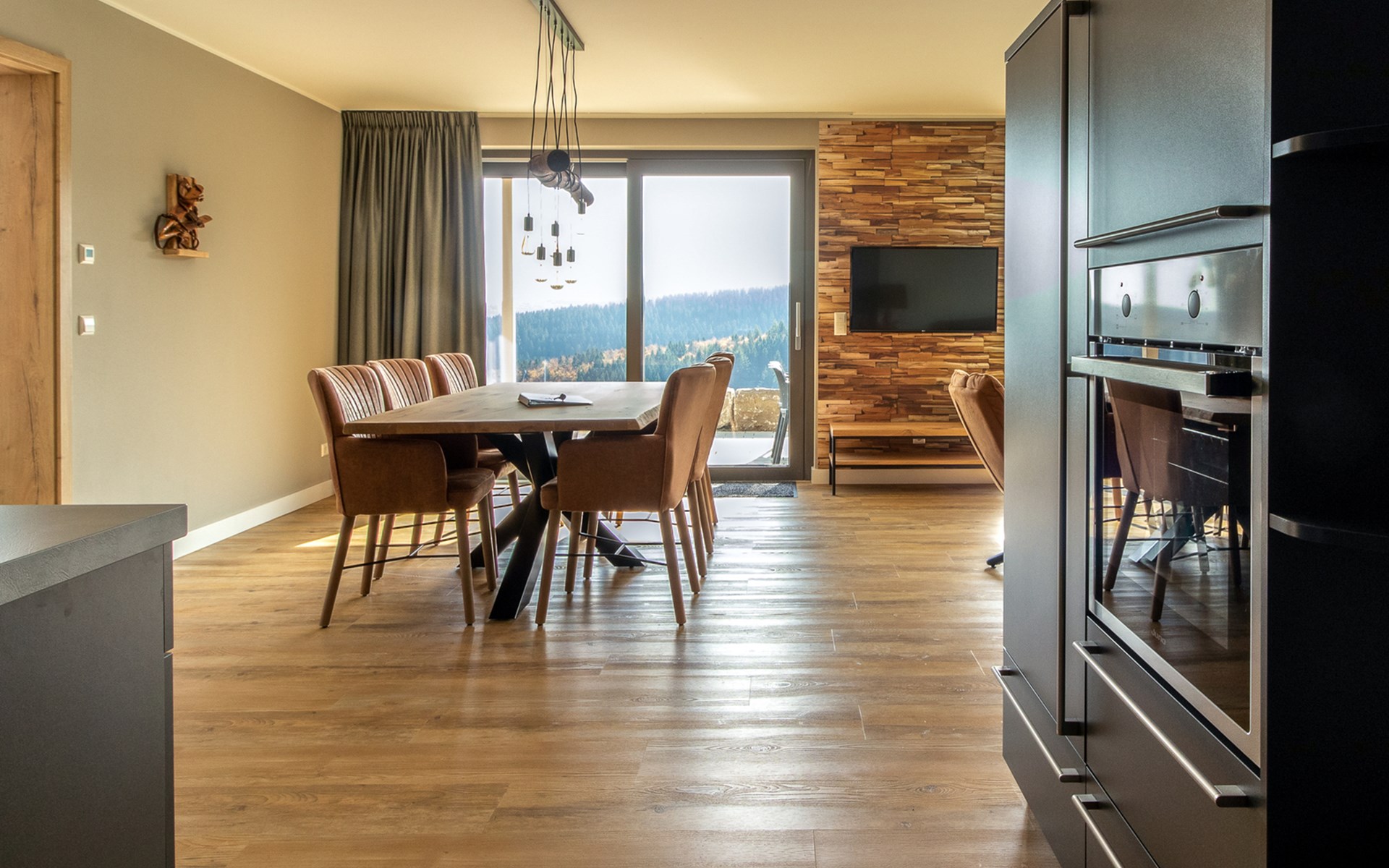 This holiday apartment with 4 rooms is suitable for 6 persons. It is spacious, light and cozy and the beautiful view from this luxurious apartment is the cherry on top. The stylish living room has a comfortable sofa and, if you book a preferred location, offers you access to either a south-facing balcony or a terrace. In the luxurious and fully equipped kitchen you will not lack anything when it comes to cooking and kitchen utensils. The three bedrooms for two persons have sufficient cupboard space. The first bedroom is furnished with a double bed, the second and a third with two single beds each. You can also relax in the bathtub in the bathroom. Both bathrooms also have a walk-in shower. Bicycles and skis can be stored in the general storage area of the building. There is also a washing machine and tumble dryer for shared use on the top floor.