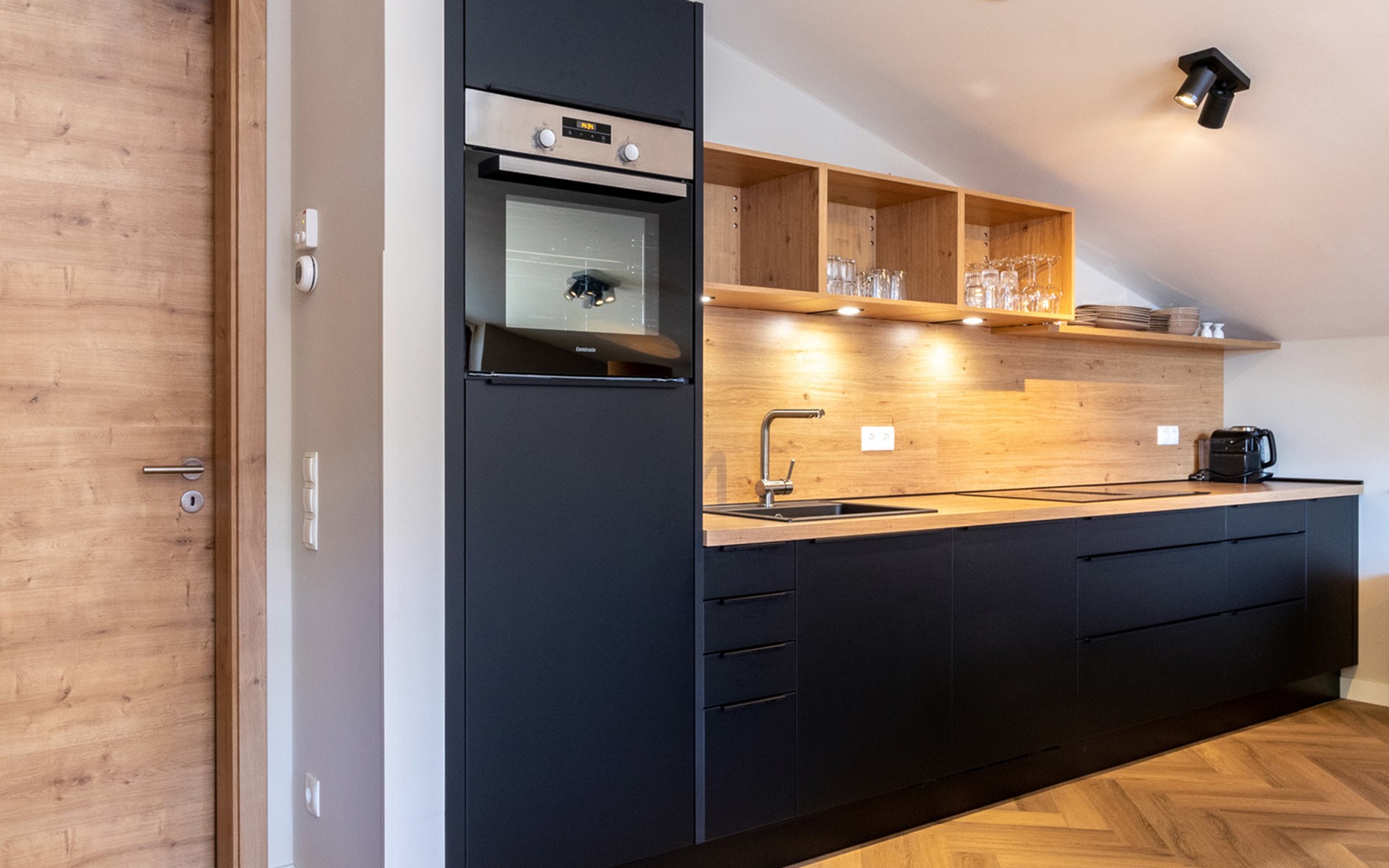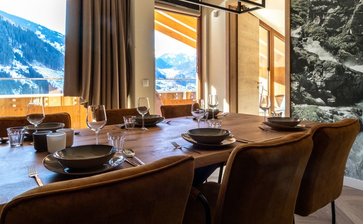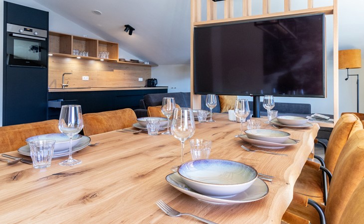 This spacious and comfortable penthouse is located on the fourth floor of UplandParc Silvretta and is characterised by its high ceiling and very large balcony with a view of the mountain landscape. You enter the penthouse through the spacious hallway, which leads into the cosy living room with modern kitchen, equipped with luxury appliances. Next to the seating area is the dining table for 6 people. You can enjoy the impressive panoramic view through the large windows or step out onto the large balcony.