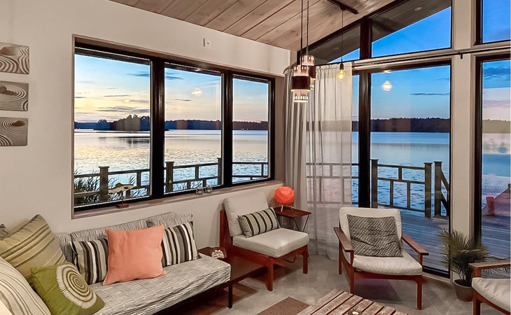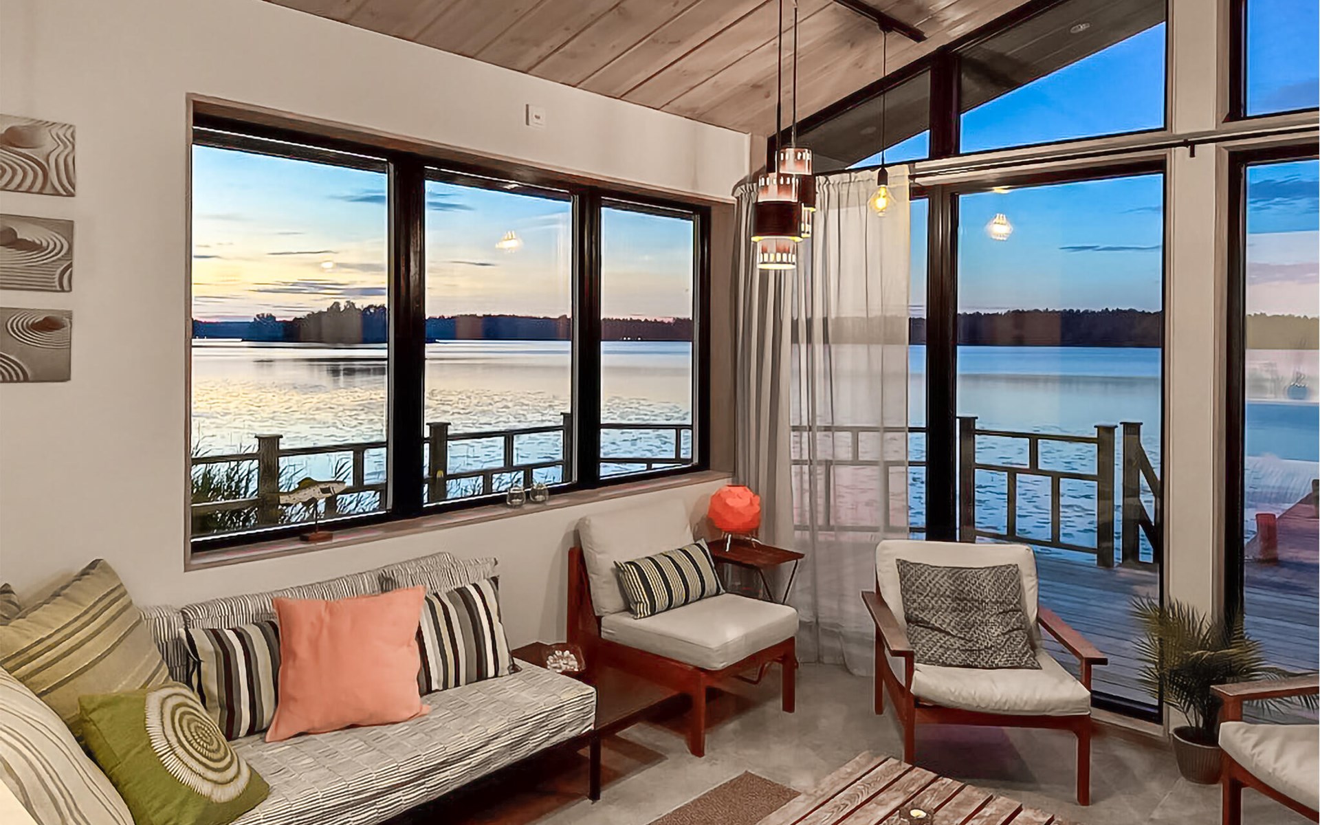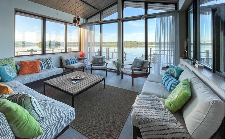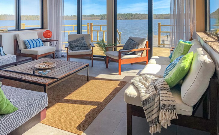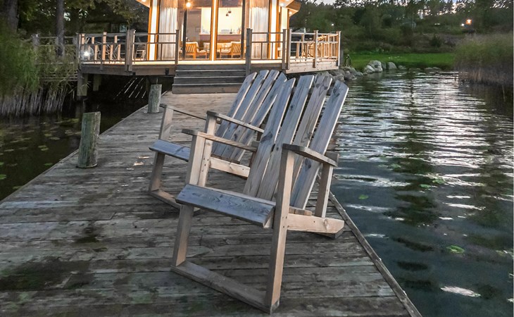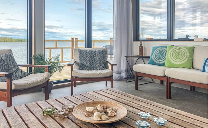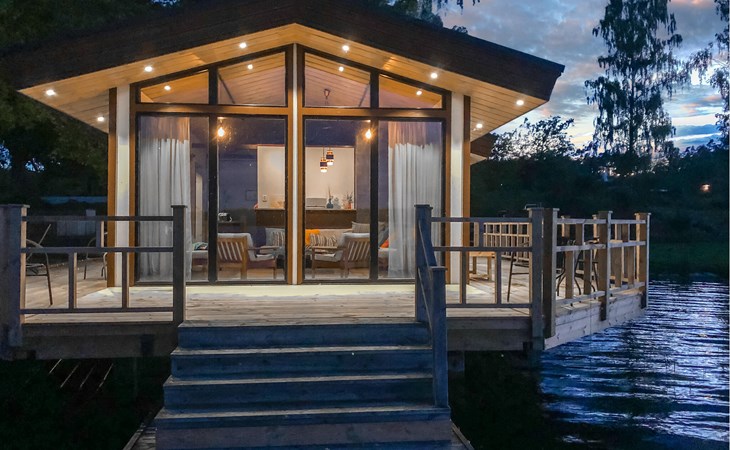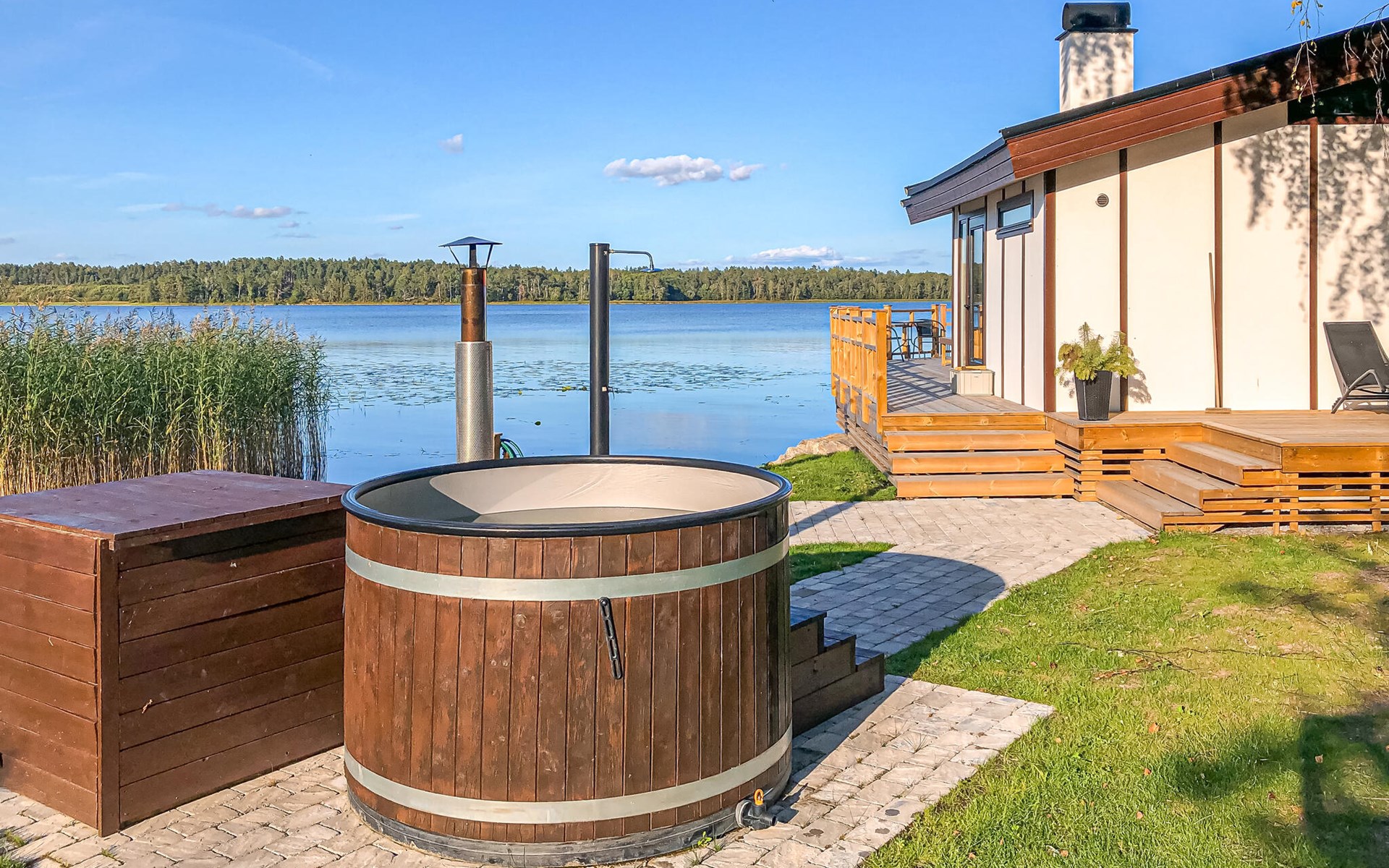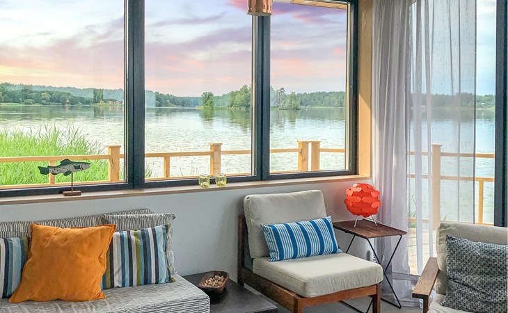 The house was designed by the well-known Danish architect Ole Helweg. It is located on Aspön and on the beach of Mälaren, between Strängnös and Enköping. You can reach the house by car. Large terrace with open fireplace. In the kitchen there are two dishwashers, two refrigerators with freezer compartment, charcoal grill and dining area. Large work surface and bar with bar stools to the open kitchen with a view of the lake. Massage tub in the bathroom. The large balconies are under roof and face south towards the lake. The large wooden deck connects the house with the lake cabin. Wood-fired sauna in the cabin by the lake and space to relax (there is also a fridge in the cabin). There is also a private jetty for swimming and a rowing boat. You can hire a motor from the owner on request. Free fishing in the lake. There is a ramp on the property that you can use to easily bring your boat from the trailer into the water and back. You live secluded and at the end of the beach promenade and surrounded by hills with oak forest. You can reach the sights of Stockholm in an hour. It is 45 km to the zoo in Eskilstuna and 35 km to picturesque Mariefred. The medieval Gripsholm Castle is also located here. From 2019 there will be a wood-fired palju and an outdoor shower by the sauna hut.