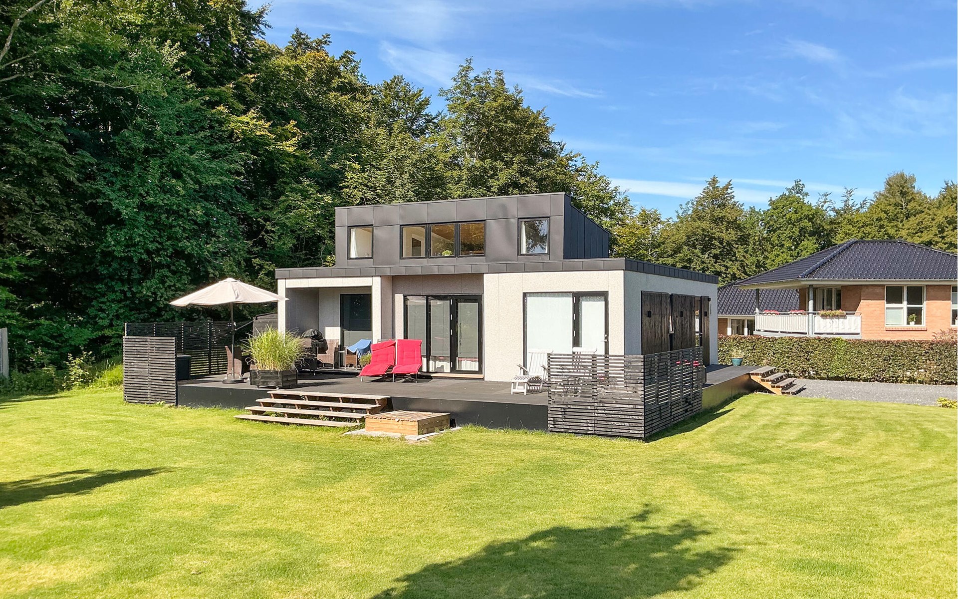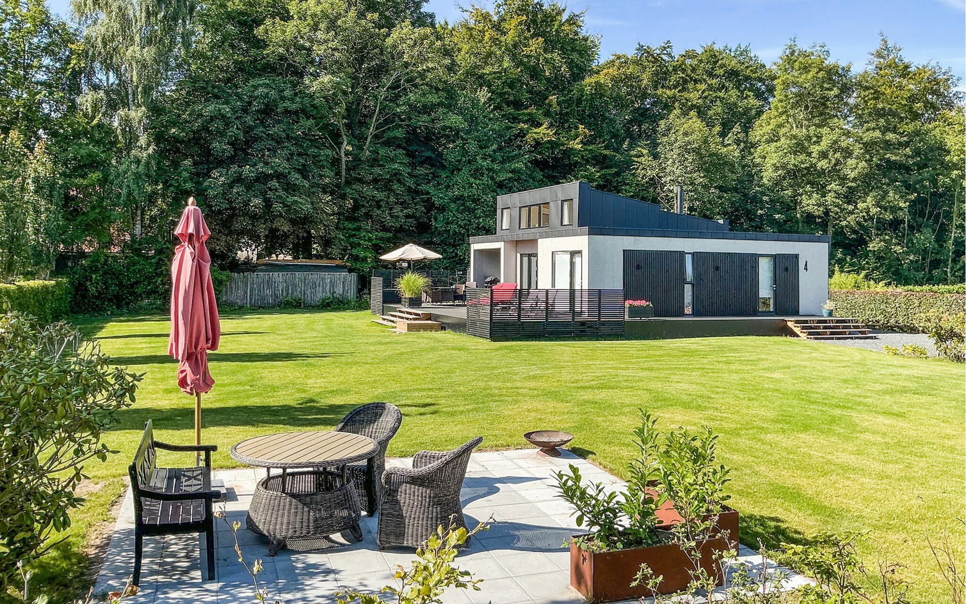 Step inside and enjoy the open-plan design over two levels, which creates a generous feeling of space, complemented by high-quality and tasteful furnishings. In the living area, a stylish wood-burning stove provides cosy warmth and cosy hours. Large windows let in plenty of natural light and offer you a beautiful view of the extensive garden. The large terrace invites you to enjoy the fresh sea breeze, while the beach is just a short walk away.