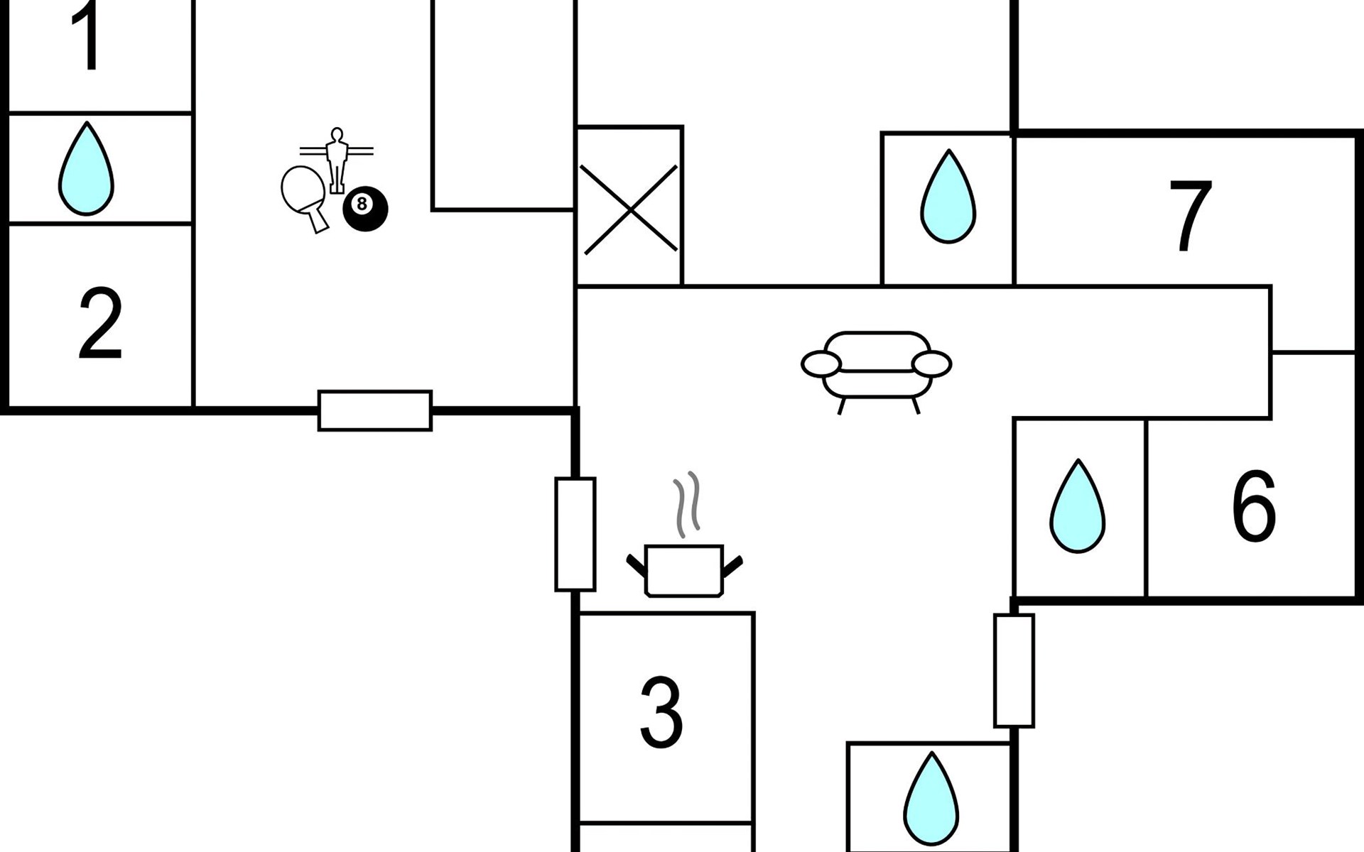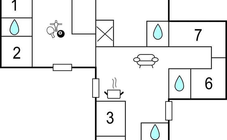 Inside the spacious and well-equipped vacation home you will find 7 bedrooms, 4 bathrooms, a kitchen and a nice living area as well as an activity room to keep you entertained. Children will love the open loft where they can play undisturbed. With various games, activities and internet, even rainy days will not be boring.