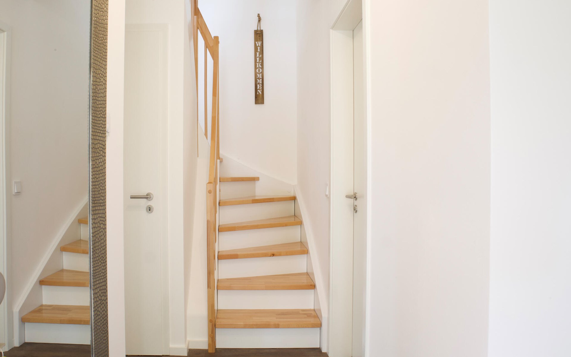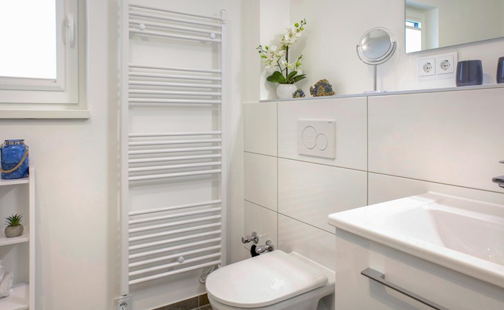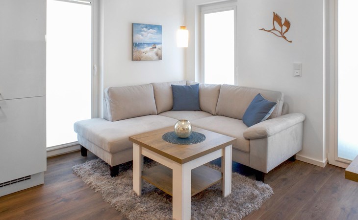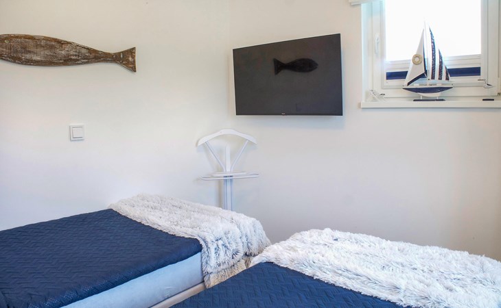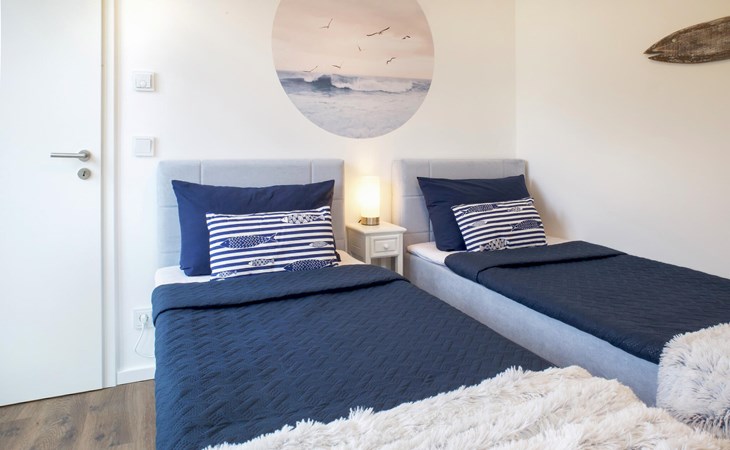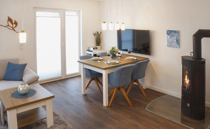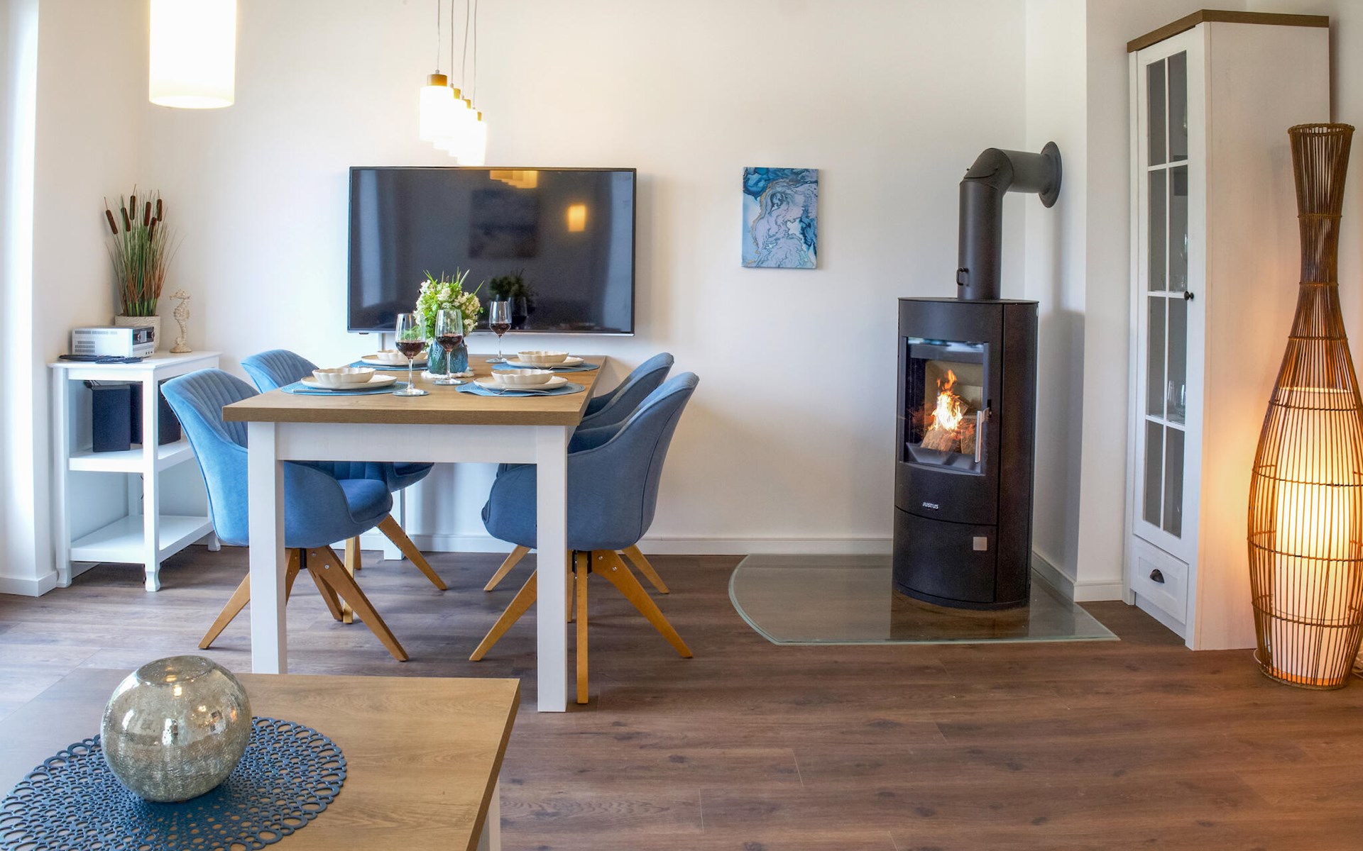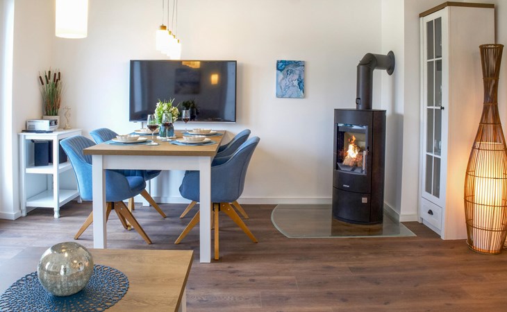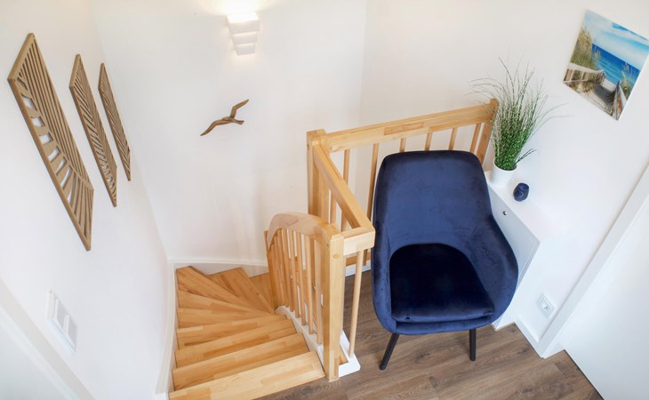 Your house extends over two floors. On the ground floor there is an open, cosy living area with adjoining garden terrace and a modern fitted kitchen, which invites you to linger thanks to the floor-to-ceiling windows. On cold days, you can cosy up in front of the built-in fireplace. Next to the living area is a bright bathroom with shower cubicle and infrared sauna. A curved staircase leads from the ground floor to the upper floor of the semi-detached house, where two spacious bedrooms await you. For a good night's sleep and your comfort, you will find blackout blinds and insect screens on the windows throughout the house. For a restful night's sleep and your comfort, you will find pleated blinds throughout the house, including blackout blinds on the upper floor, and insect screens on the windows. Enjoy the beautiful North Sea air from the wrap-around balcony, which is accessible from both bedrooms. High-quality furniture and a successful room layout make this holiday home a dream holiday home.