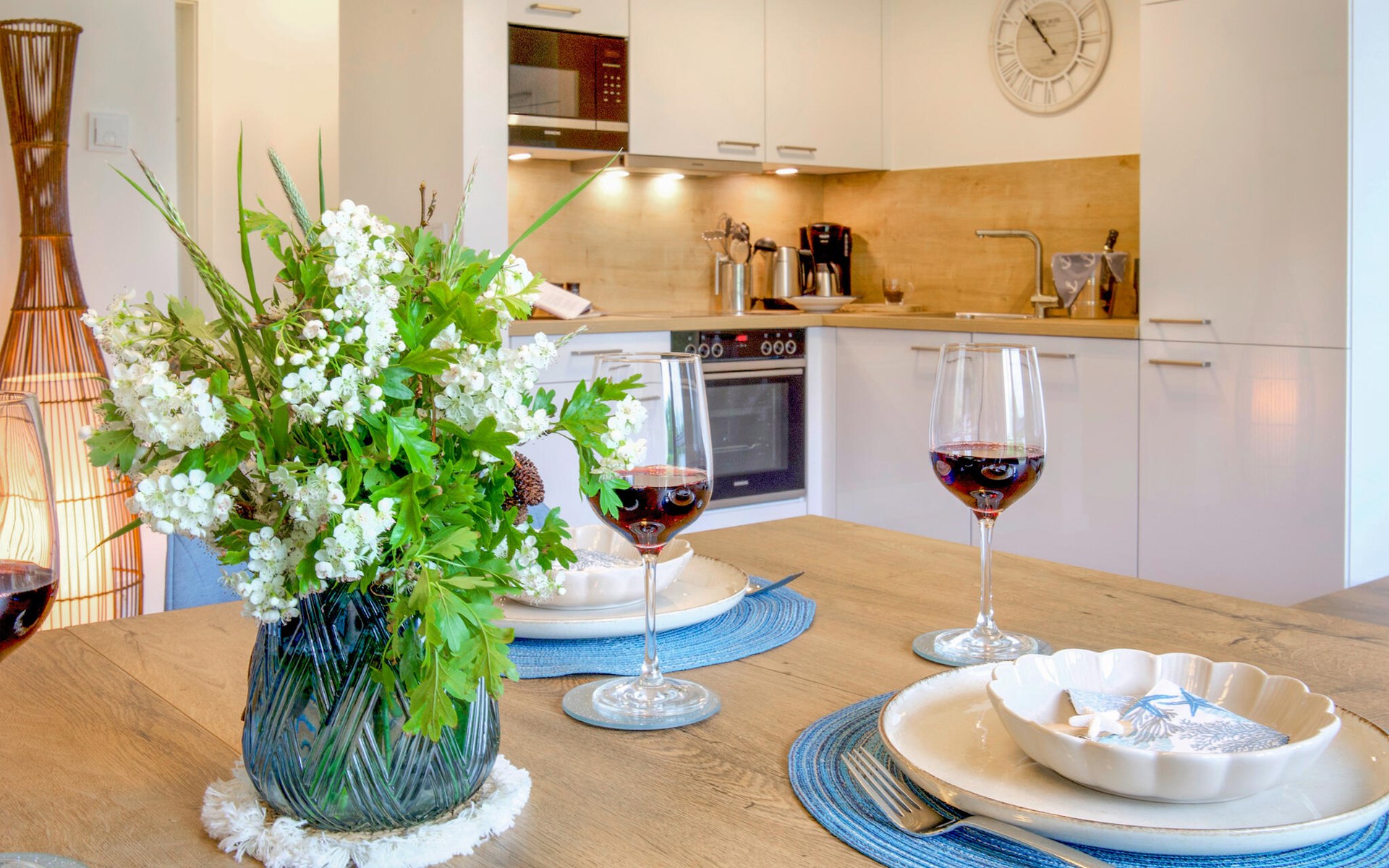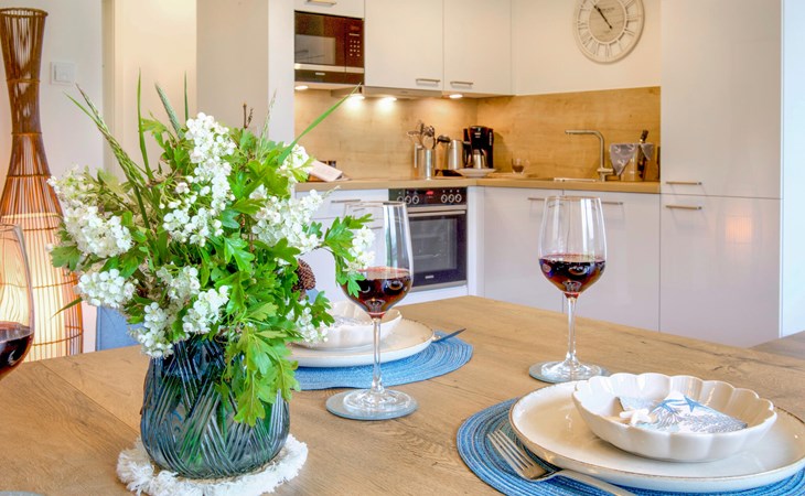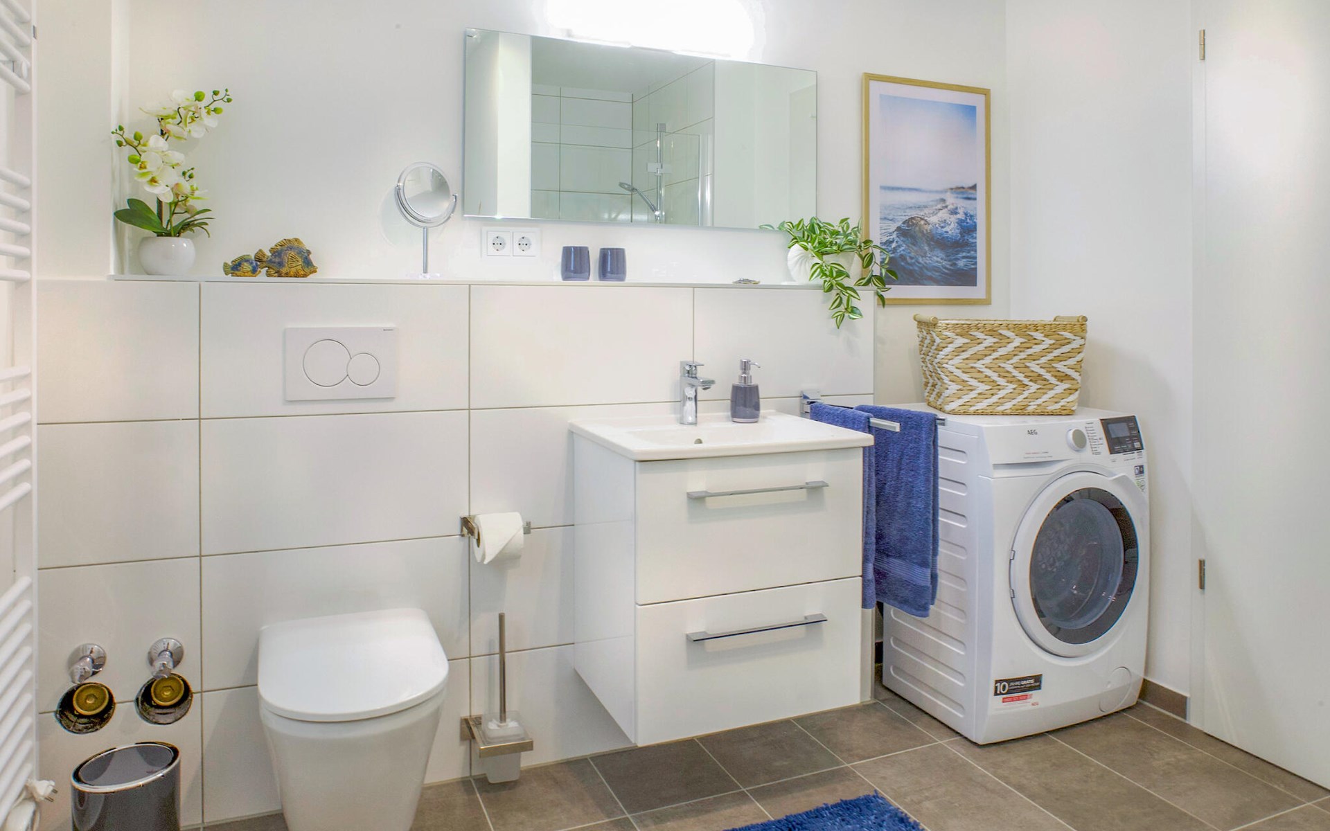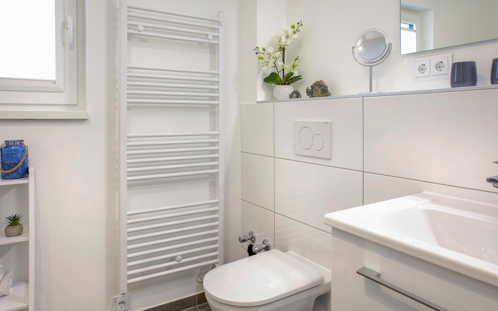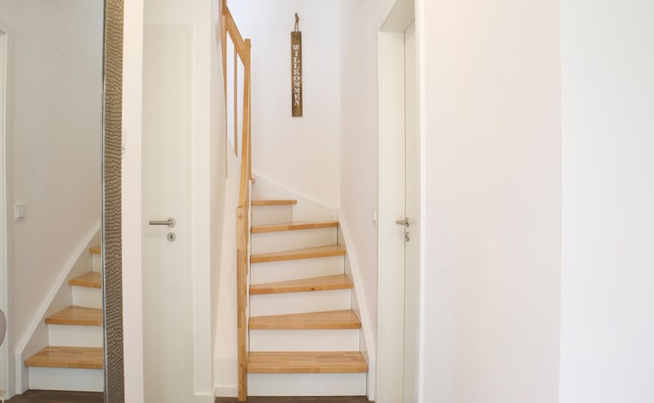 Your house extends over two floors. On the ground floor there is an open, cosy living area with adjoining garden terrace and a modern fitted kitchen, which invites you to linger thanks to the floor-to-ceiling windows. On cold days, you can cosy up in front of the built-in fireplace. Next to the living area is a bright bathroom with shower cubicle and infrared sauna. A curved staircase leads from the ground floor to the upper floor of the semi-detached house, where two spacious bedrooms await you. For a good night's sleep and your comfort, you will find blackout blinds and insect screens on the windows throughout the house. For a restful night's sleep and your comfort, you will find pleated blinds throughout the house, including blackout blinds on the upper floor, and insect screens on the windows. Enjoy the beautiful North Sea air from the wrap-around balcony, which is accessible from both bedrooms. High-quality furniture and a successful room layout make this holiday home a dream holiday home.