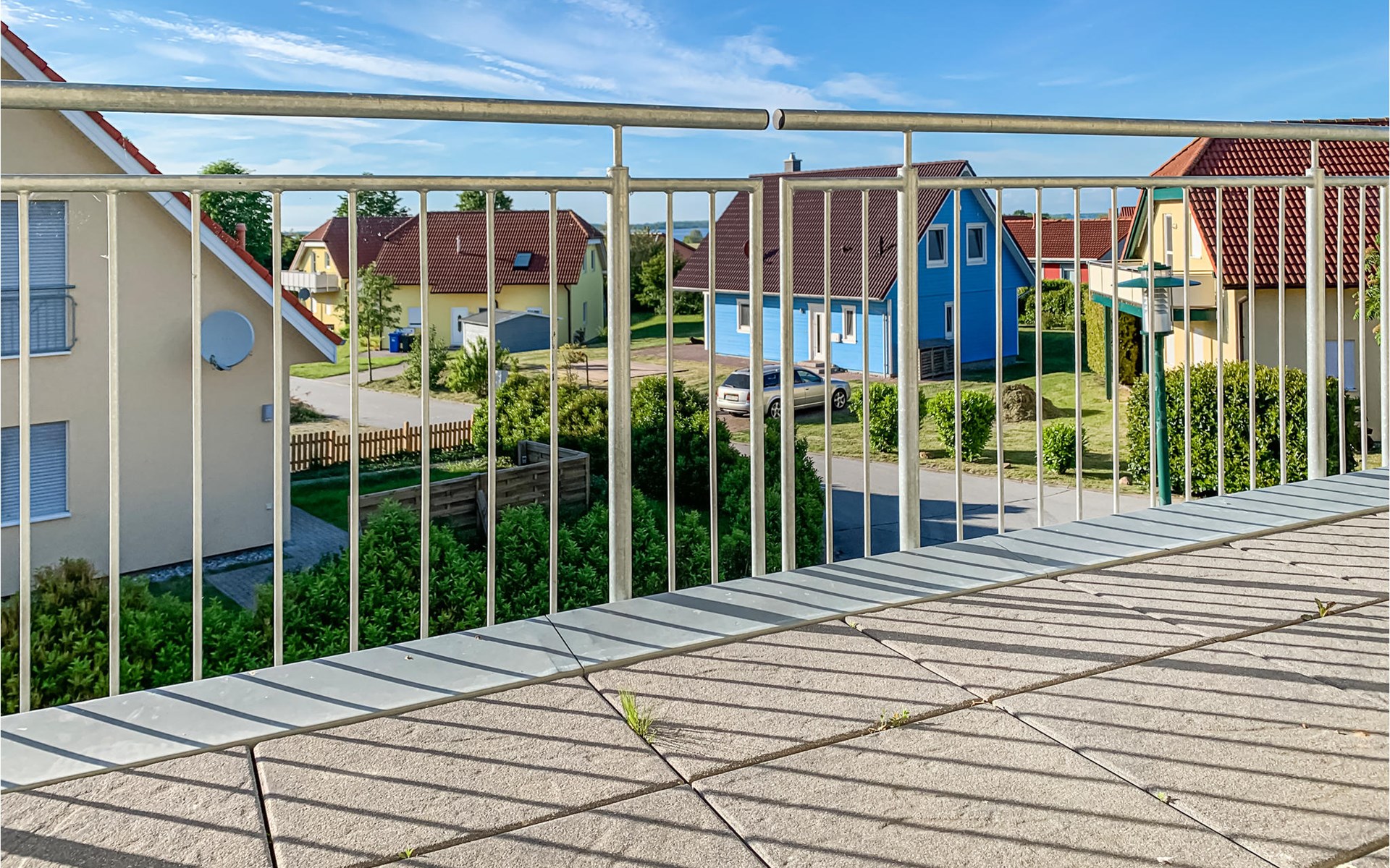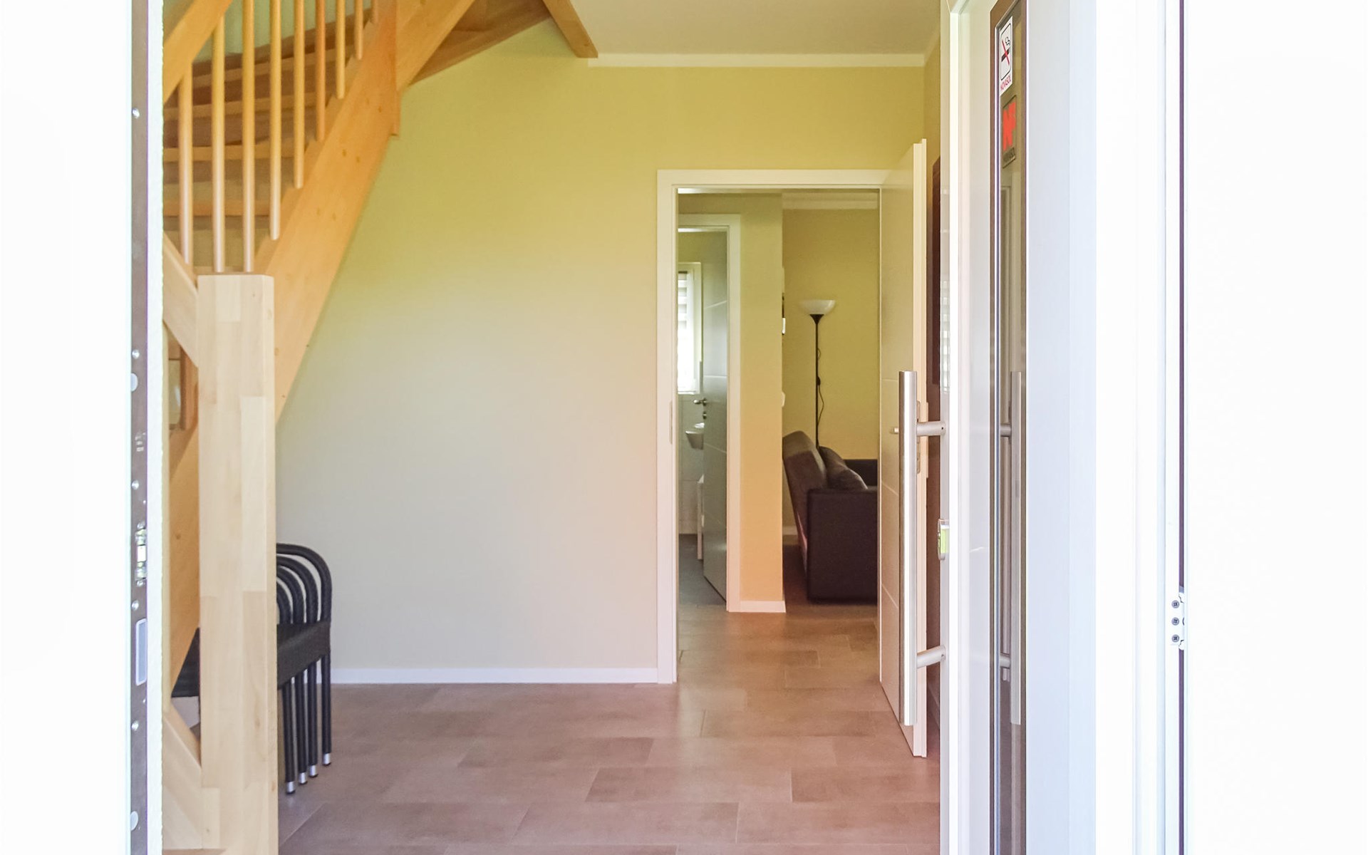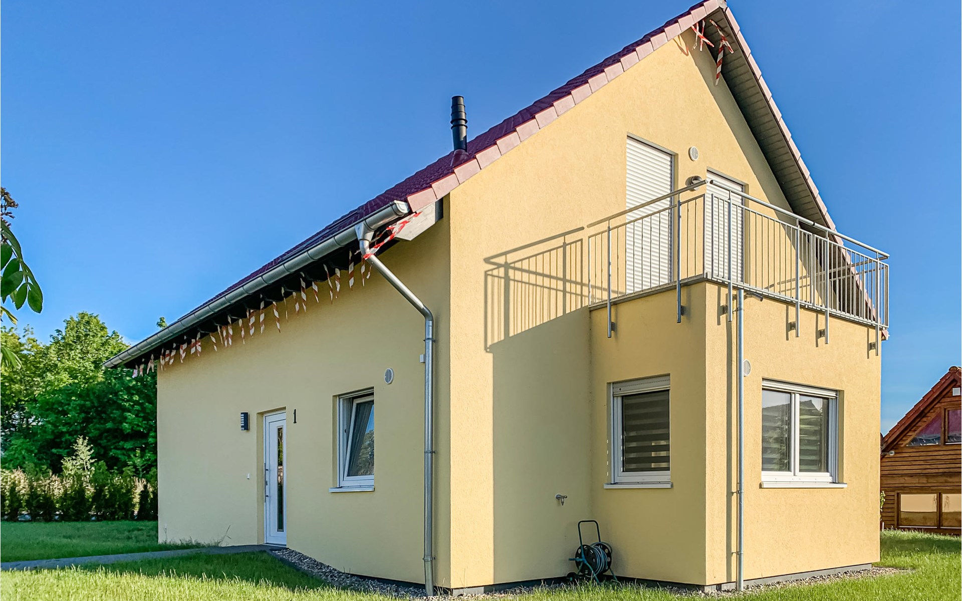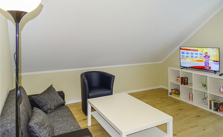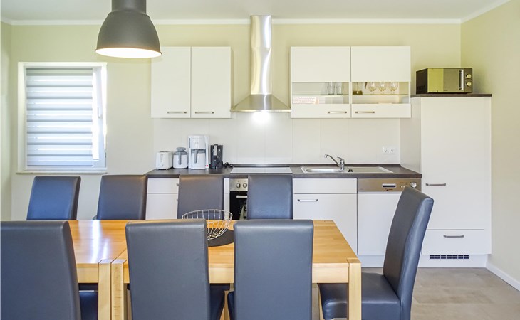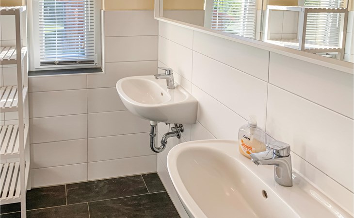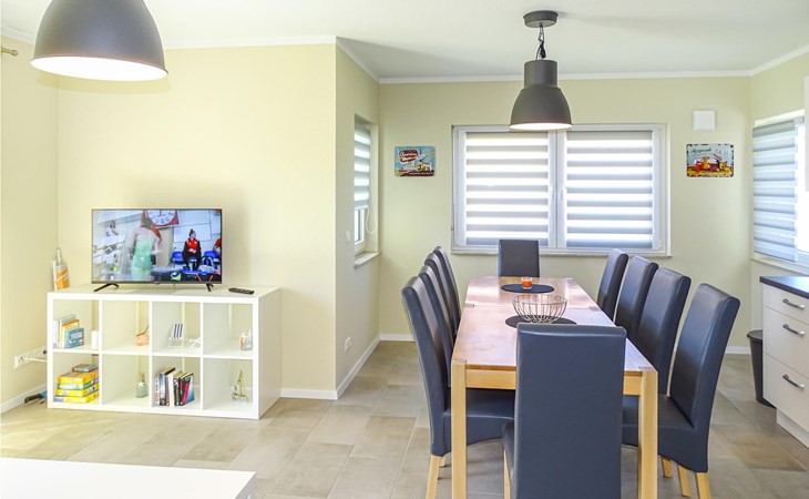 The house was built in 2020 and is modernly furnished. From the hallway you reach the HWR with washing machine, the lower living area or via the wide staircase to the OG. You will find on the 1st floor two bedrooms, a floor-level shower room and a spacious living room with integrated kitchen, dining area and high-quality sofa bed. On the ground floor you have another floor-level shower room as well as two separate bedrooms and the spacious living area with integrated kitchen and dining area. You have a barbecue terrace and sufficient lawn as a play area in addition to your balcony overlooking the water below in front of the house. There are two parking spaces next to the house.