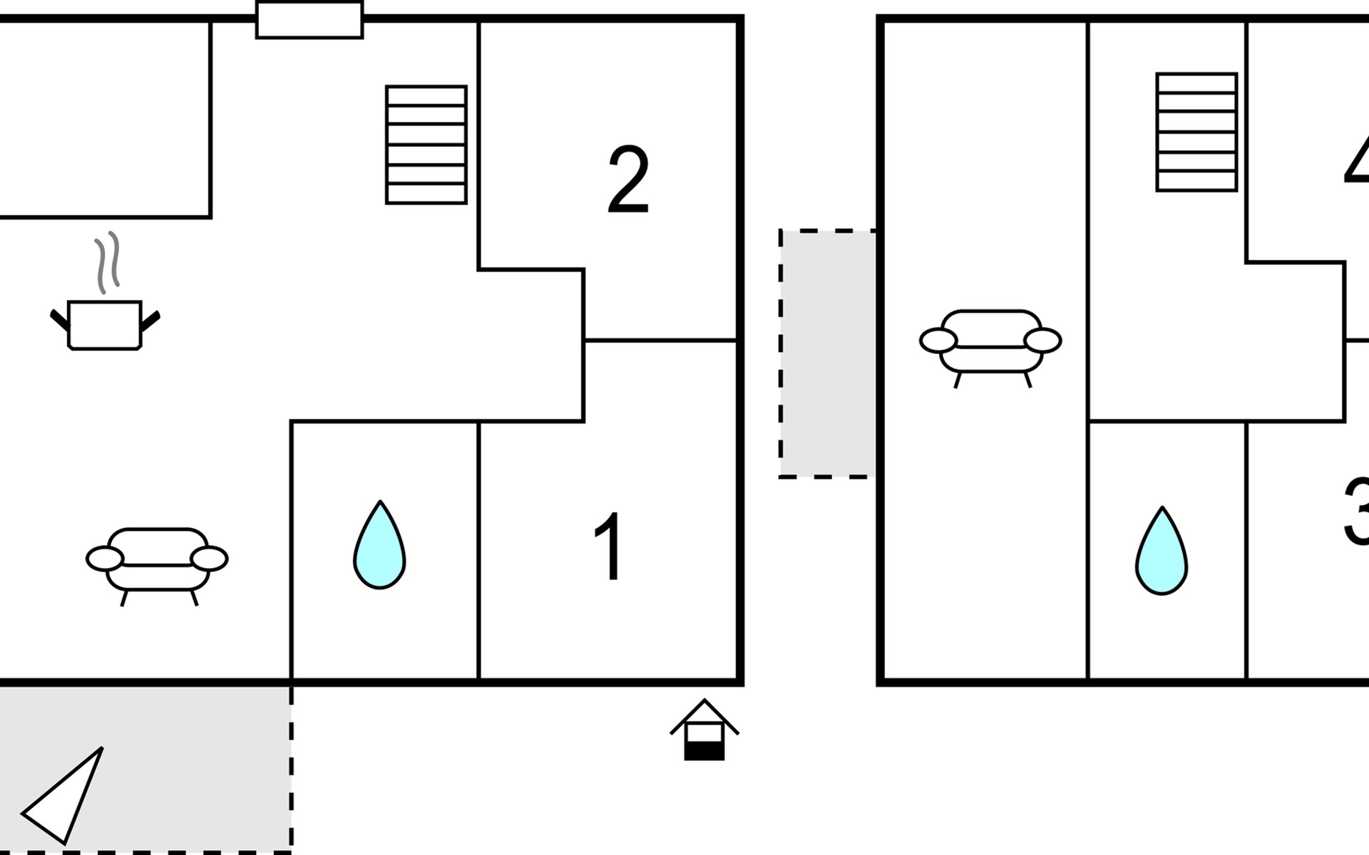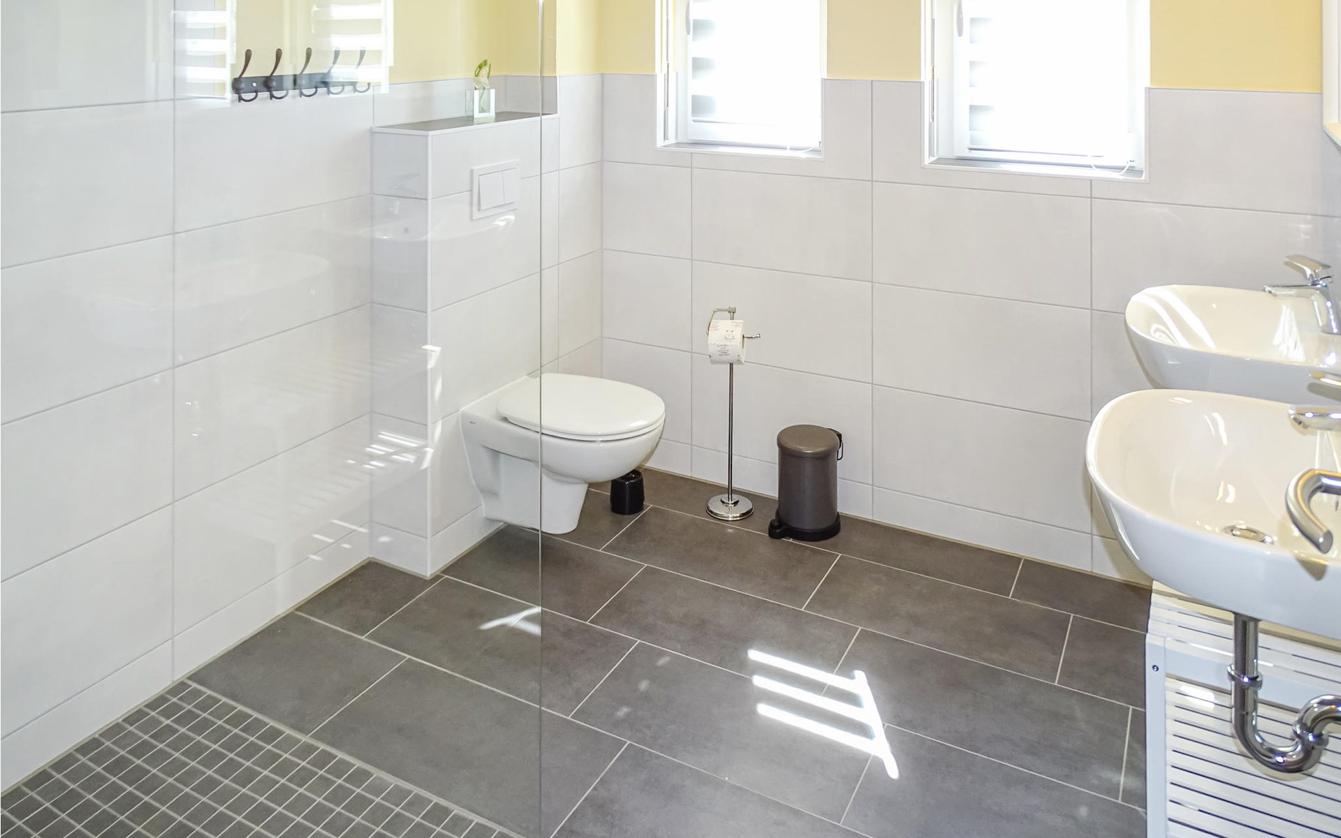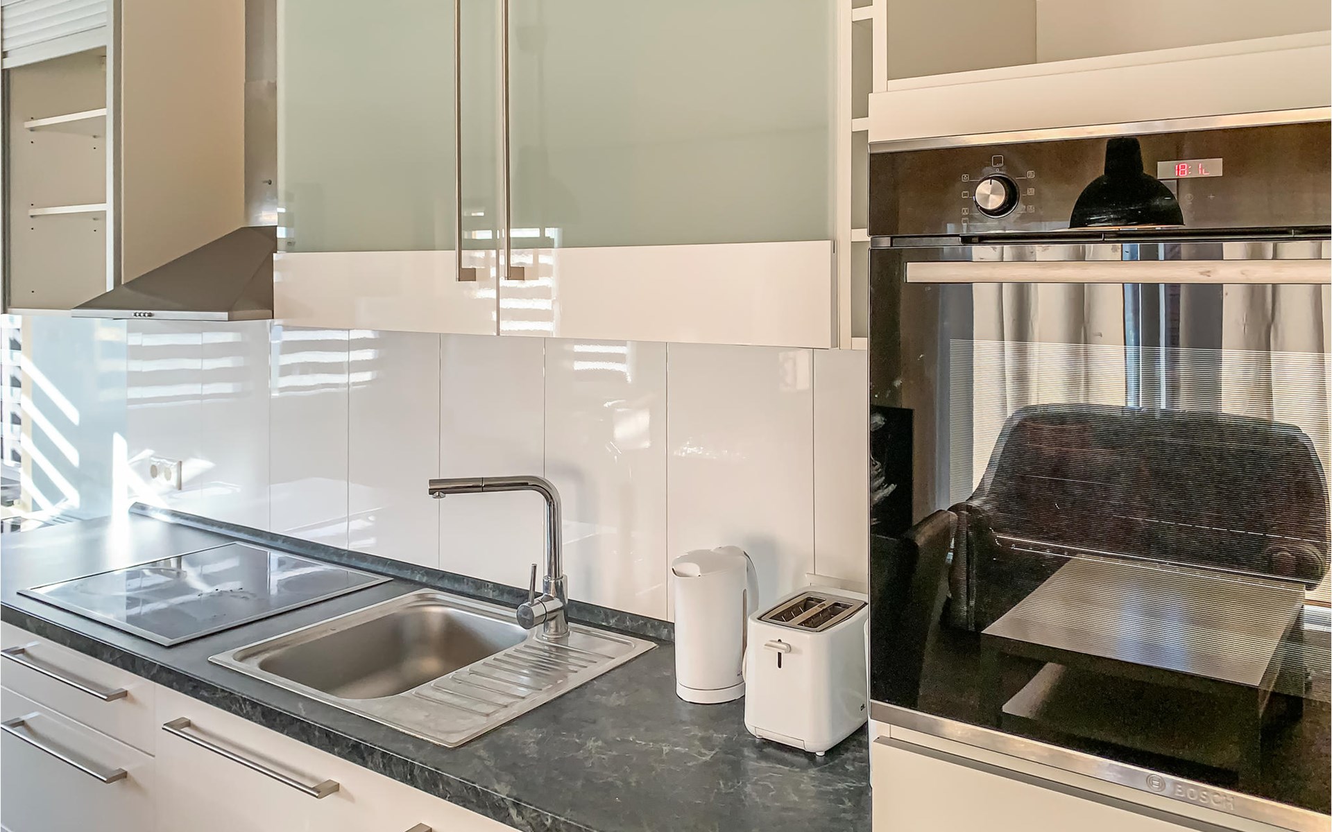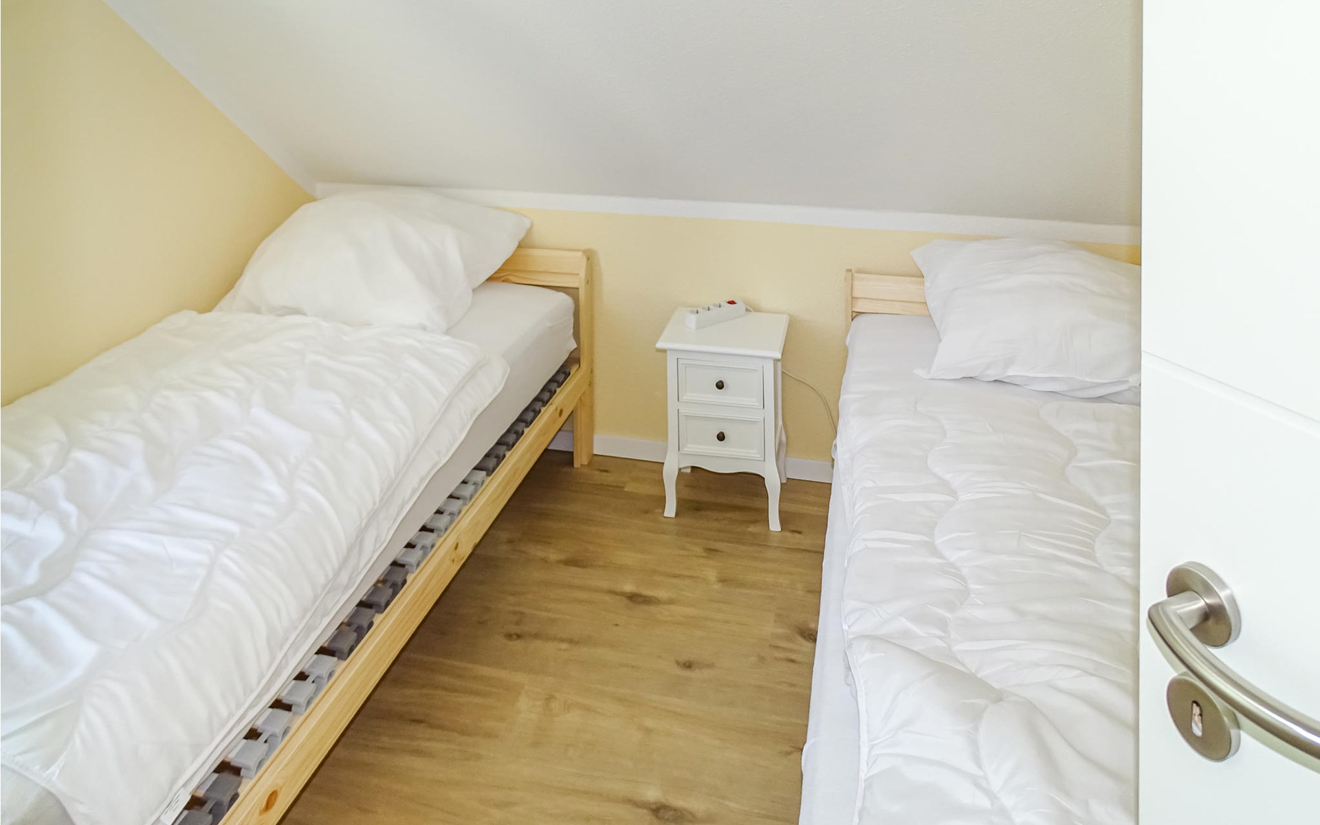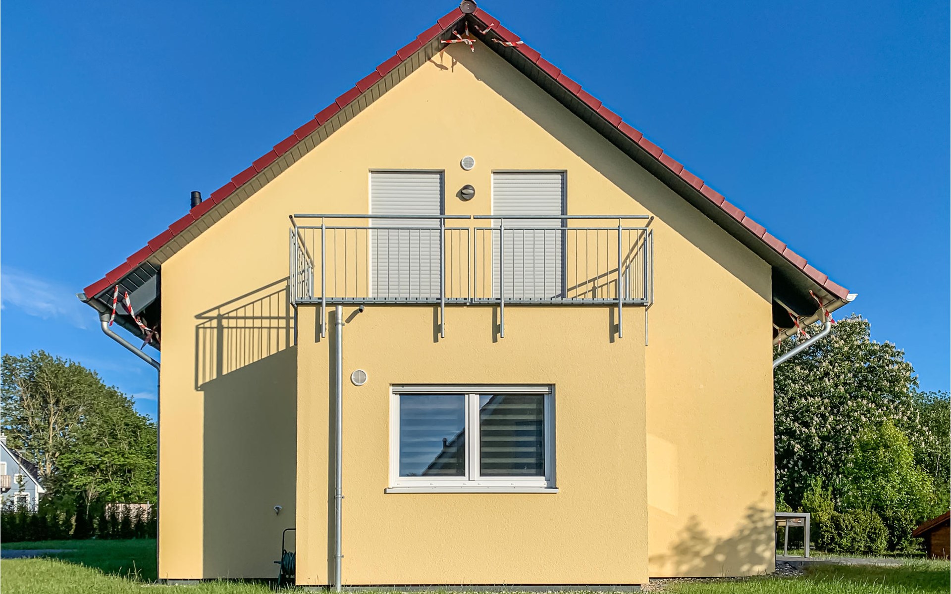 The house was built in 2020 and is modernly furnished. From the hallway you reach the HWR with washing machine, the lower living area or via the wide staircase to the OG. You will find on the 1st floor two bedrooms, a floor-level shower room and a spacious living room with integrated kitchen, dining area and high-quality sofa bed. On the ground floor you have another floor-level shower room as well as two separate bedrooms and the spacious living area with integrated kitchen and dining area. You have a barbecue terrace and sufficient lawn as a play area in addition to your balcony overlooking the water below in front of the house. There are two parking spaces next to the house.