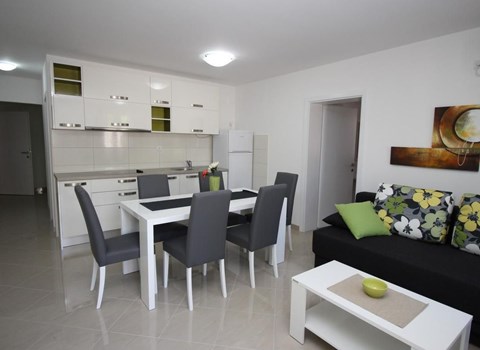 This spacious and modern vacation apartment is located on the fifth and last floor of a residential building and is well suited for two couples. The apartment consists of two bedrooms with double beds and a living room, kitchen, dining room and bathroom. The apartment offers a partial view of the sea and the city.