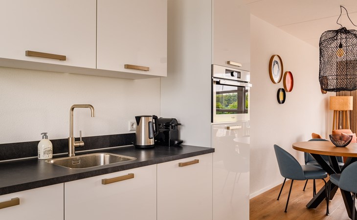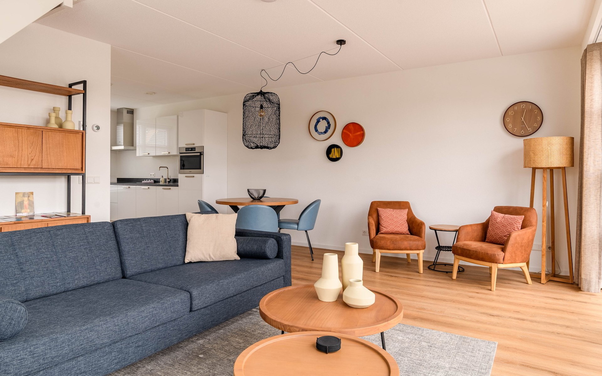 The cozy living room has a comfortable seating area with a television and a dining area. The open kitchen is fully equipped, including a combi-oven, dishwasher, Nespresso machine, refrigerator and freezer.