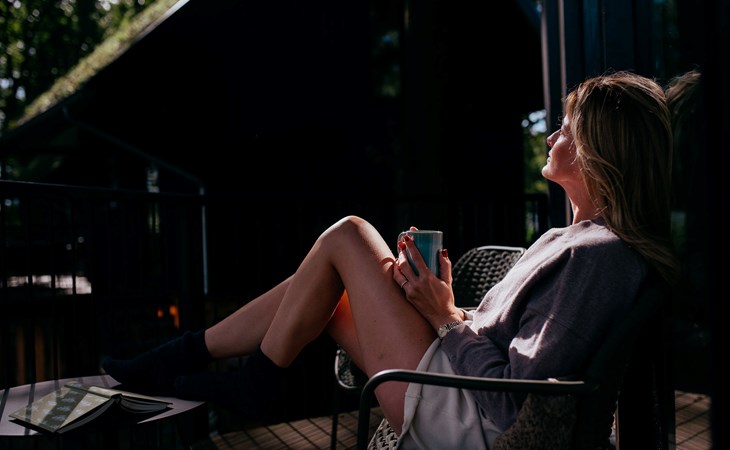 Outside, enjoy the natural surroundings from the elevated terrace deck, where you can relax in the fresh air. The private hot tub makes your stay even more relaxing. When you walk down the stairs, you’ll reach the landscaped garden that completes the outdoor experience. And as the icing on the cake, a luxurious sauna awaits you in a stunning location surrounded by nature.