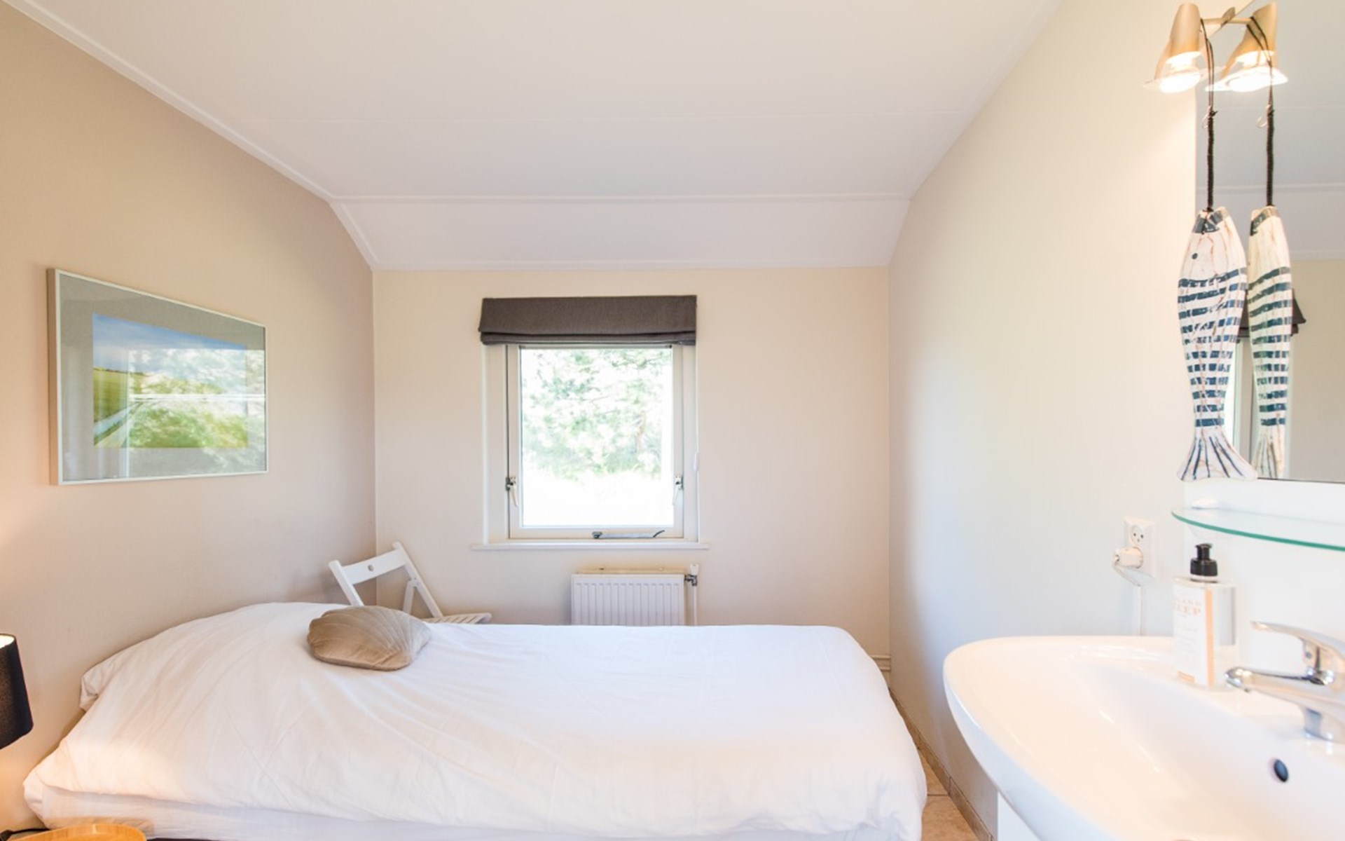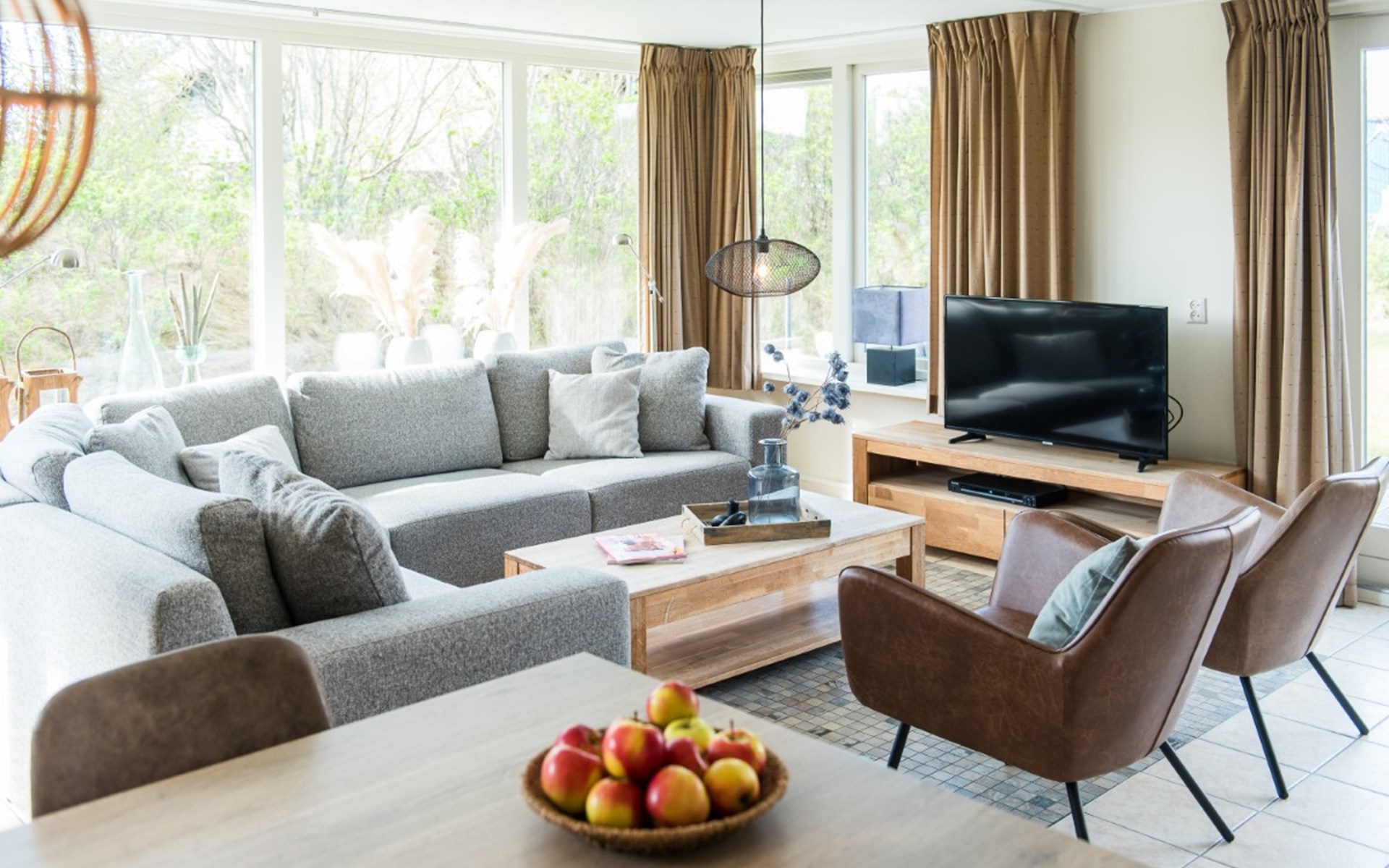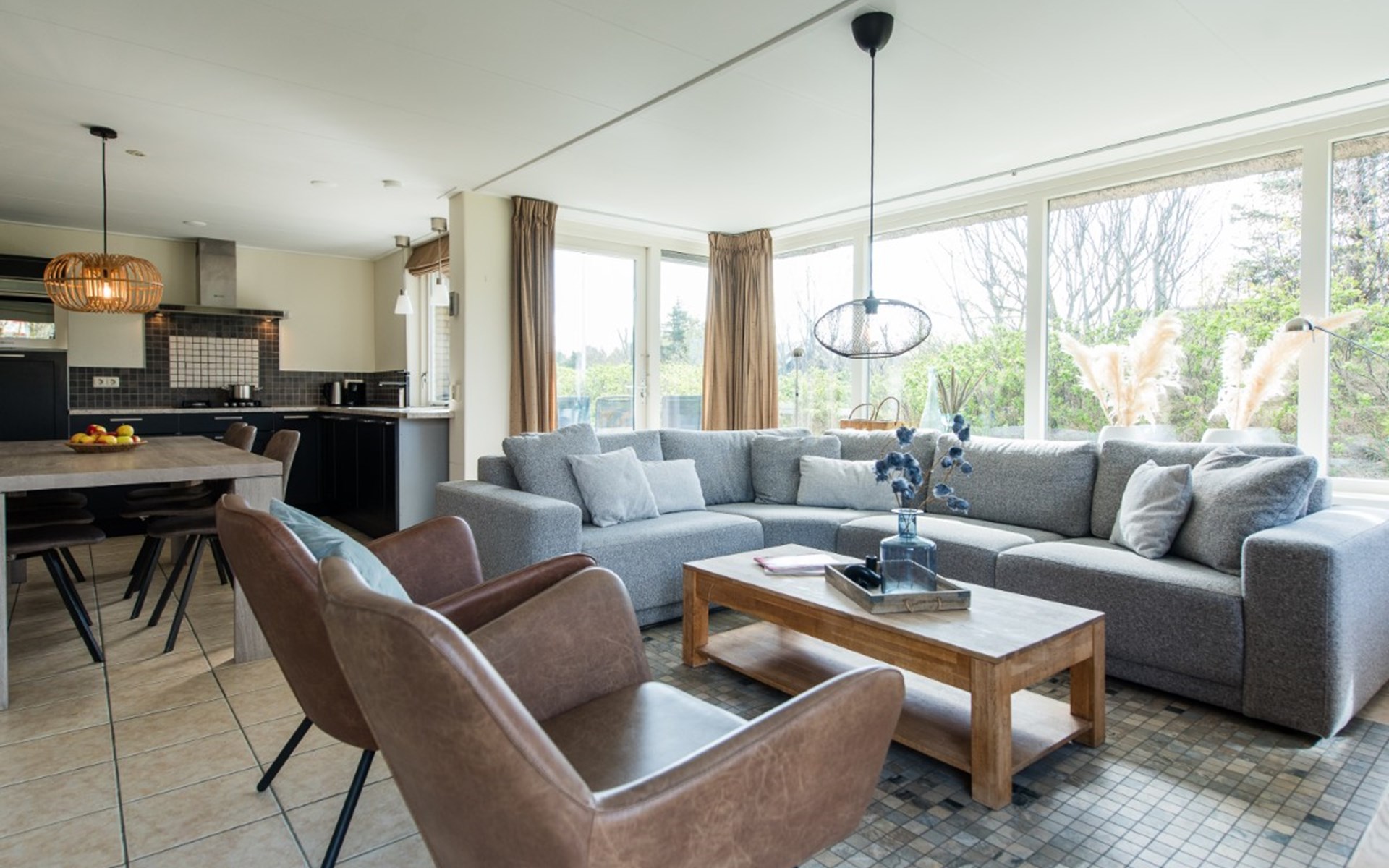 The entire house is on one level. Living room with dining table, sitting area and TV with DVD player. Open kitchen with, among other things, a fridge with a freezer compartment, a dishwasher and an oven (there is also a microwave in the pantry).