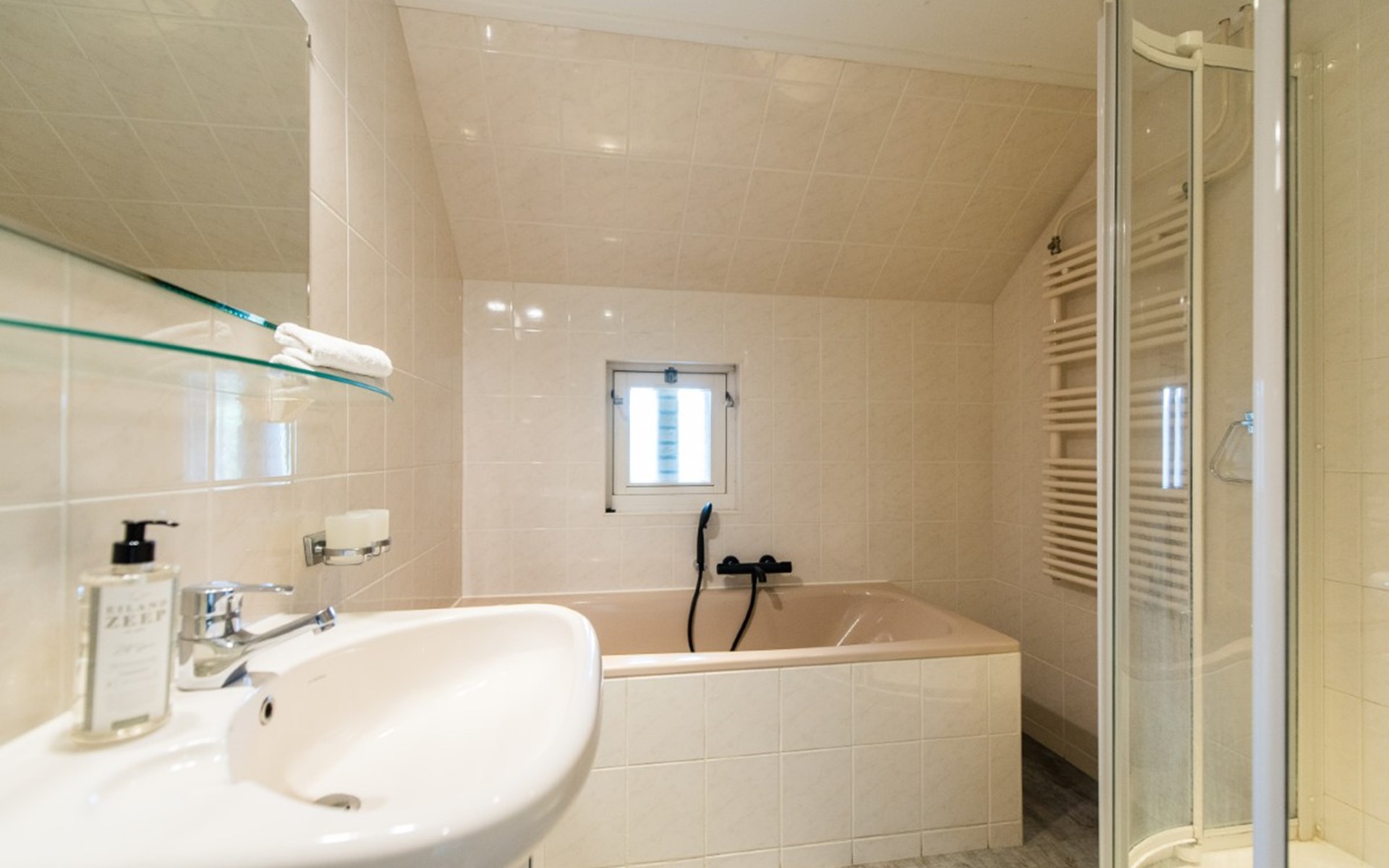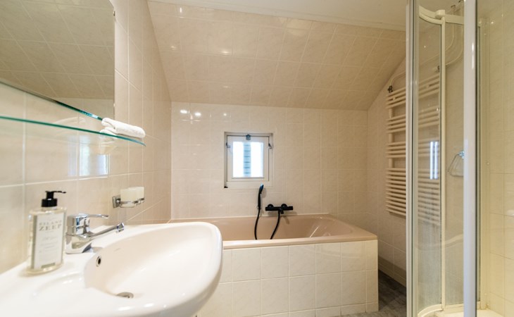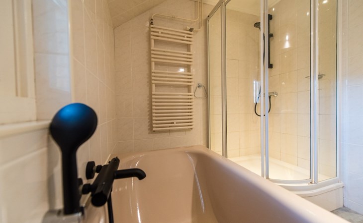 The bathroom is equipped with bath, shower and sink. There is a separate toilet.