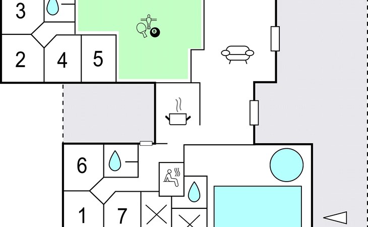 Weather permitting, you can also enjoy your meal on the cosy and partially covered terrace of the house. A barbecue is also available there. The house's pool measures 18 m² and is equipped with a water slide and Roman steps. Further entertainment continues in the house's activity room. Here you can play table tennis, billiards and table football. You can also compete on the holiday home's PlayStation 4 if you bring your own games.