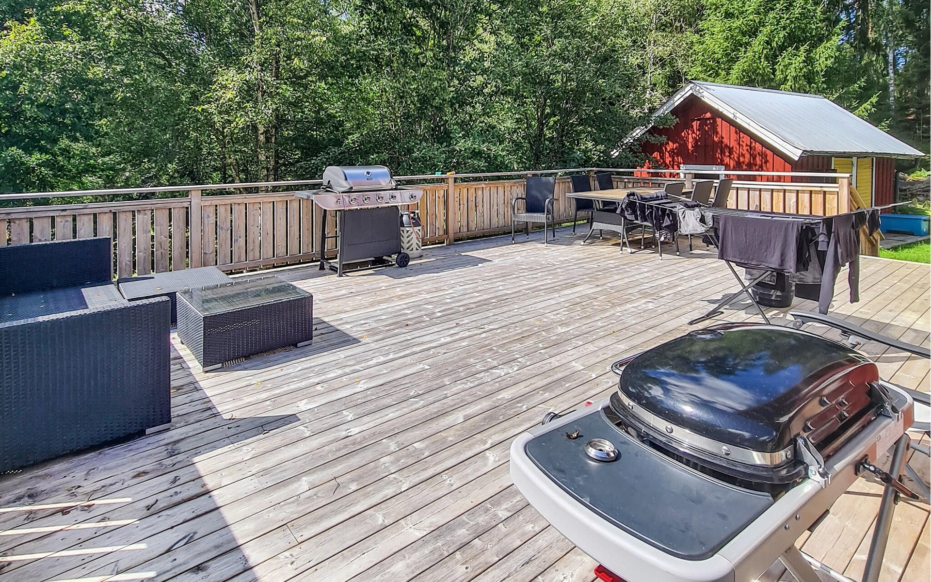 But it's not just the beautiful house that will delight you, but also the large wooden terrace, which invites you to barbecue, eat and sunbathe. While some play cards at the table, others can refresh themselves in the pool or watch wild animals in the forest.