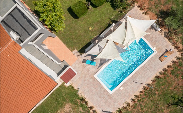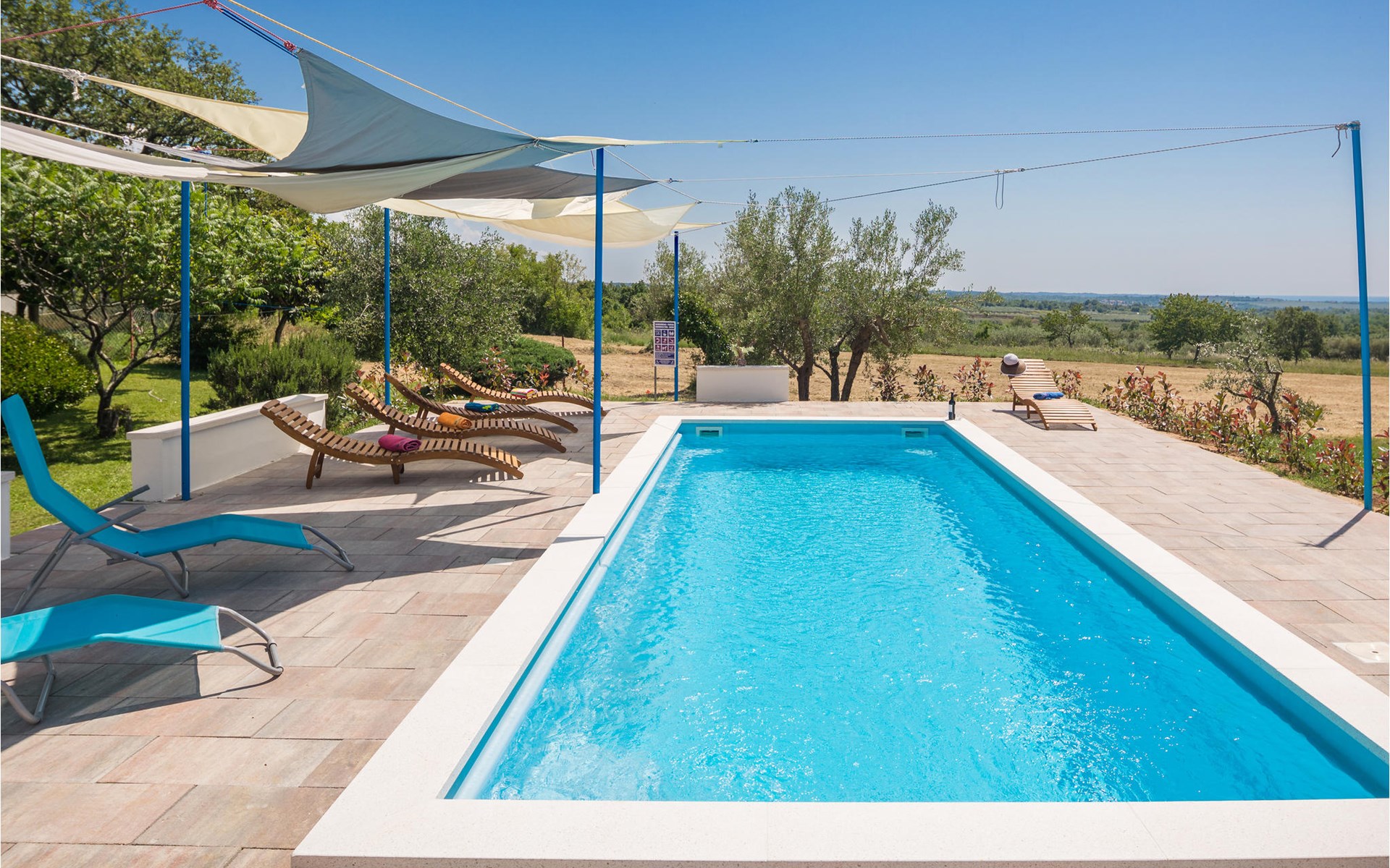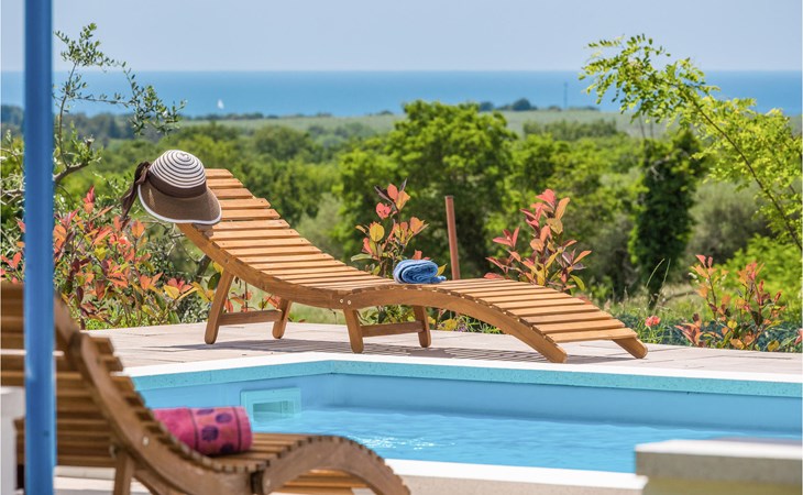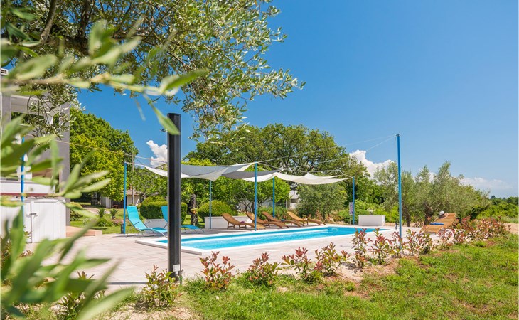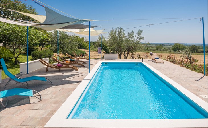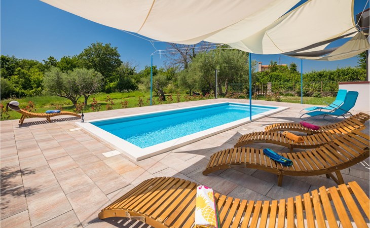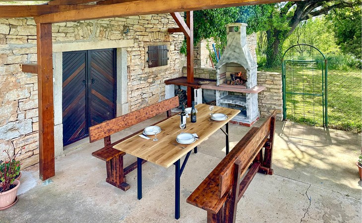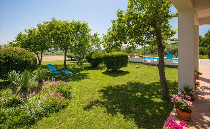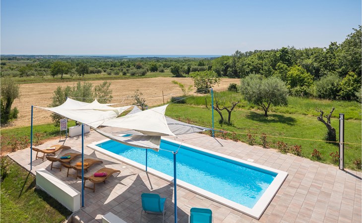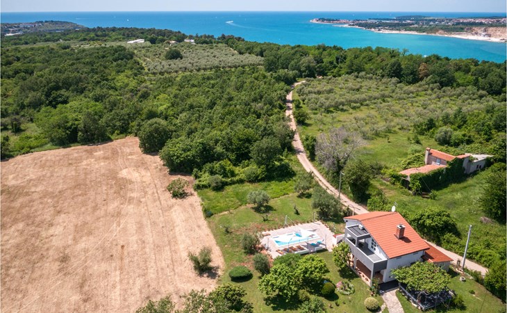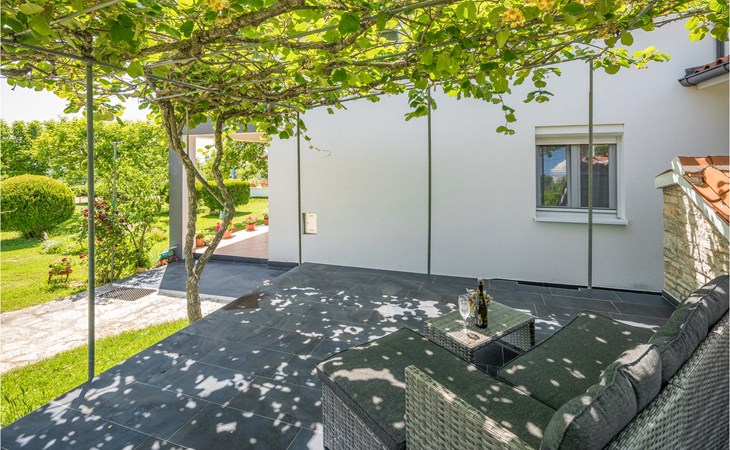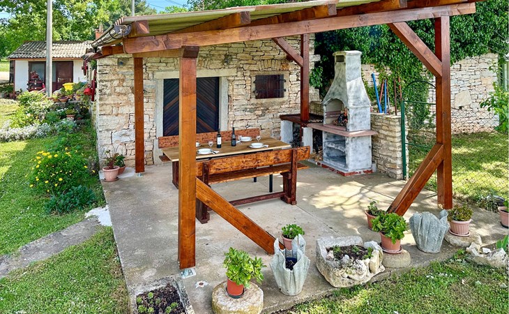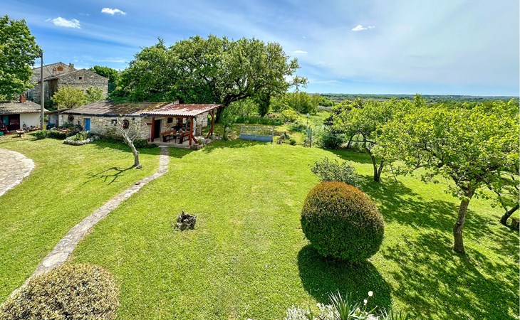 Completely surrounded by green cultivated landscape lies the private residence with two vacation apartments. In the garden you will especially enjoy the open landscape of the surroundings and the boundless horizon. In the midst of green surroundings and only 400 m from a pebble beach in Lanterna, you will make your vacation here in the hamlet of Stancija Blek, on a gently rising hill. CIE903 is a studio on the first floor, while CIE902 with three bedrooms occupies the space in the attic. Both vacation apartments are bright and simply as well as modernly furnished. Clean lines and a neat interior await you. Each apartment has its own terrace and both share the third terrace with a barbecue. The owners are pet lovers. All guests enjoy a free entrance to the pebble beach of Lanterna.