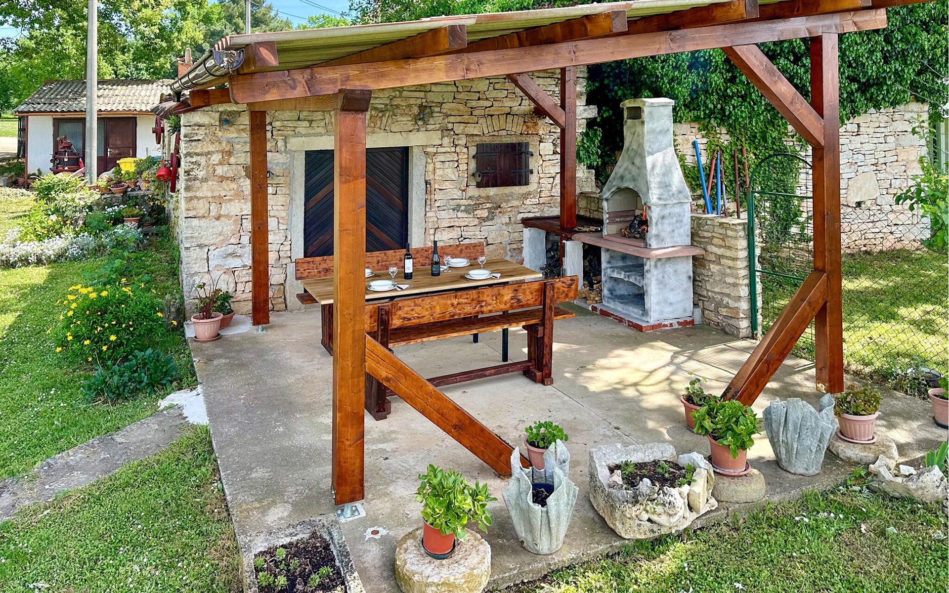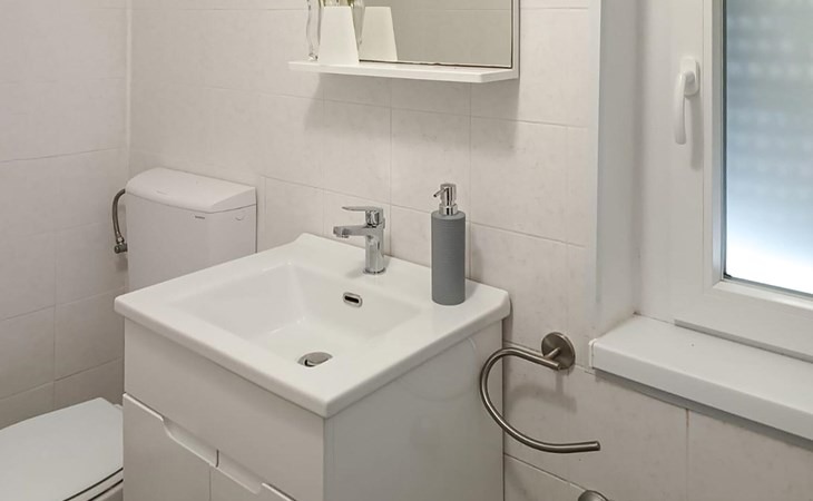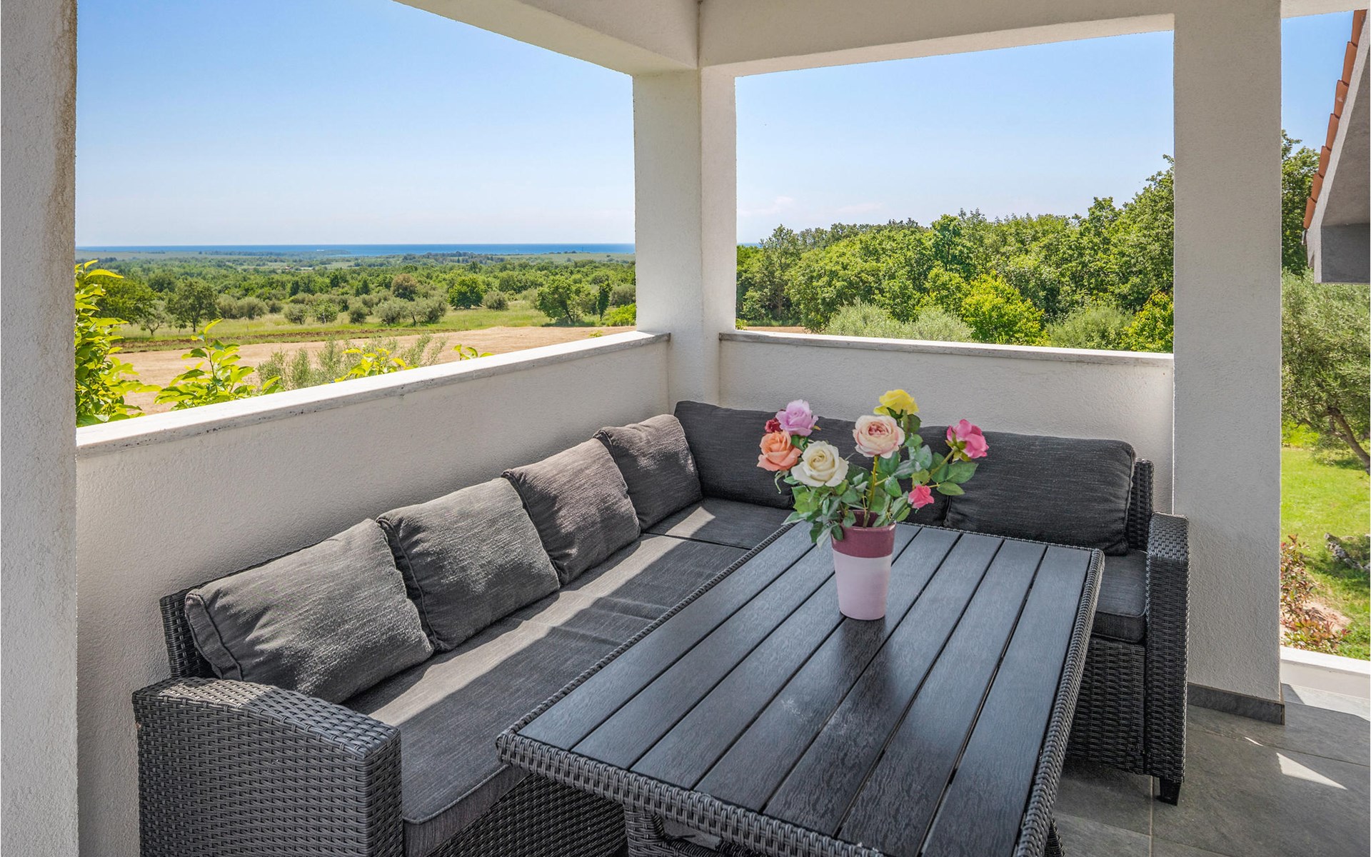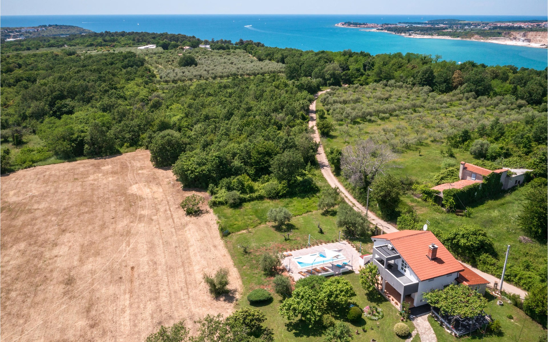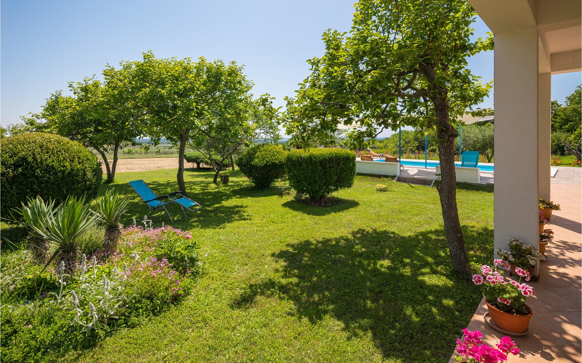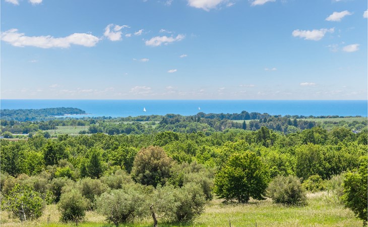 Completely surrounded by green cultivated landscape lies the private residence with two vacation apartments. In the garden you will especially enjoy the open landscape of the surroundings and the boundless horizon. In the midst of green surroundings and only 400 m from a pebble beach in Lanterna, you will make your vacation here in the hamlet of Stancija Blek, on a gently rising hill. CIE903 is a studio on the first floor, while CIE902 with three bedrooms occupies the space in the attic. Both vacation apartments are bright and simply as well as modernly furnished. Clean lines and a neat interior await you. Each apartment has its own terrace and both share the third terrace with a barbecue. The owners are pet lovers. All guests enjoy a free entrance to the pebble beach of Lanterna.