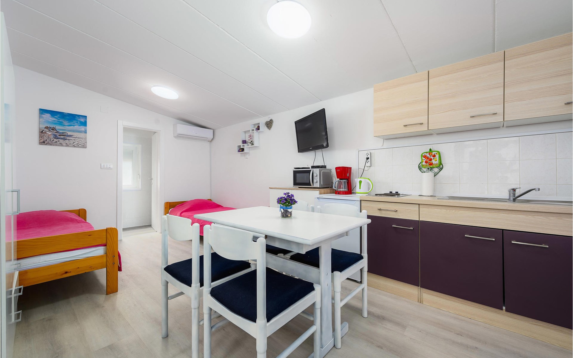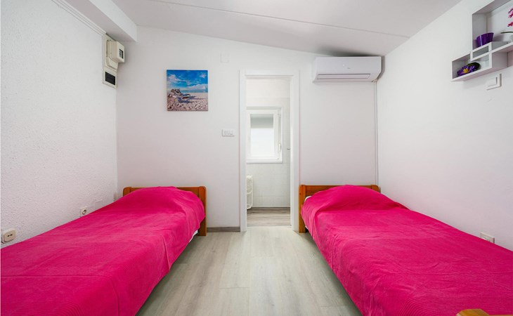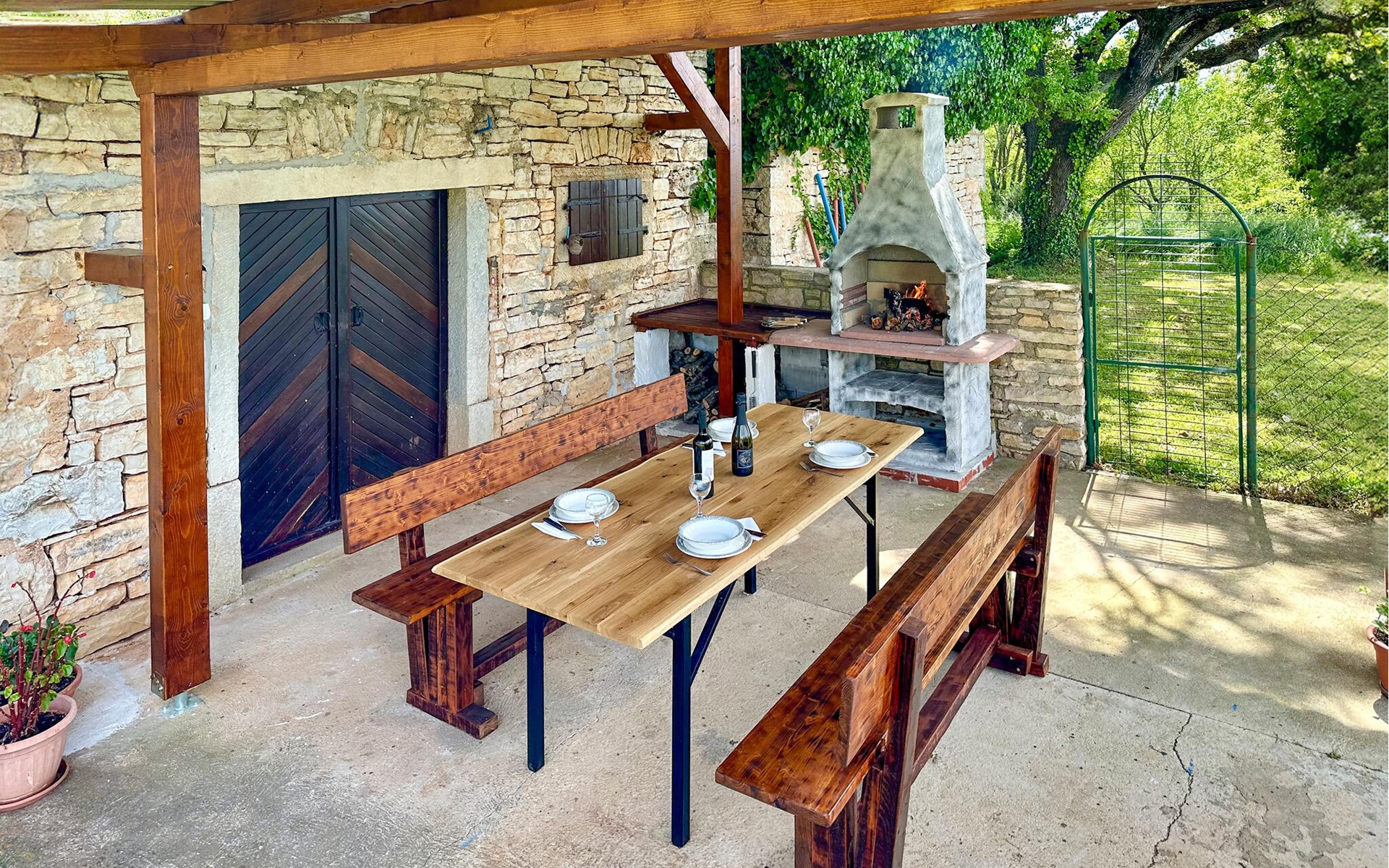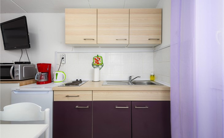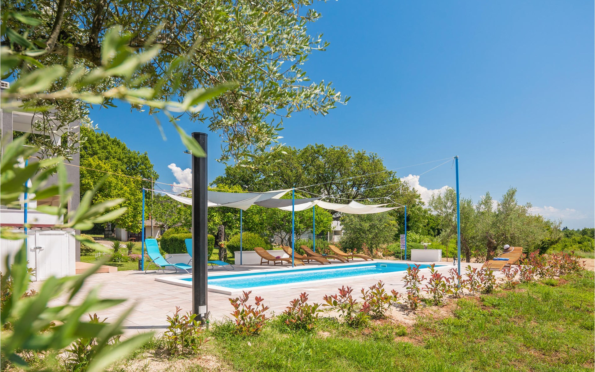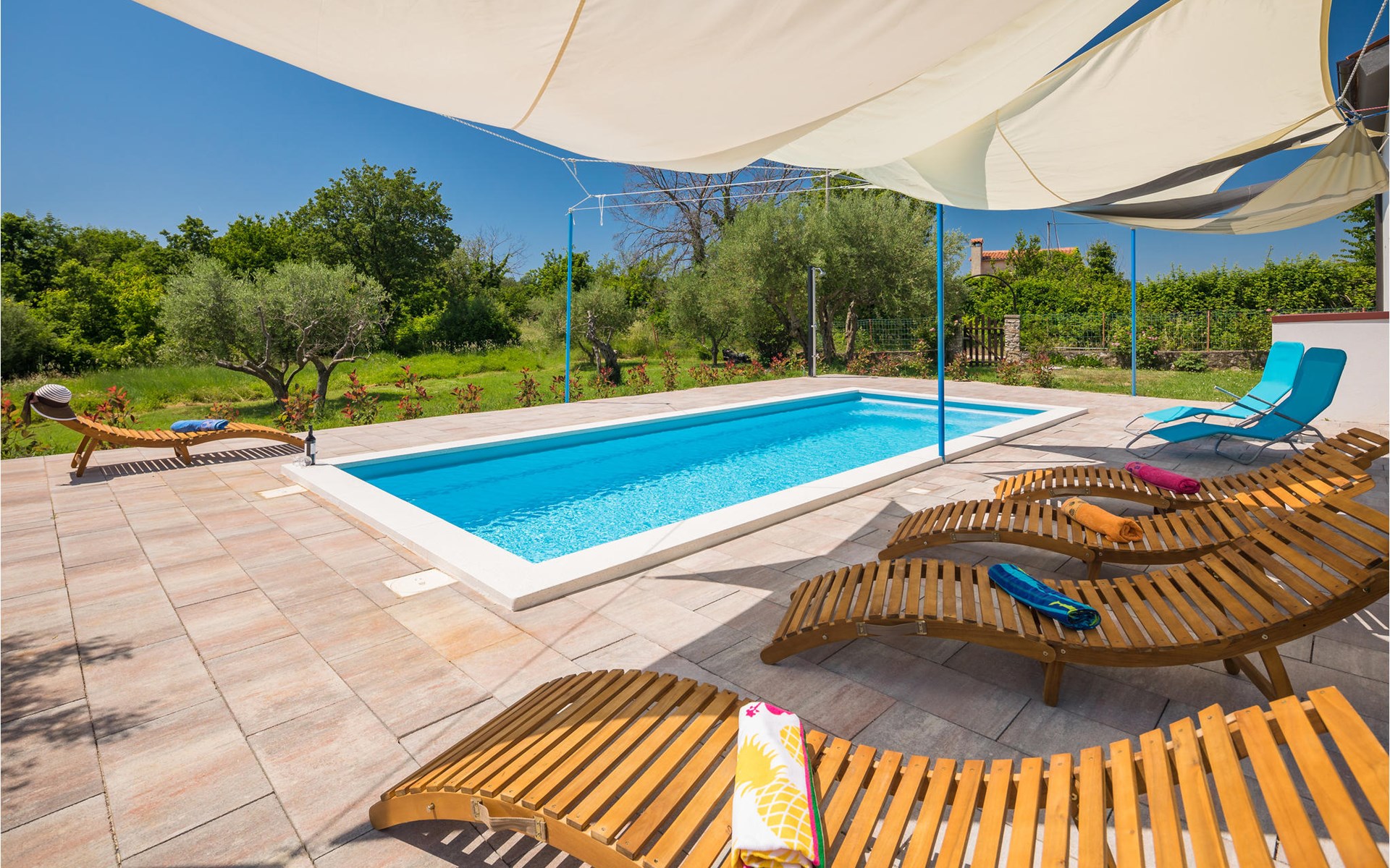 Completely surrounded by green cultivated landscape lies the private residence with two vacation apartments. In the garden you will especially enjoy the open landscape of the surroundings and the boundless horizon. In the midst of green surroundings and only 400 m from a pebble beach in Lanterna, you will make your vacation here in the hamlet of Stancija Blek, on a gently rising hill. CIE903 is a studio on the first floor, while CIE902 with three bedrooms occupies the space in the attic. Both vacation apartments are bright and simply as well as modernly furnished. Clean lines and a neat interior await you. Each apartment has its own terrace and both share the third terrace with a barbecue. The owners are pet lovers. All guests enjoy a free entrance to the pebble beach of Lanterna.