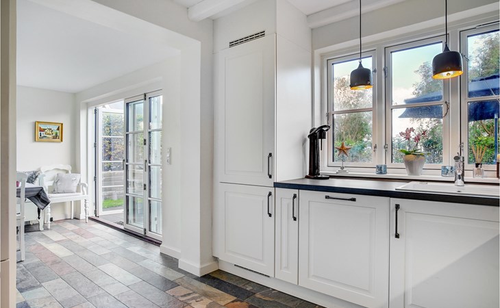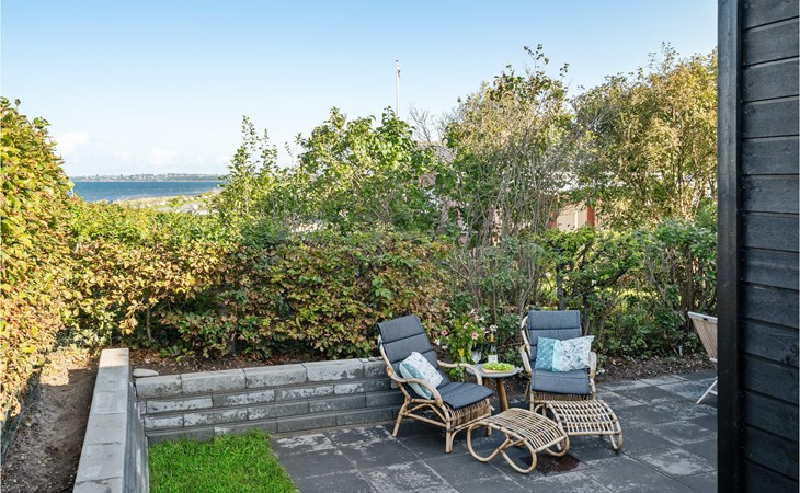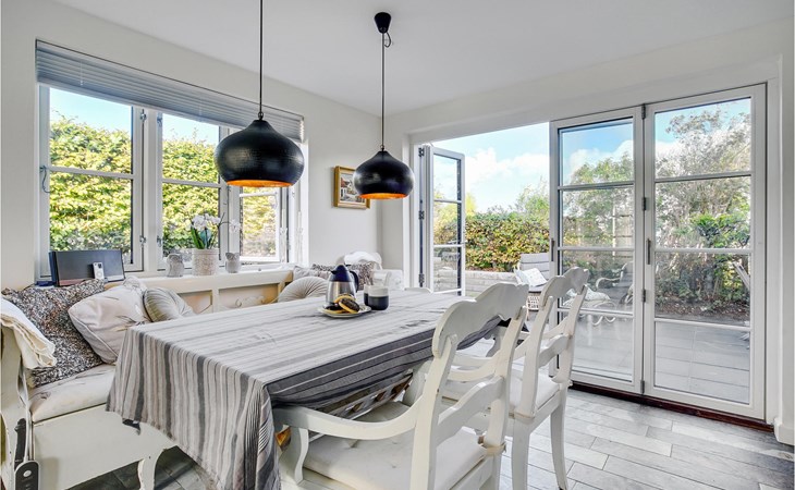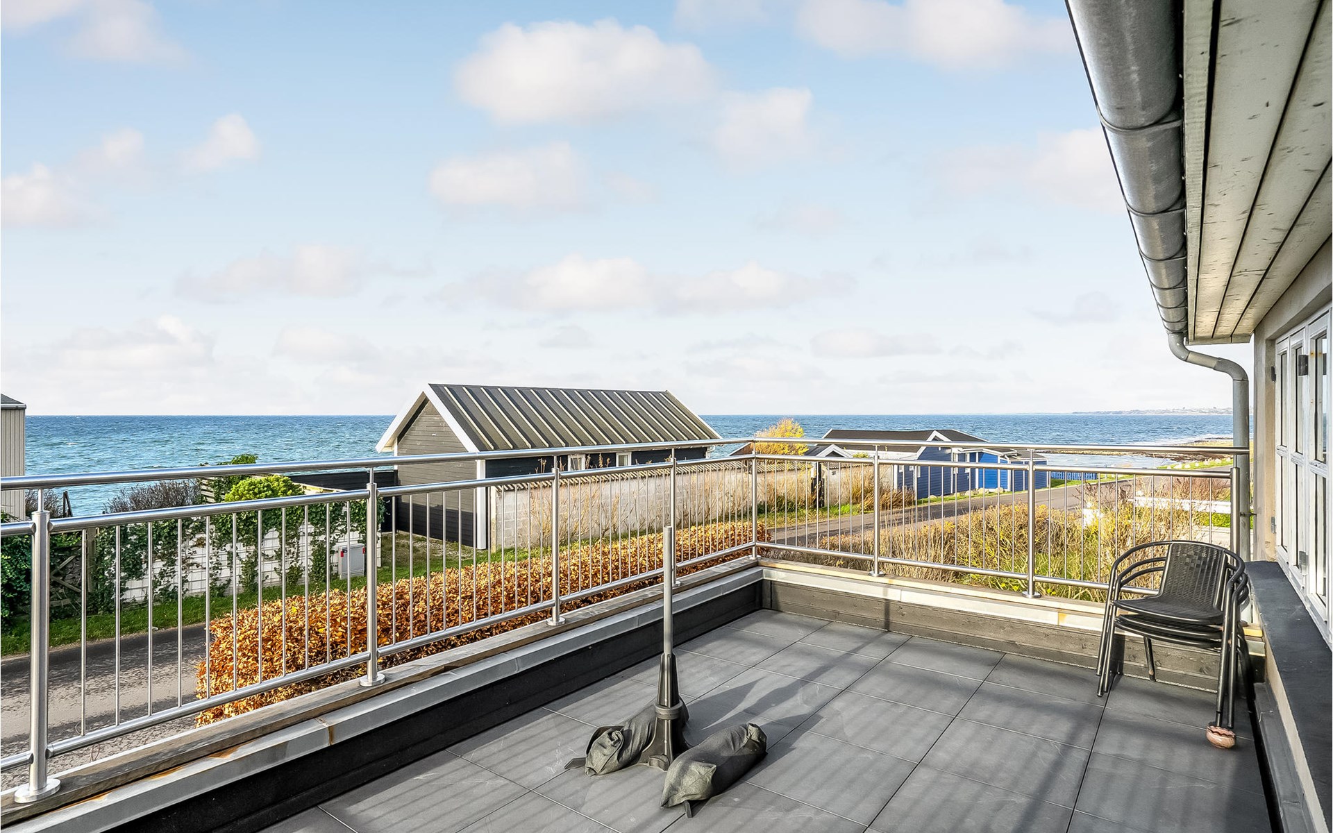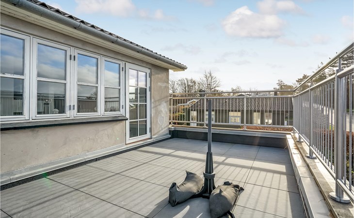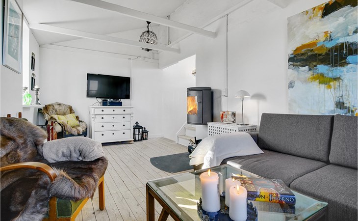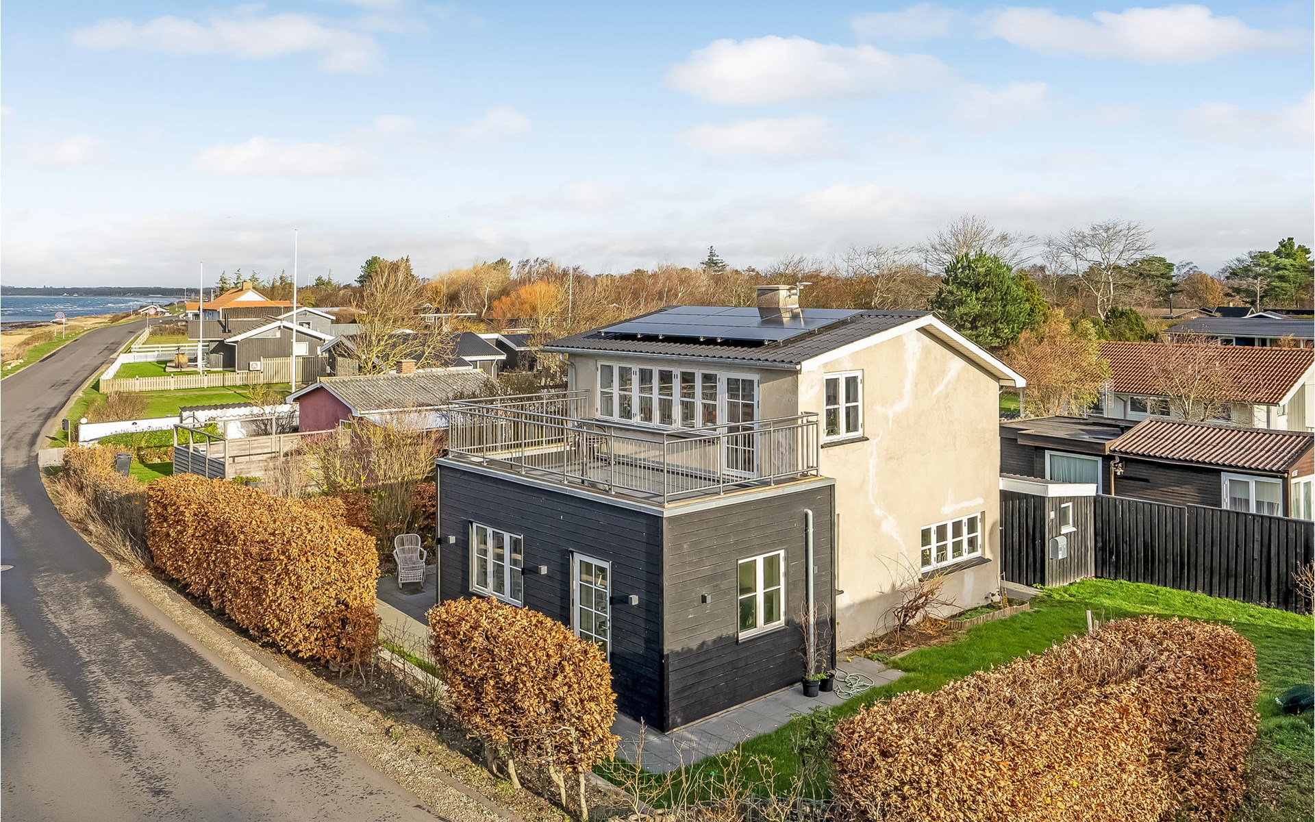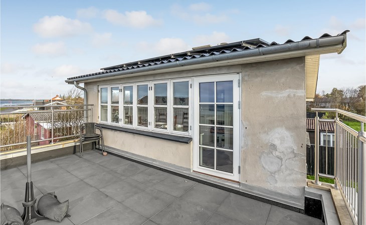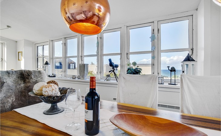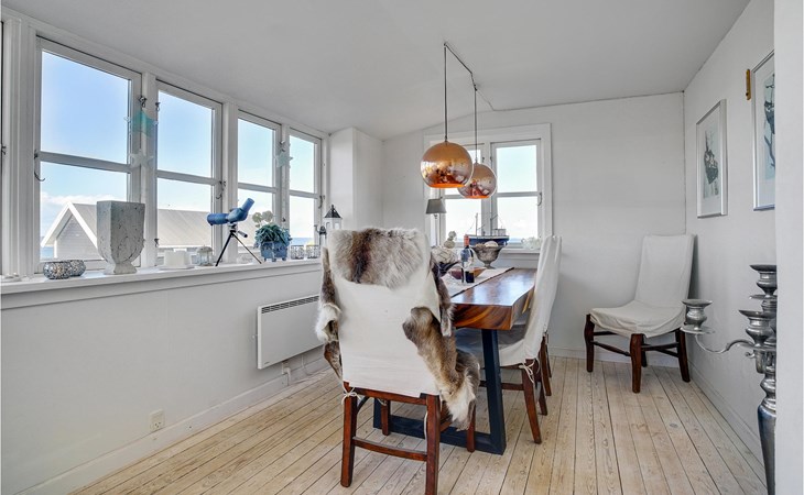 Inviting vacation apartment in the second row, only 50 m from the beautiful bathing beach. The house is in two floors, with unique view of the water from the large roof terrace. On the first floor is a hallway, 2 bedrooms, bathroom with shower and a charming French-inspired kitchen with fireplace. From here you can reach the lovely terrace with good possibilities to enjoy the sunny days and relax or barbecue after a day at the beach. On the second floor is a living room with fireplace and a sofa that can also function as a bed. In addition, a beautiful dining room overlooking the water and access to a beautiful open balcony / terrace with glass enclosure where you can enjoy the unique view over Kongsmark beach and water while the sun sets.