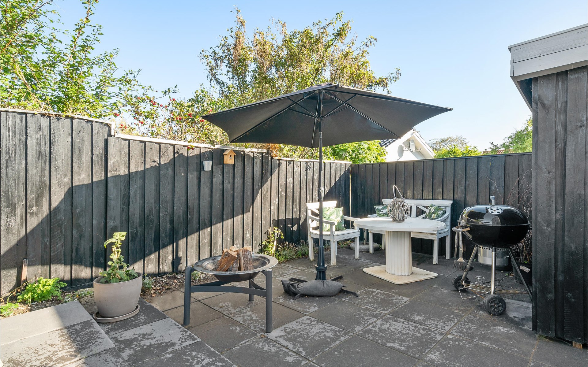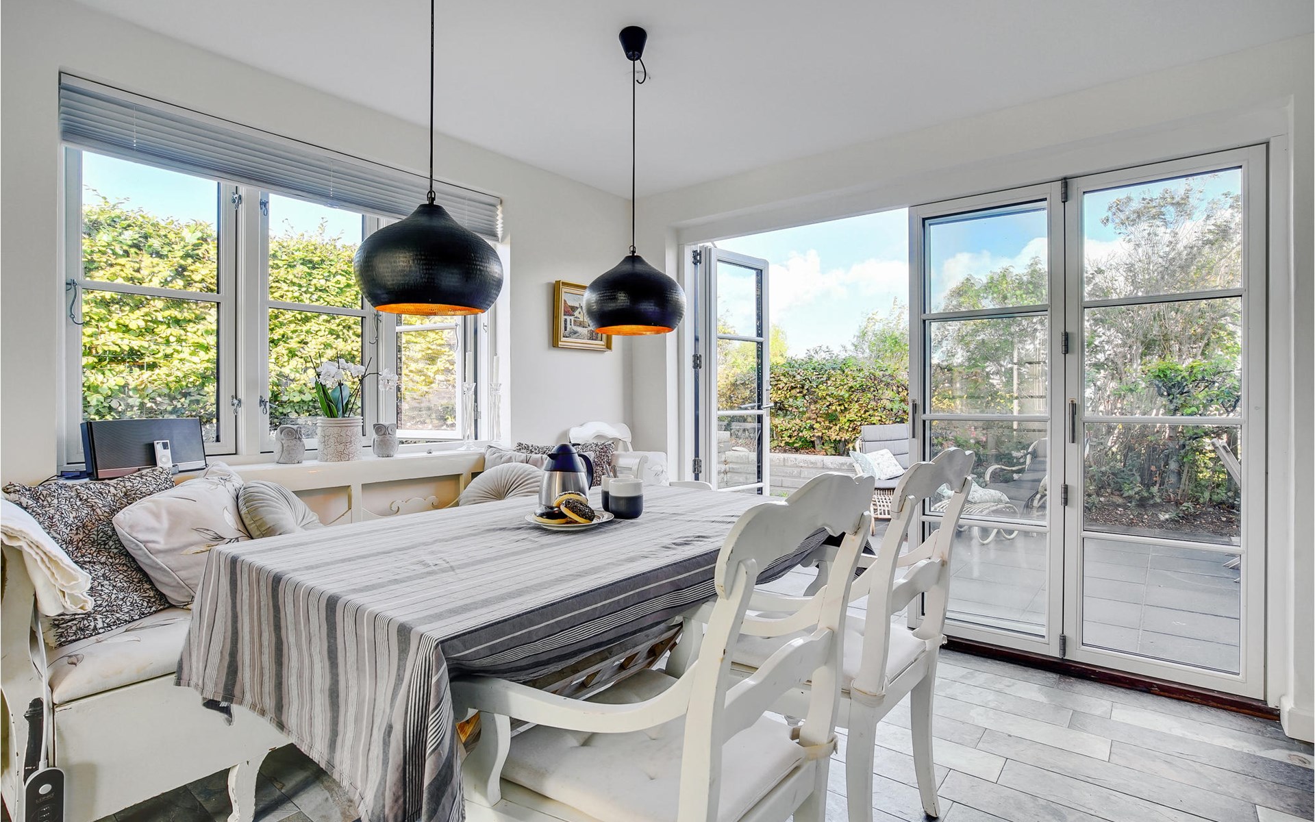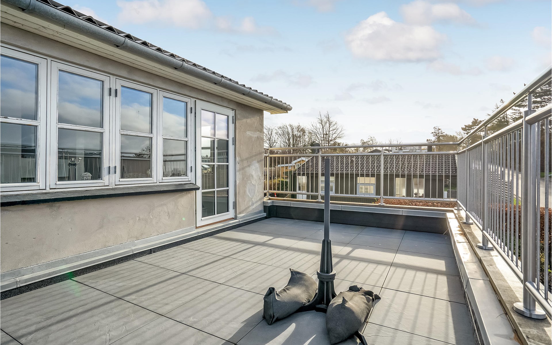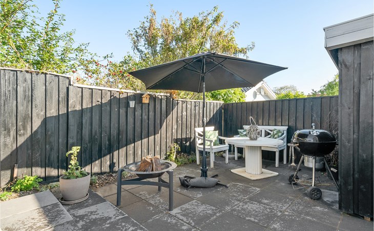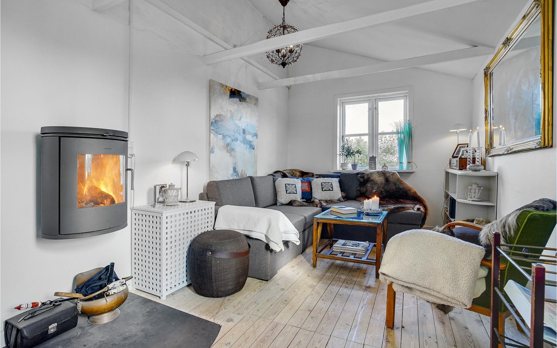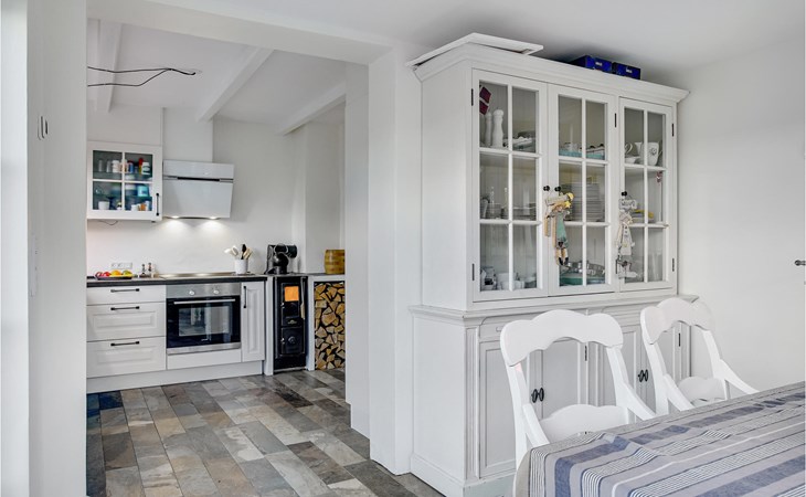 Inviting vacation apartment in the second row, only 50 m from the beautiful bathing beach. The house is in two floors, with unique view of the water from the large roof terrace. On the first floor is a hallway, 2 bedrooms, bathroom with shower and a charming French-inspired kitchen with fireplace. From here you can reach the lovely terrace with good possibilities to enjoy the sunny days and relax or barbecue after a day at the beach. On the second floor is a living room with fireplace and a sofa that can also function as a bed. In addition, a beautiful dining room overlooking the water and access to a beautiful open balcony / terrace with glass enclosure where you can enjoy the unique view over Kongsmark beach and water while the sun sets.