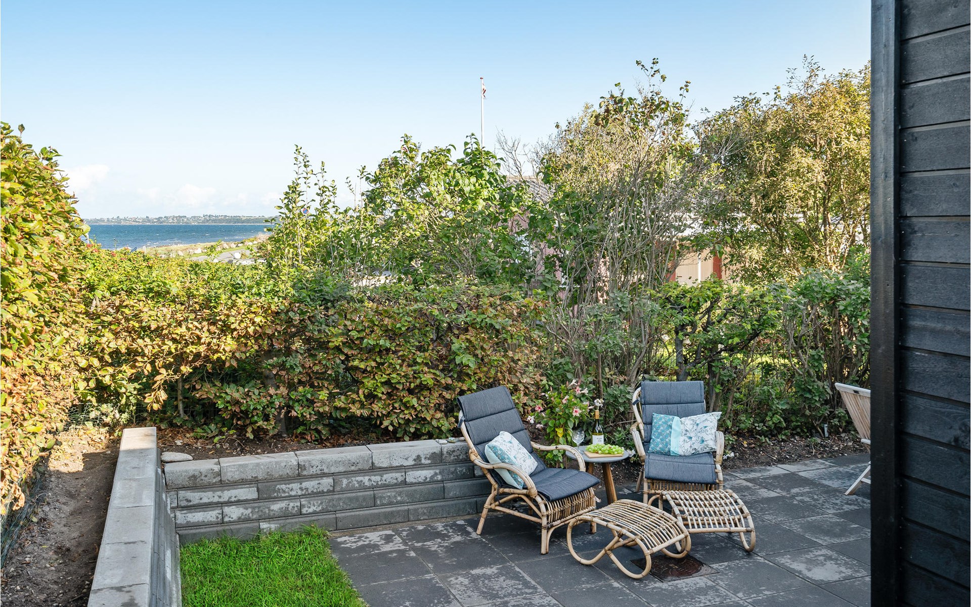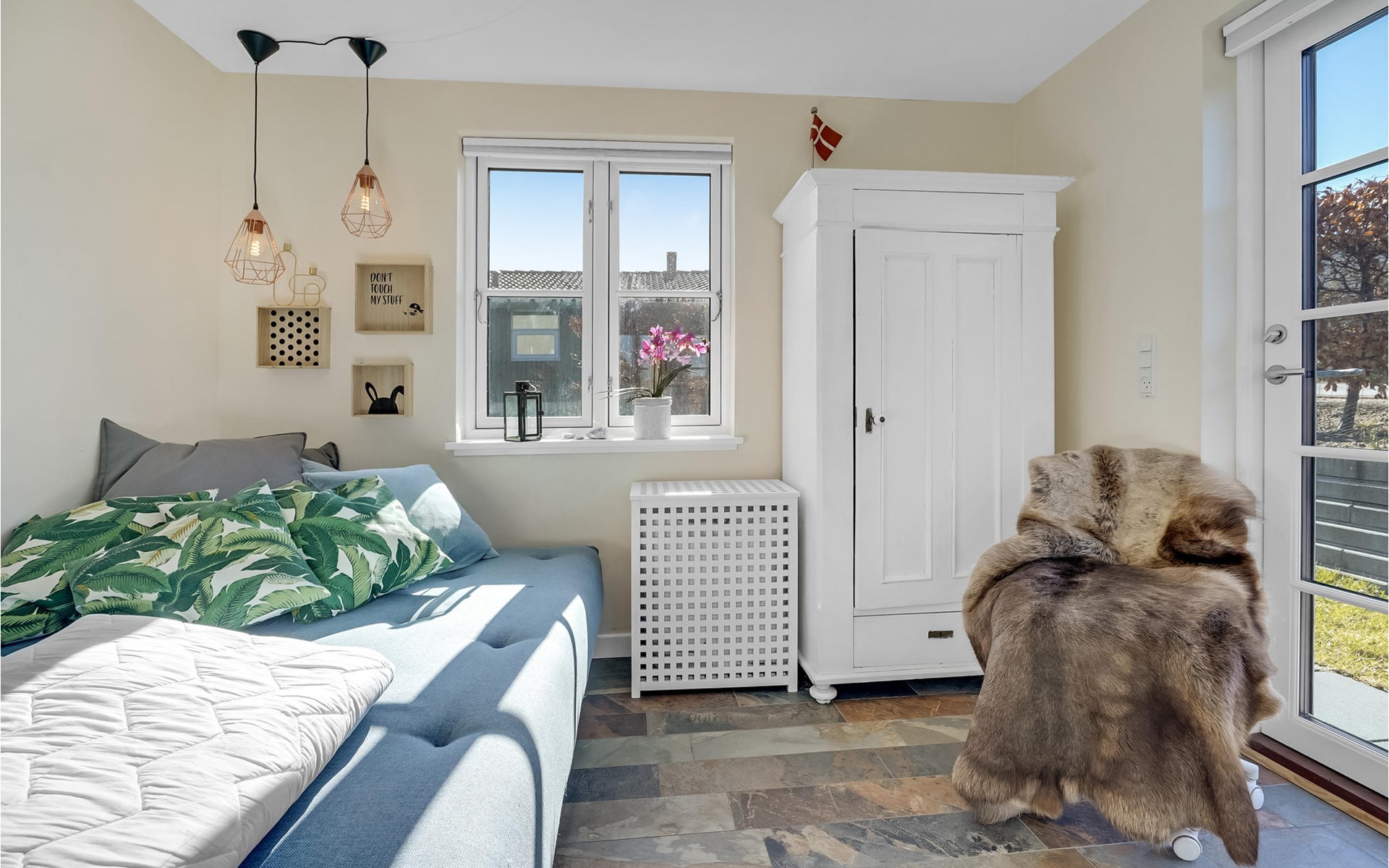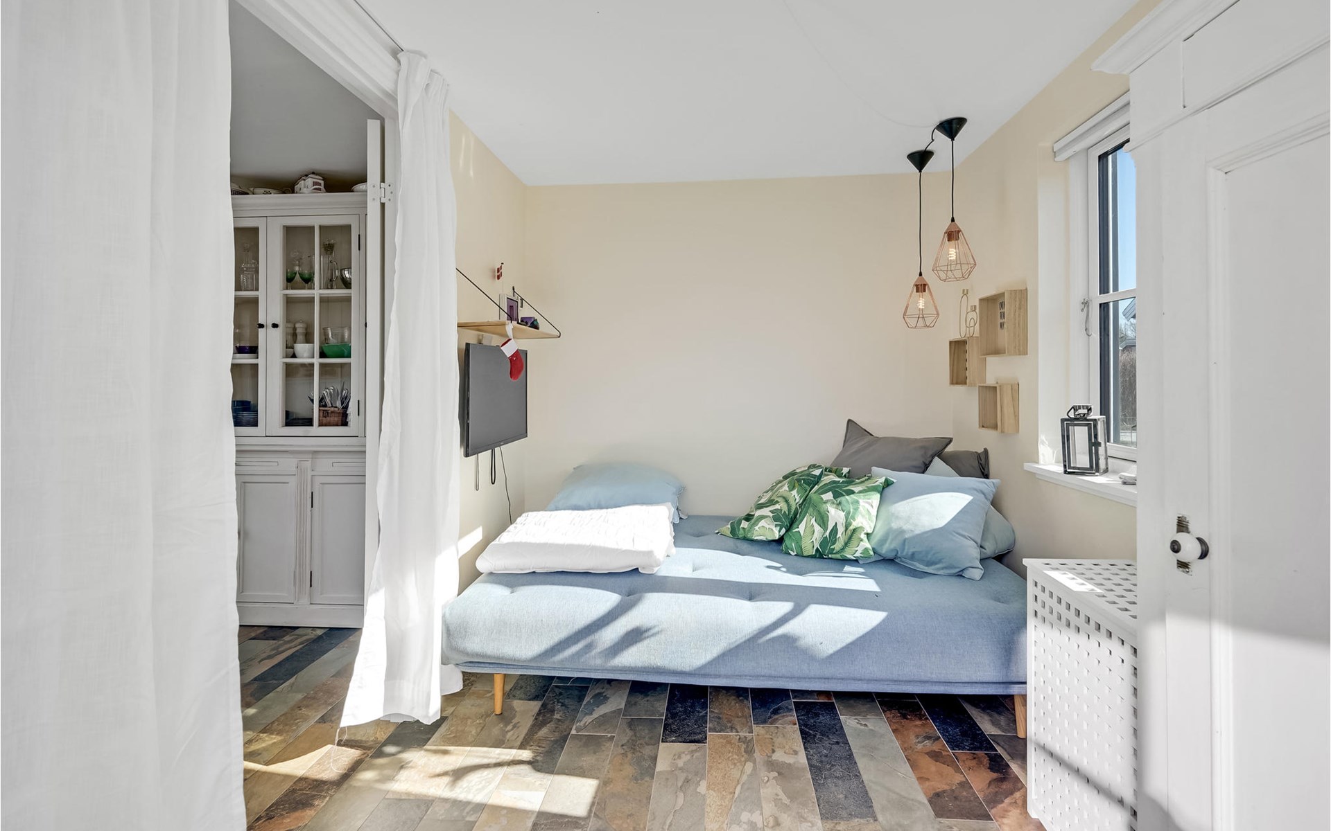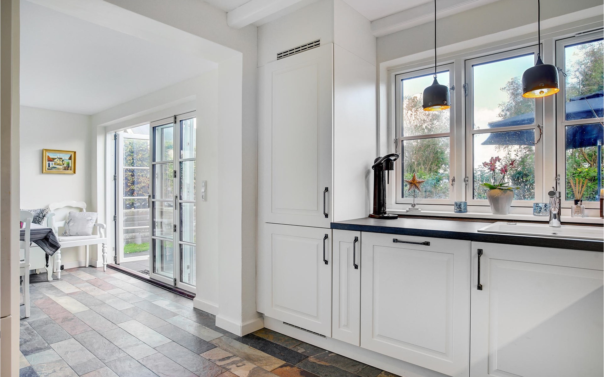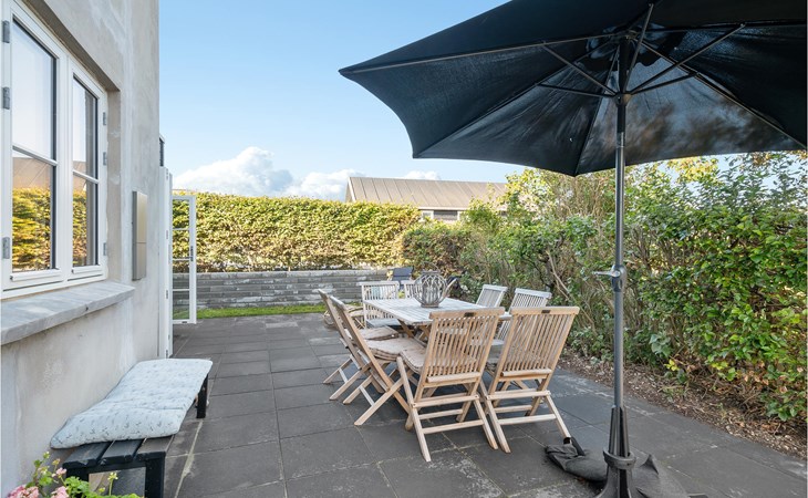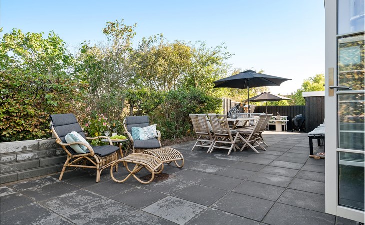 Inviting vacation apartment in the second row, only 50 m from the beautiful bathing beach. The house is in two floors, with unique view of the water from the large roof terrace. On the first floor is a hallway, 2 bedrooms, bathroom with shower and a charming French-inspired kitchen with fireplace. From here you can reach the lovely terrace with good possibilities to enjoy the sunny days and relax or barbecue after a day at the beach. On the second floor is a living room with fireplace and a sofa that can also function as a bed. In addition, a beautiful dining room overlooking the water and access to a beautiful open balcony / terrace with glass enclosure where you can enjoy the unique view over Kongsmark beach and water while the sun sets.