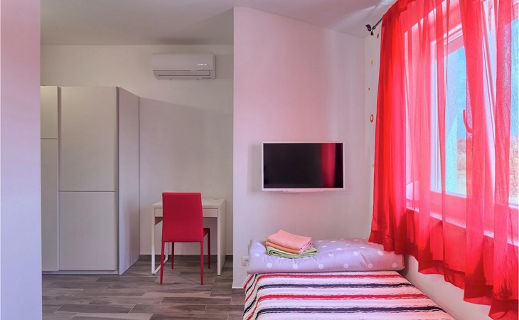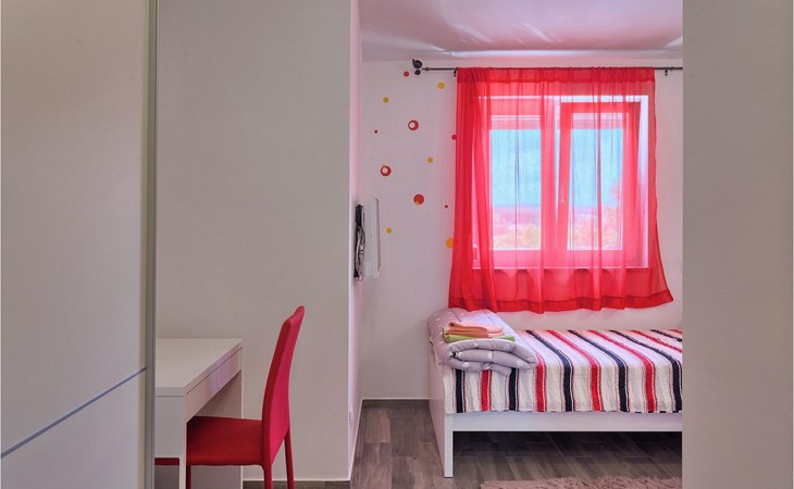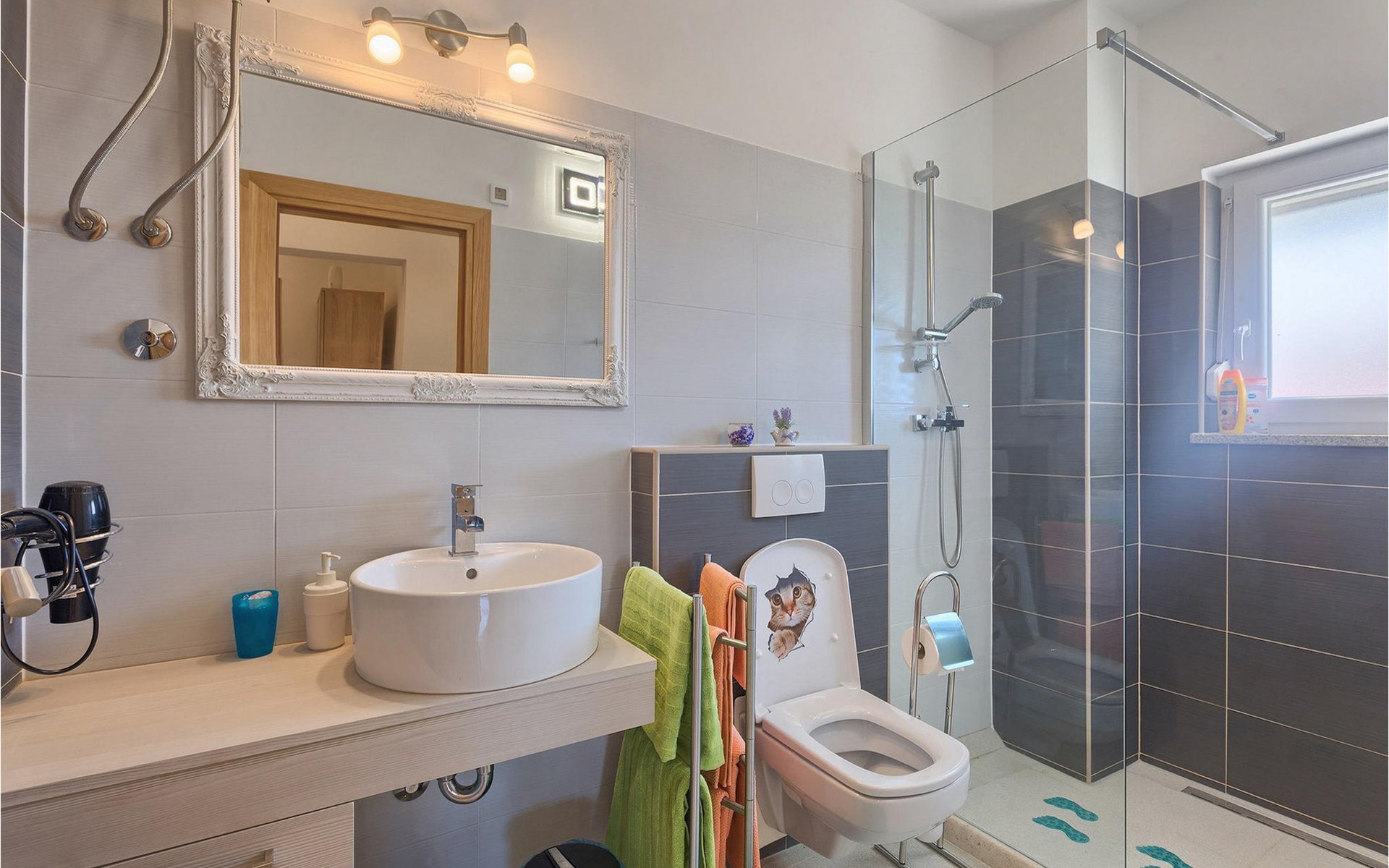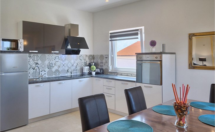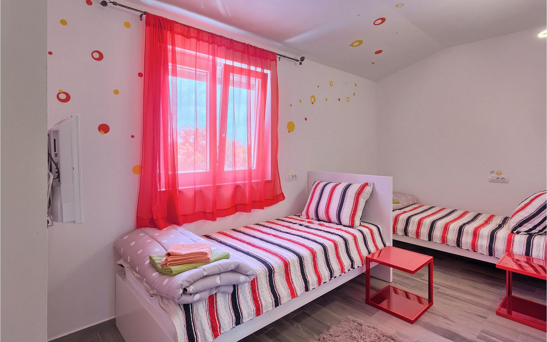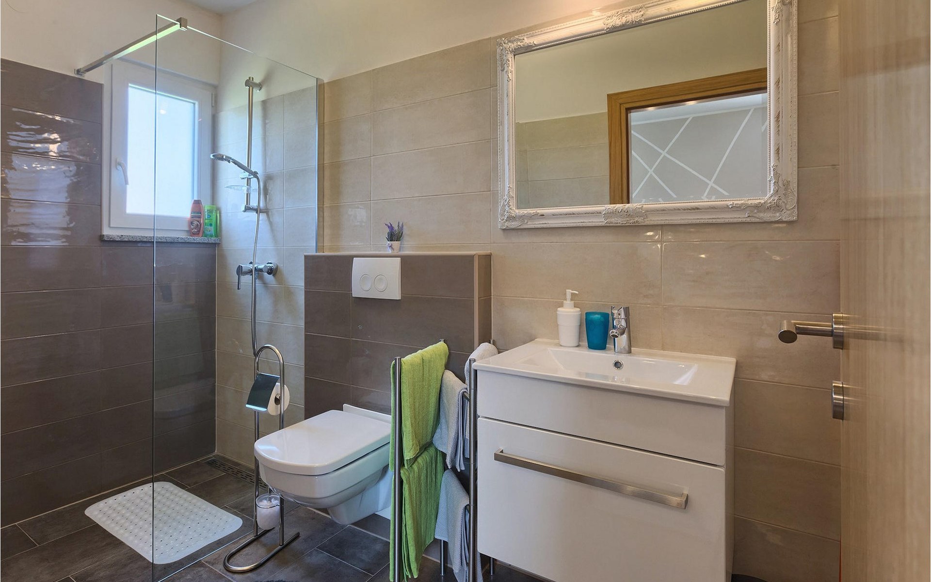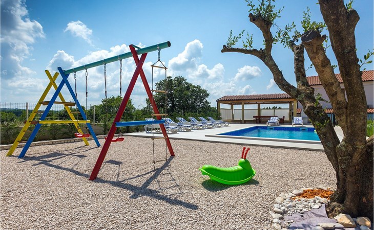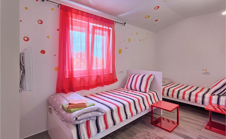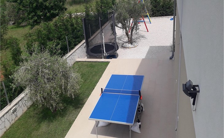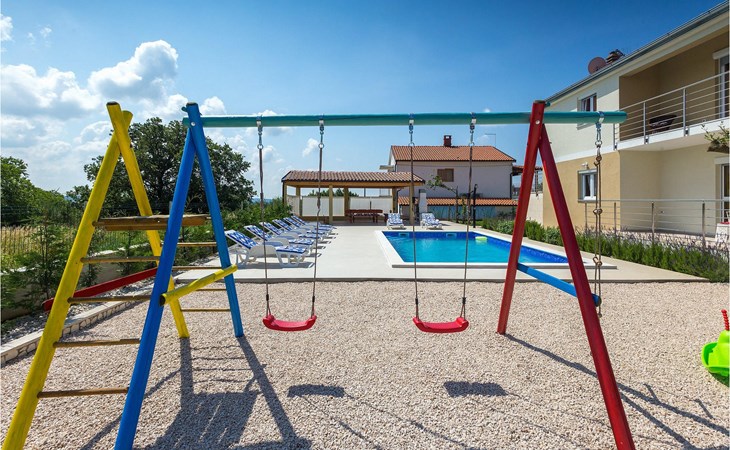 The charming Villa Renata is ideal for those who want to spend a relaxing vacation with family and friends, but still want to have their privacy. The villa consists of 2 separate apartments that are only rented together and only to one group of guests. The first floor consists of a spacious living and dining area, a fully equipped kitchen, two bedrooms with en-suite bathrooms and a separate guest toilet. From here you have direct access to the balcony and the spacious outdoor area with a private pool and a children's playground. As a separate apartment, the second floor consists of two bedrooms, each with its own bathroom, as well as a living/dining area and a kitchen. Here you will also find 2 balconies from which you can enjoy a view of the pool area and a cup of coffee.