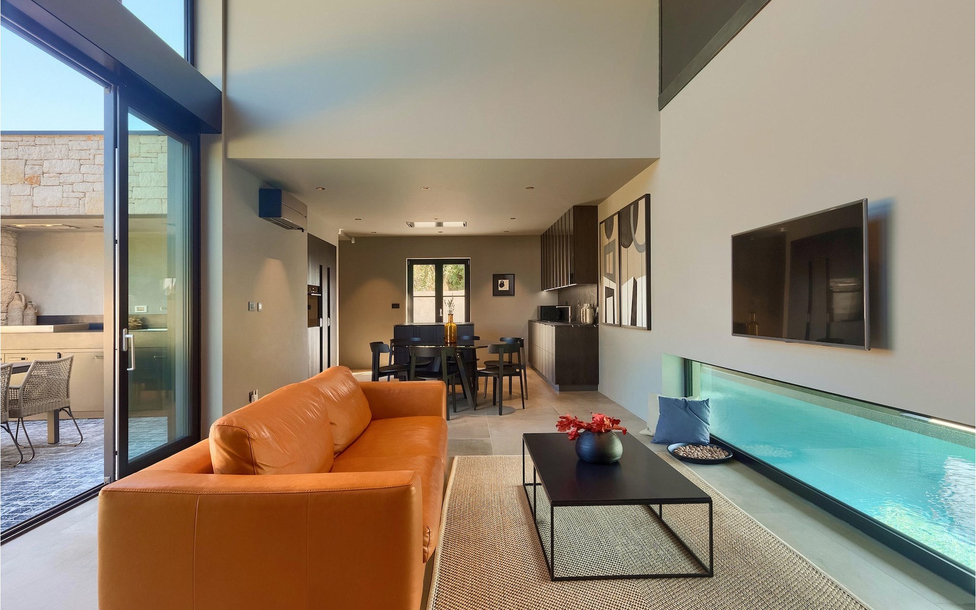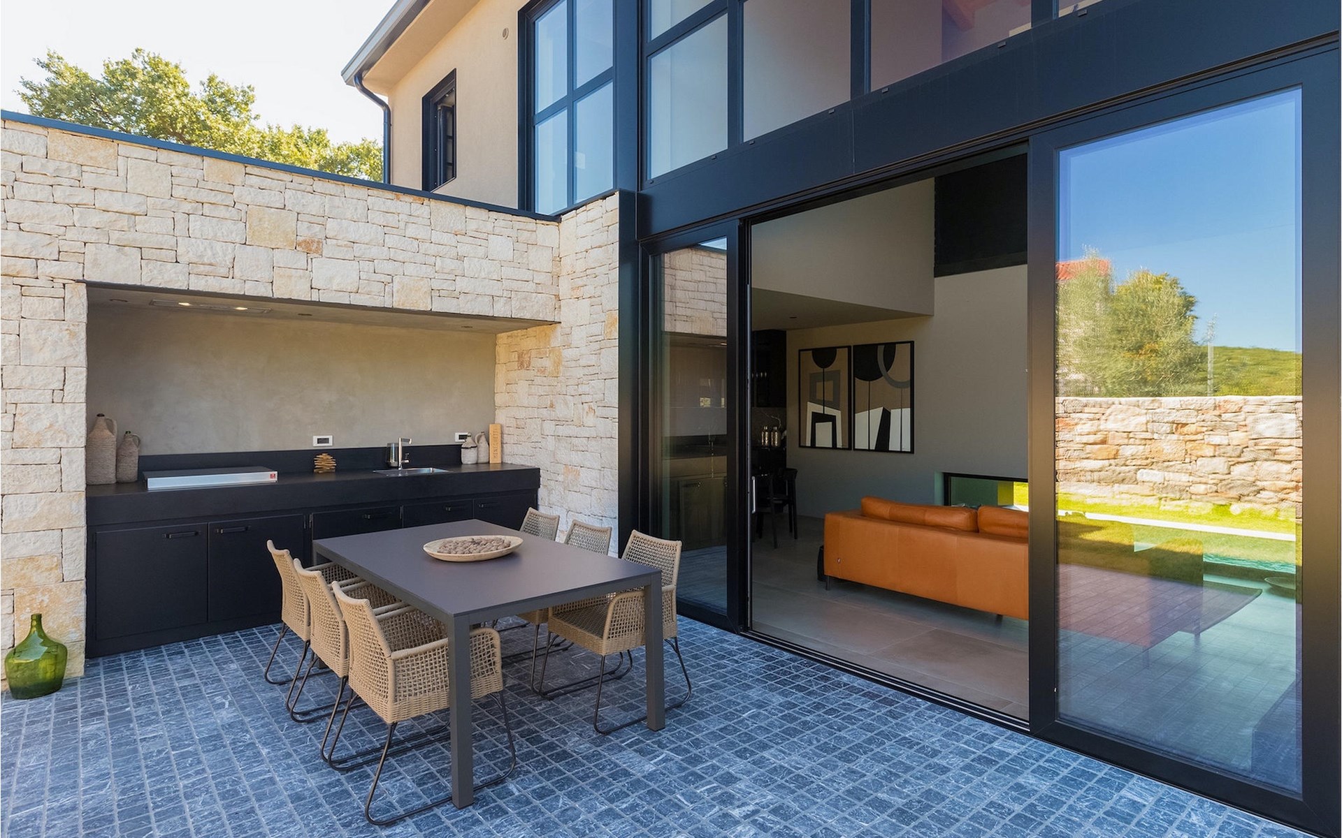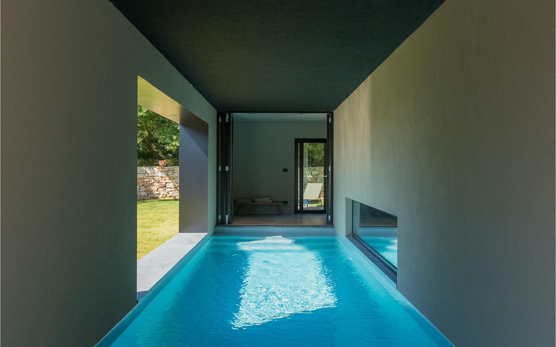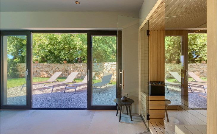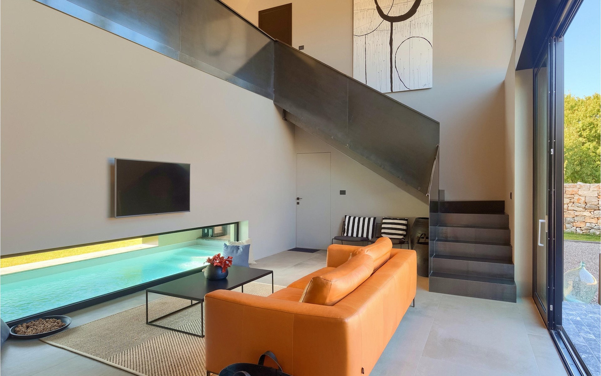 If you take the stairs down to the first floor, you will enter the living and dining area and the fully equipped kitchen. If you prefer to dine al fresco, there is a gas barbecue and an outdoor kitchen with a dining table for 6 people, just a few steps away from the living room. An attractive feature of the villa is the glass area that separates the living room and the pool. The inviting pool is easily accessible both from the garden and from inside through the wellness area, where a sauna is available.