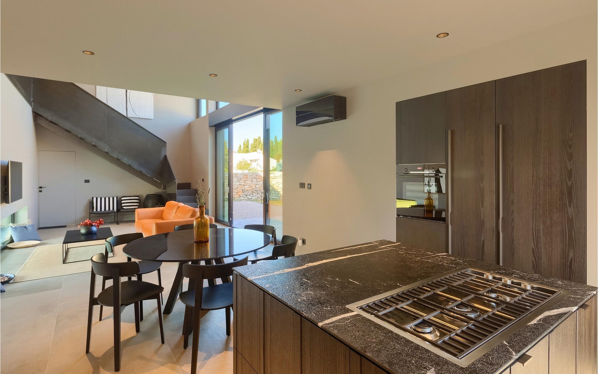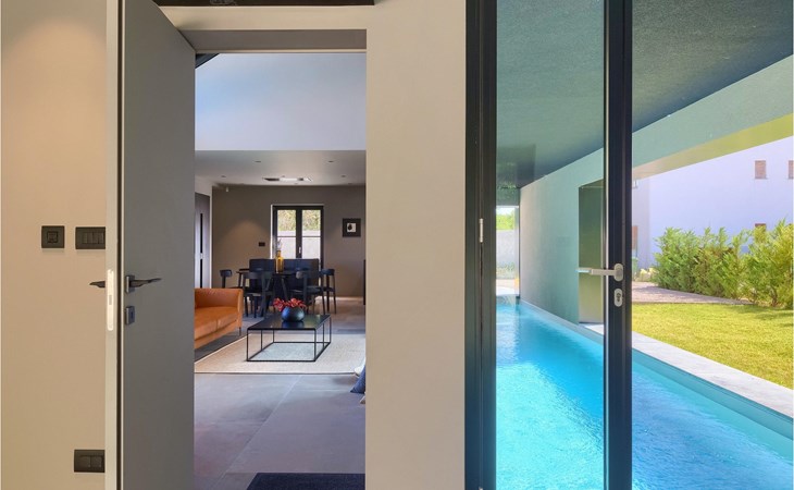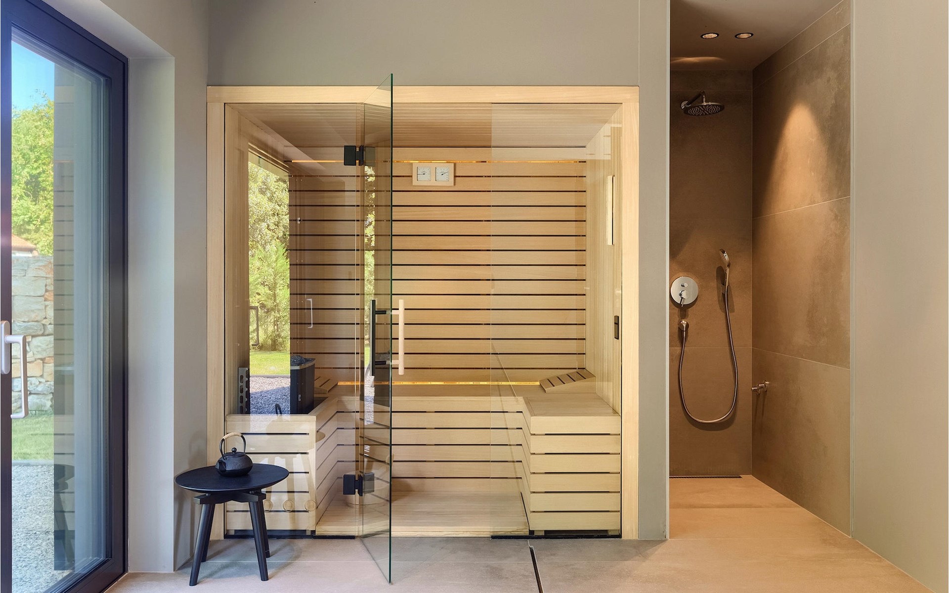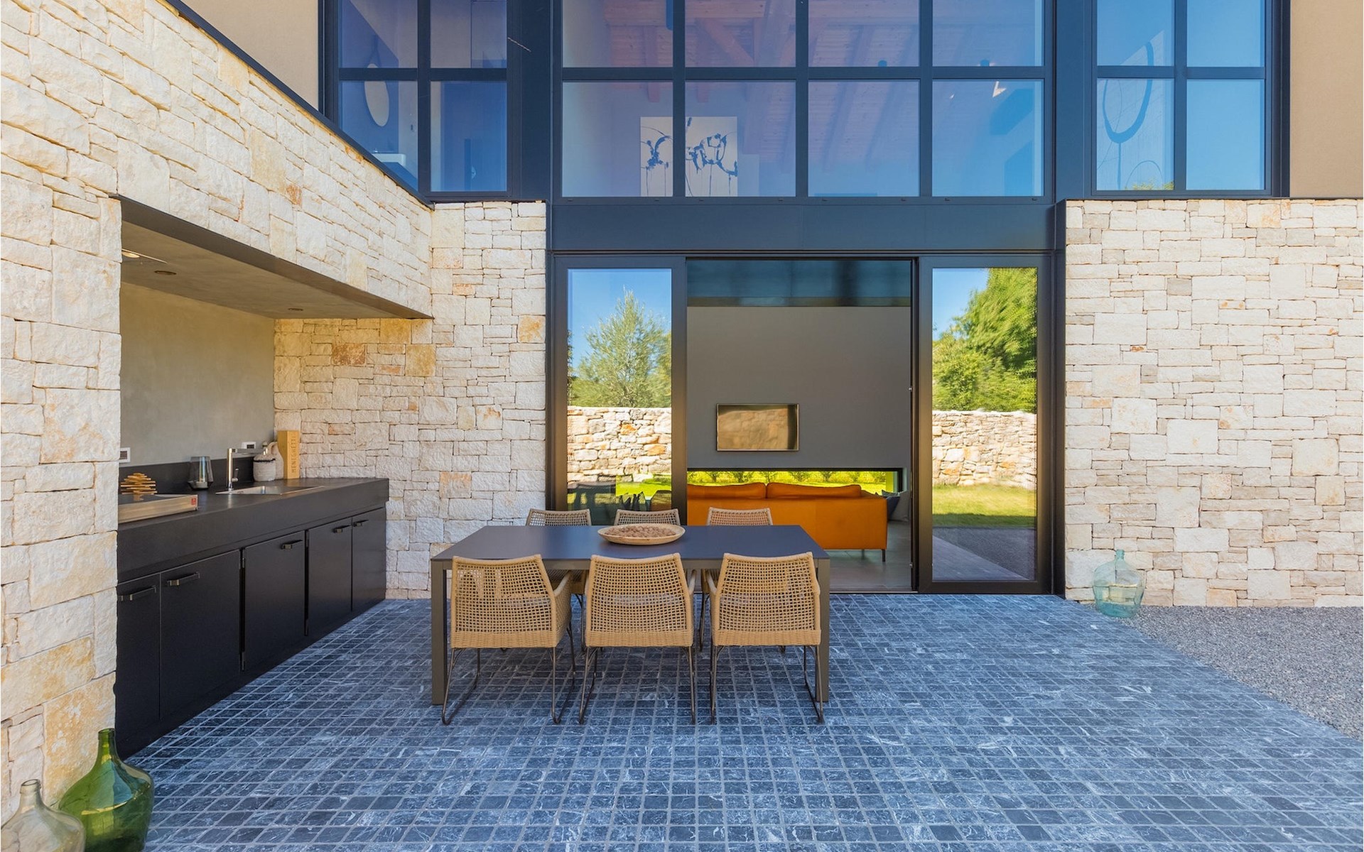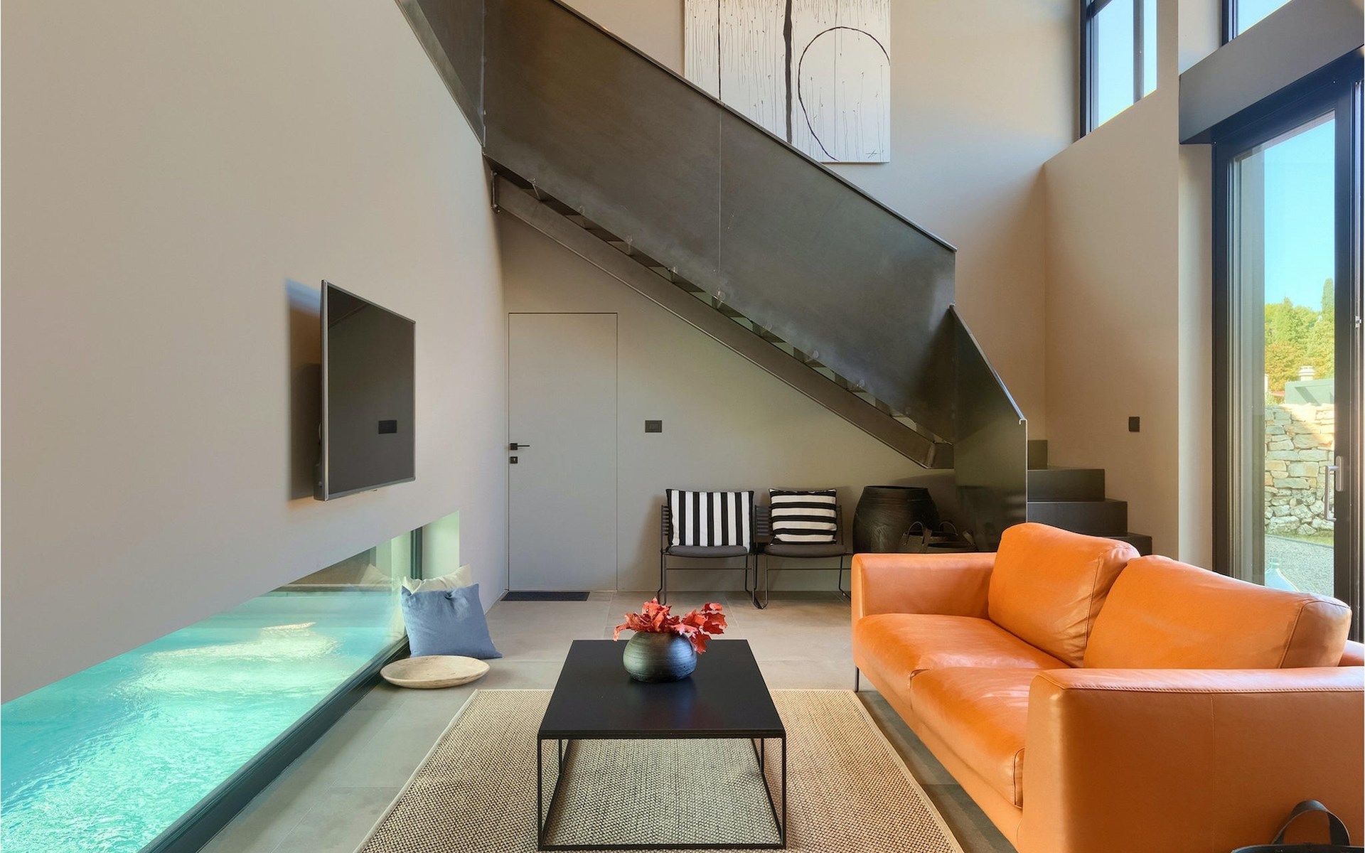 If you take the stairs down to the first floor, you will enter the living and dining area and the fully equipped kitchen. If you prefer to dine al fresco, there is a gas barbecue and an outdoor kitchen with a dining table for 6 people, just a few steps away from the living room. An attractive feature of the villa is the glass area that separates the living room and the pool. The inviting pool is easily accessible both from the garden and from inside through the wellness area, where a sauna is available.