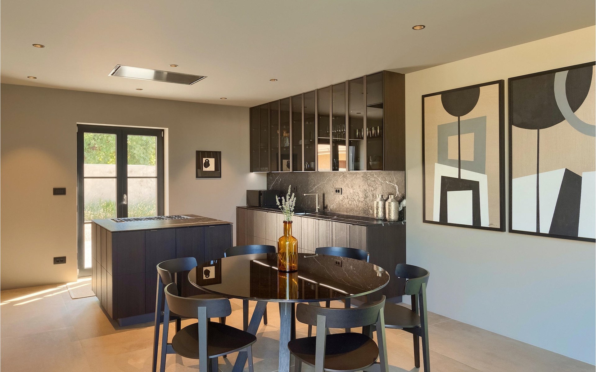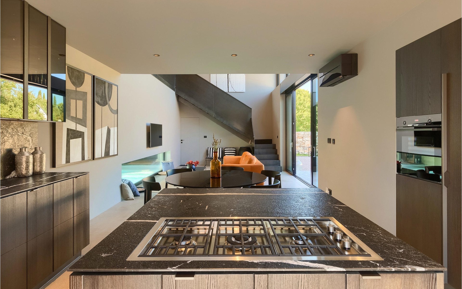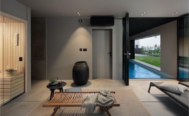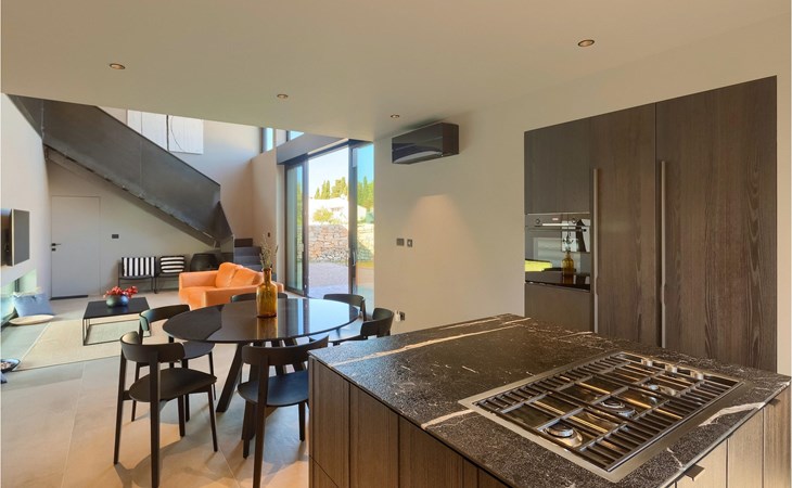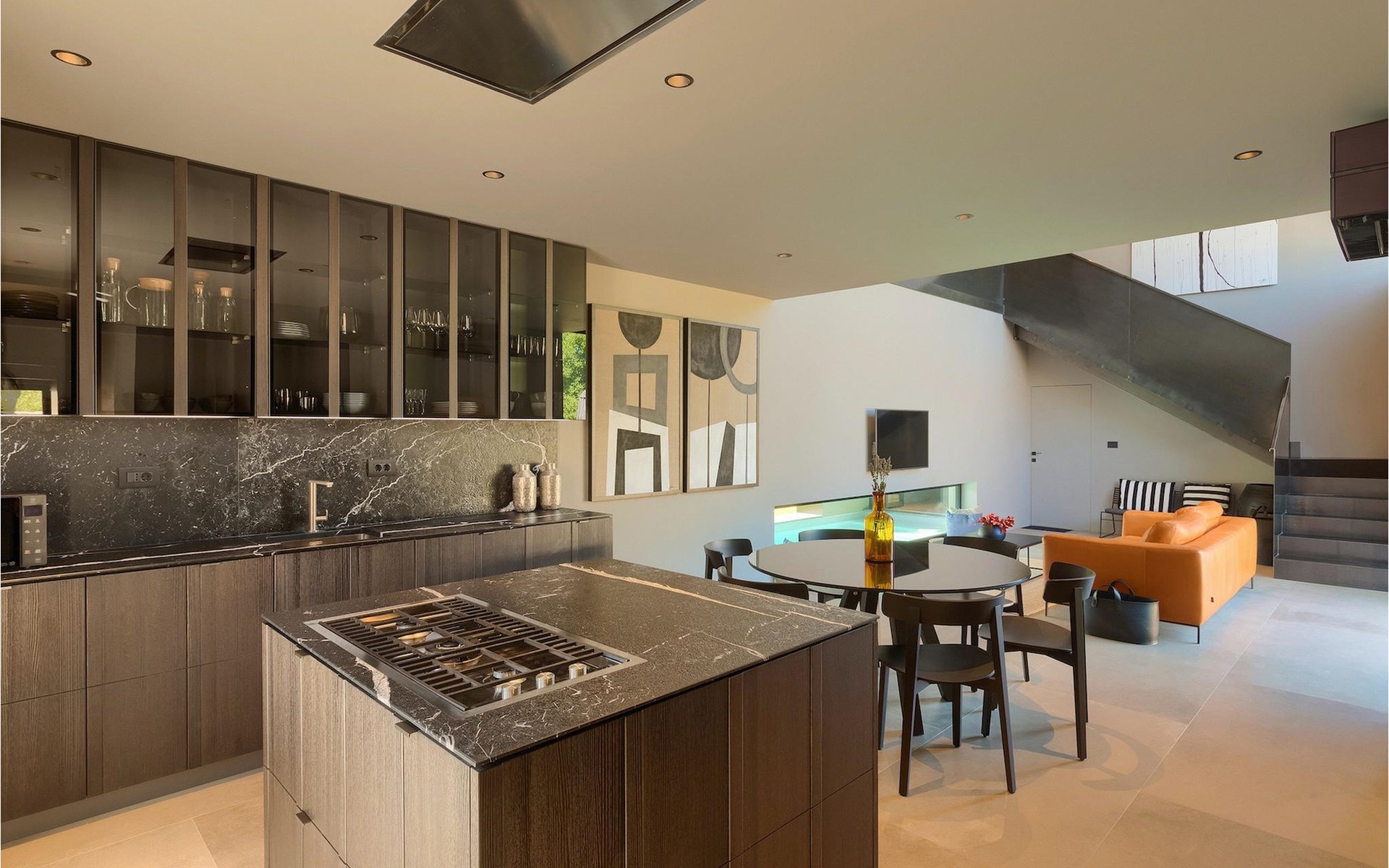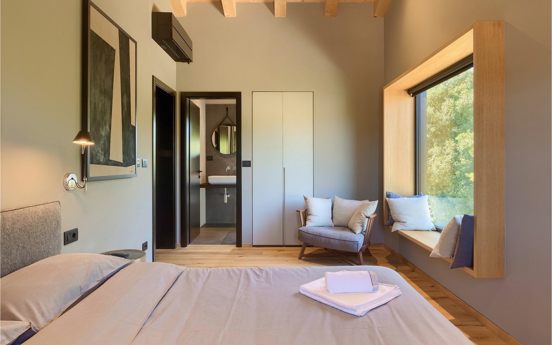 If you take the stairs down to the first floor, you will enter the living and dining area and the fully equipped kitchen. If you prefer to dine al fresco, there is a gas barbecue and an outdoor kitchen with a dining table for 6 people, just a few steps away from the living room. An attractive feature of the villa is the glass area that separates the living room and the pool. The inviting pool is easily accessible both from the garden and from inside through the wellness area, where a sauna is available.