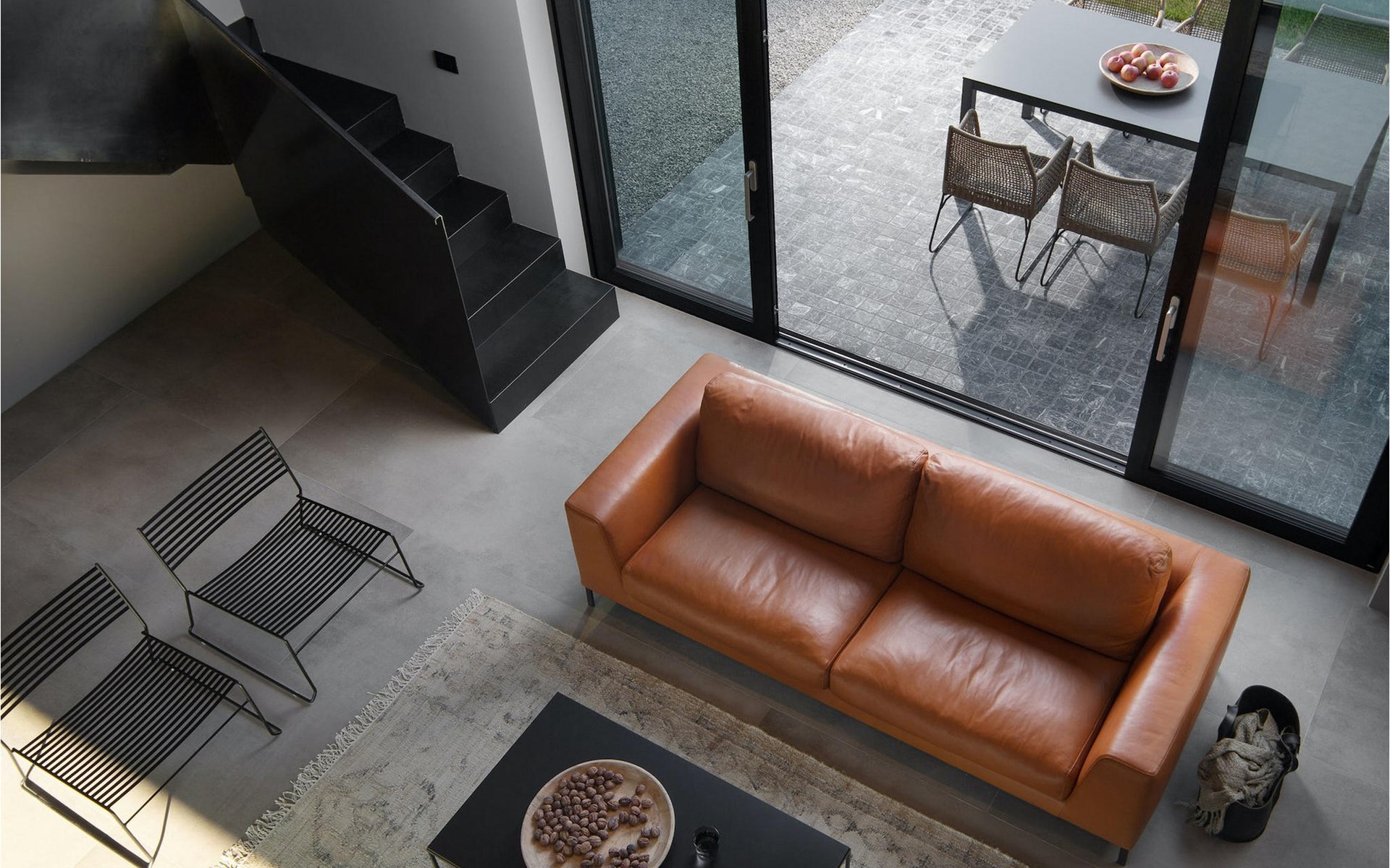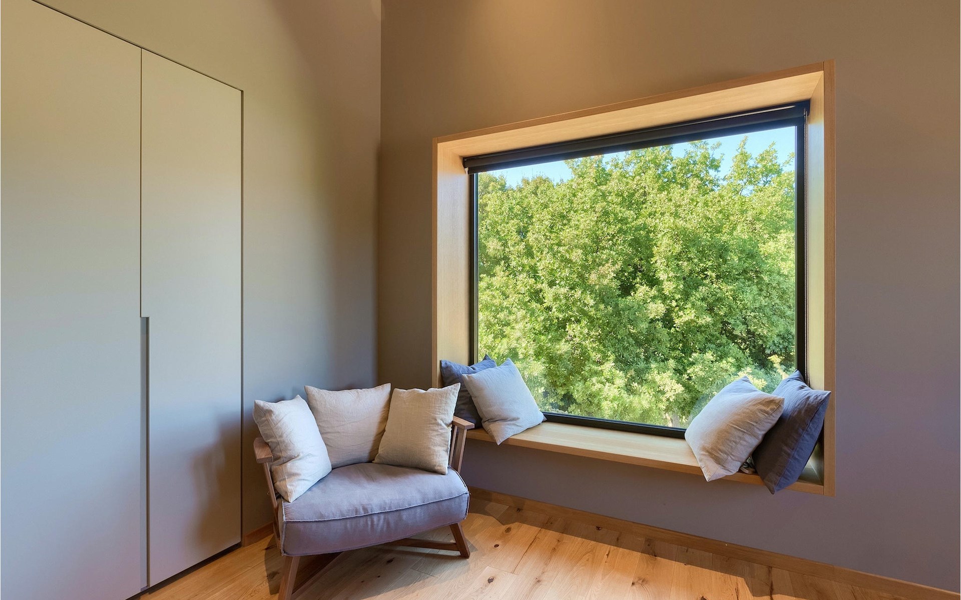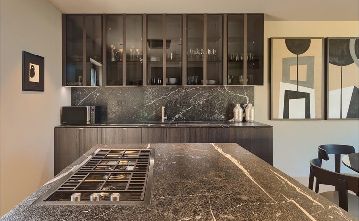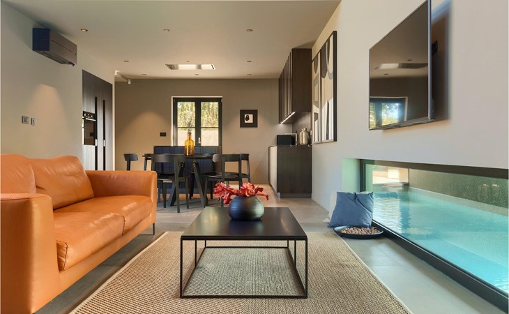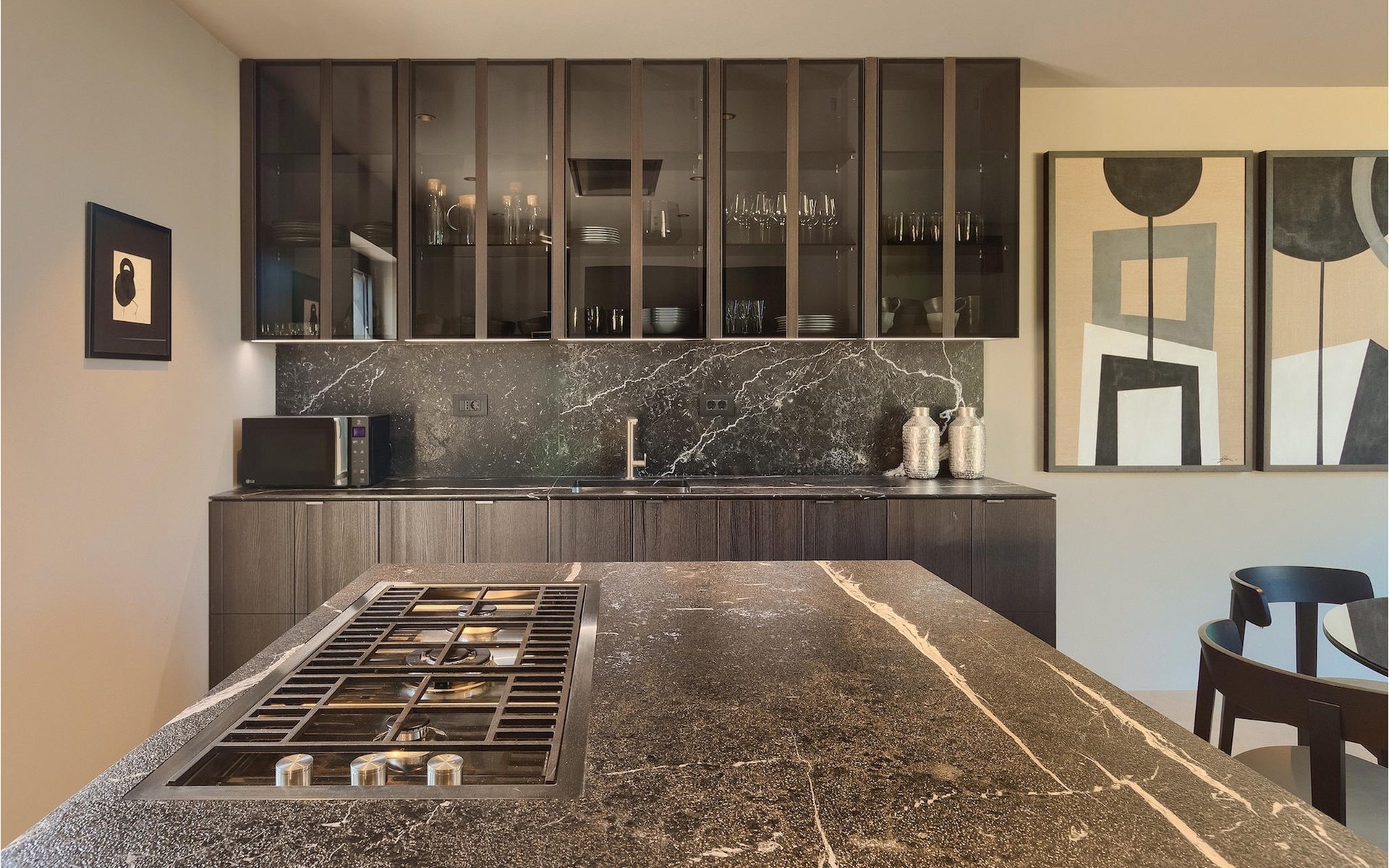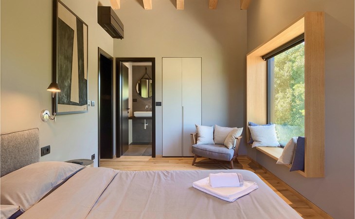 If you take the stairs down to the first floor, you will enter the living and dining area and the fully equipped kitchen. If you prefer to dine al fresco, there is a gas barbecue and an outdoor kitchen with a dining table for 6 people, just a few steps away from the living room. An attractive feature of the villa is the glass area that separates the living room and the pool. The inviting pool is easily accessible both from the garden and from inside through the wellness area, where a sauna is available.