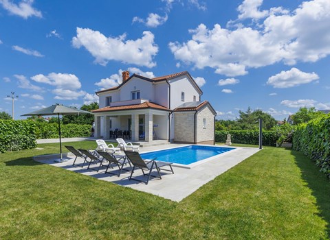 Villa Moderna is a beautiful 3-bedroom vacation home that offers everything for a great and relaxing vacation. The villa is located in a quiet neighborhood in Pula and is only a few kilometers away from the beaches of Pula or the nearby town of Medulin. The villa consists of two floors. The living room and the fully equipped kitchen with dining area are located on the first floor. This area is flooded with light thanks to large glass surfaces and has direct access to the outdoor area with the covered dining area where you can sit together and enjoy al fresco dining. A laundry room and a separate toilet are also located on the first floor. The upper floor consists of three bedrooms. All have a double bed, air conditioning, TV and an en-suite bathroom with shower. The interior of the villa is modern yet simple and cozy, while the outdoor area with private pool provides relaxing moments. In addition, the location offers many opportunities for an active vacation.Villa Moderna is located in the southern part of vIstria, just a few kilometers from Pula. Pula is one of the most important tourist cities in Istria and offers a variety of attractions for culture lovers. The location of the villa is quite convenient - beaches in Medulin are only about 8 km away, while all parts of the city of Pula and all amenities that Pula offers are nearby. In the surrounding area you can visit beautiful small Istrian towns, explore natural beaches and go hiking, cycling or diving. Be sure to try Istrian specialties during your stay. One of the nearby places worth visiting is definitely Rt Kamenjak.
