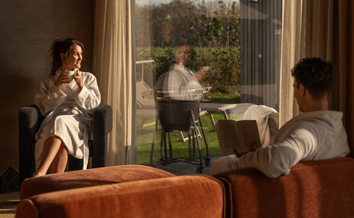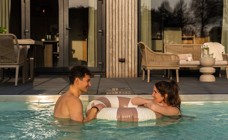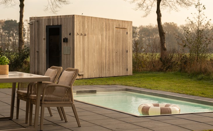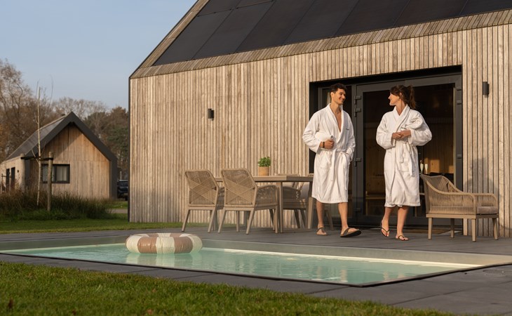This holiday home has more amenities than you can imagine; One bedroom has a lovely double bed, the other a double bunk bed. Both of course with their own bathroom. The house is equipped with a luxury designer kitchen with a filled wine climate cabinet, M-line beds with self-chosen pillows, Nespresso Vertuo machine, sustainable designer furniture, high-quality home automation, climate control and is also incredibly spacious. Your private swimming pool is heated all year round (≈28°C), so enjoy! You can set the house exactly to your mood. Dim lights and sultry music or rather everything open and bring nature inside - everything is possible at the touch of a button.