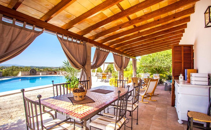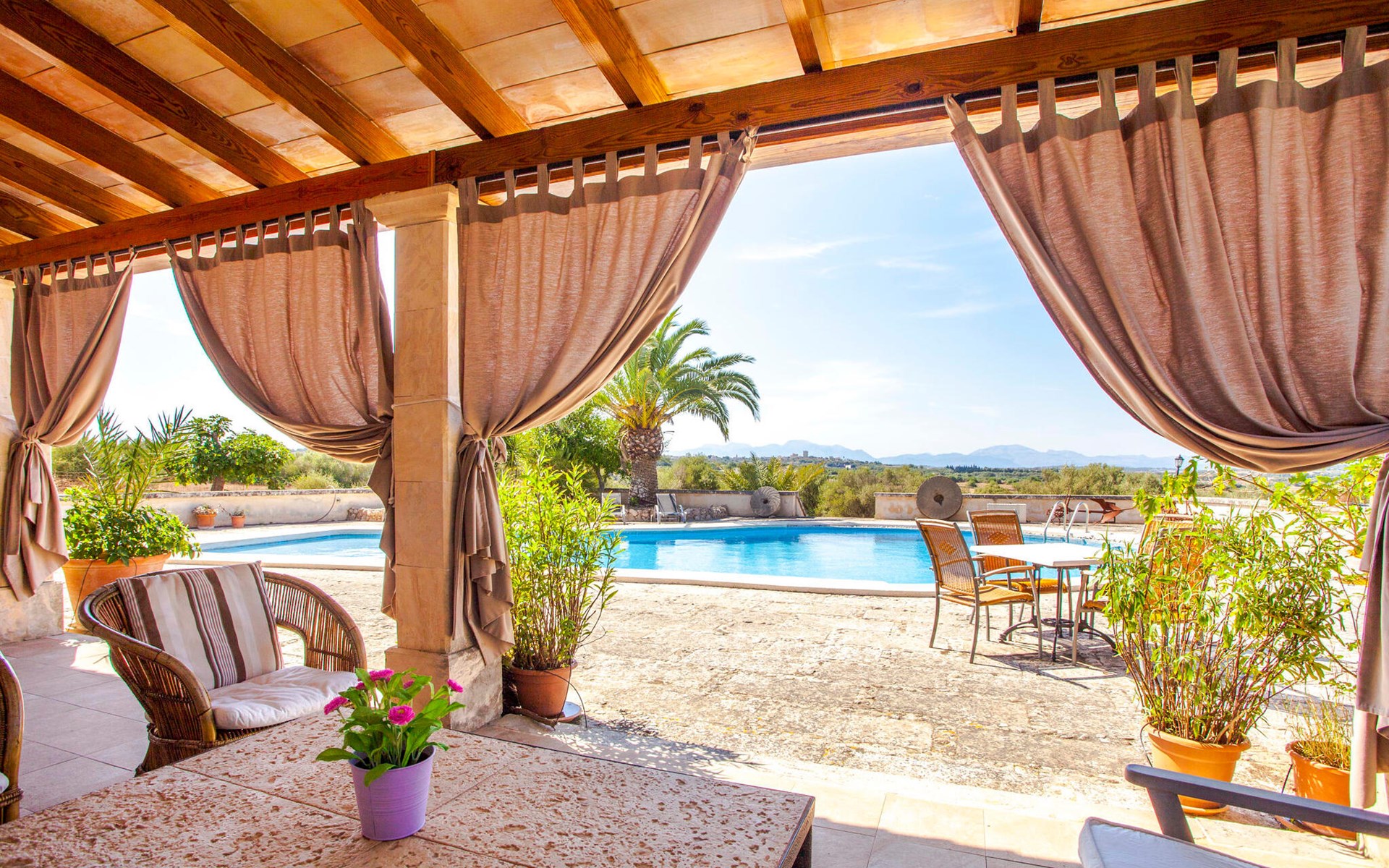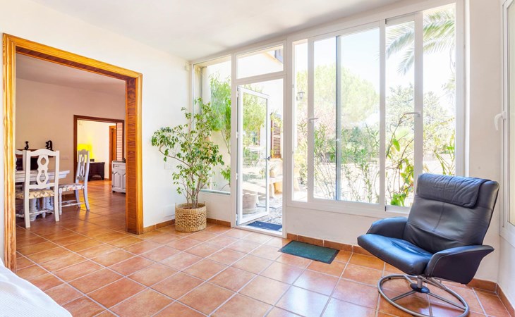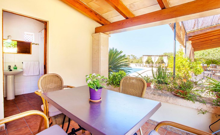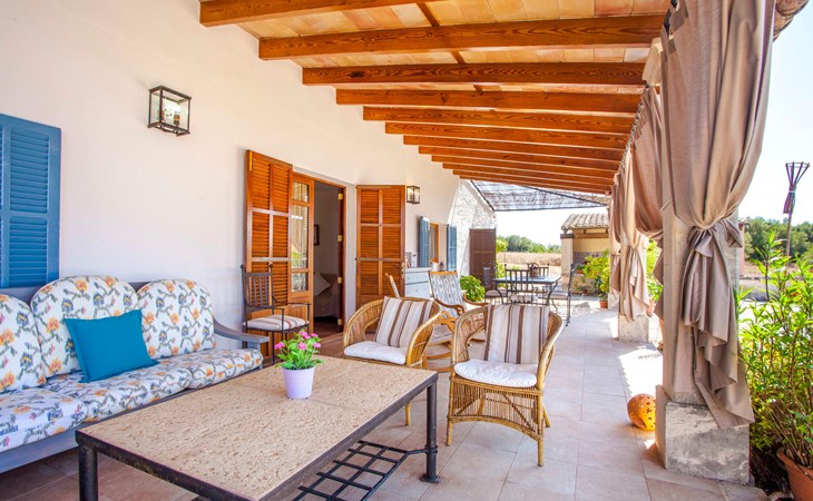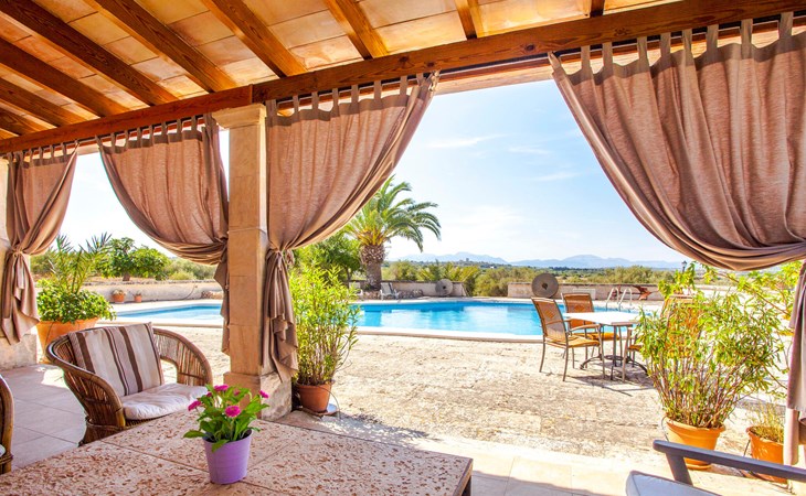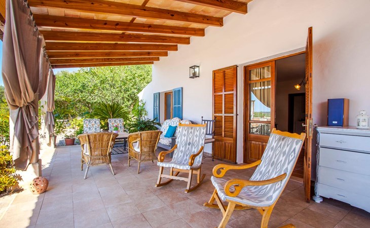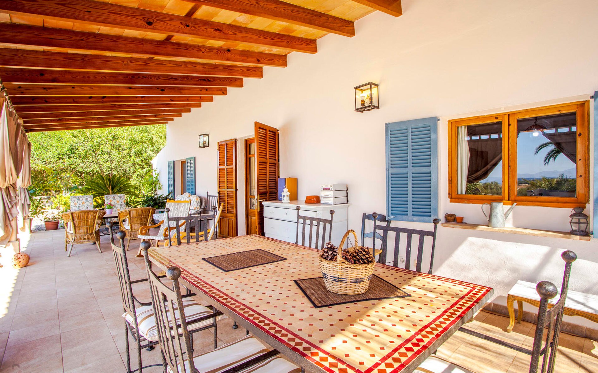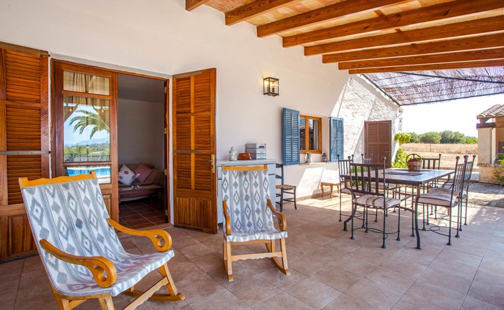 A villa holiday offers the perfect break from the hustle and bustle of the city, especially when the location is as close to nature as this pretty property is: the estate of Villa Son Bachs is surrounded by the rural Mediterranean plain of Pla de Mallorca, over which you can let your gaze wander. The beautifully curved pool is large enough to offer even ambitious swimmers a wonderful refreshment on a sunny day. Afterwards, you can take a break on one of the loungers either under the shade of a palm tree, which exudes tropical flair, or under the shady pergola. The garden combines various qualities, including a wild and romantic touch, while the seating and lounge area resembles a well-tended park. Thanks to the bungalow, which has a convenient outdoor kitchen with a built-in barbecue, the dream of a relaxed barbecue party can be realised in no time at all. There is a dining table right by the pool and another on the covered veranda, which also has a cosy seating area and a rocking chair. The covered terrace, which is accessible from the upper floor, invites you to relax in comfort.