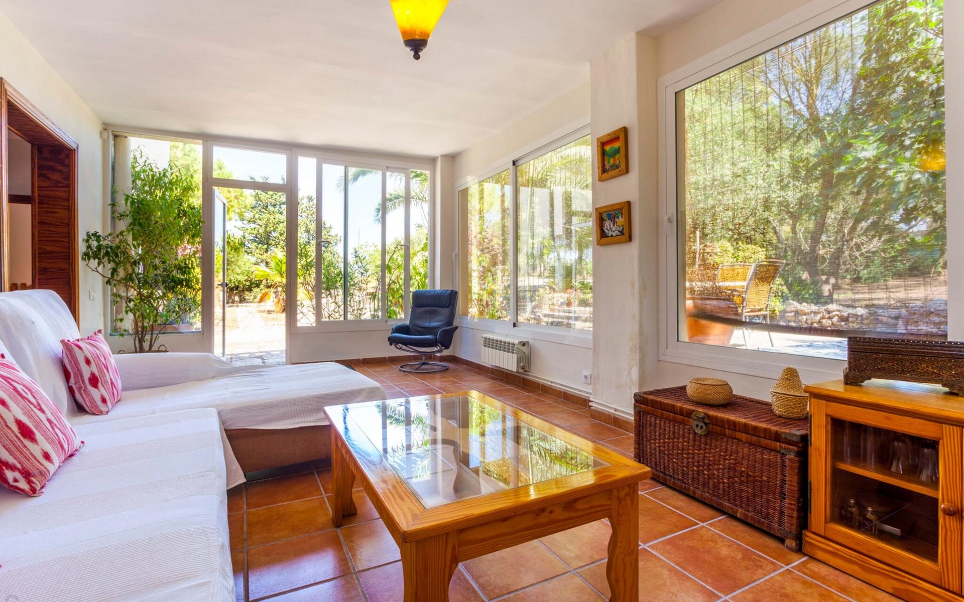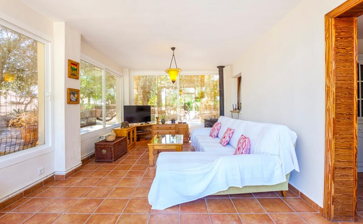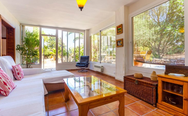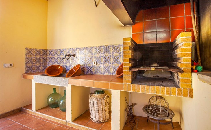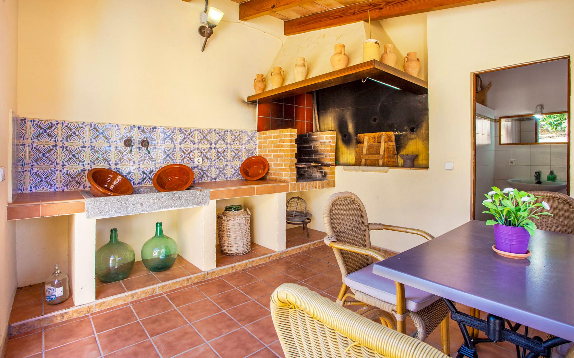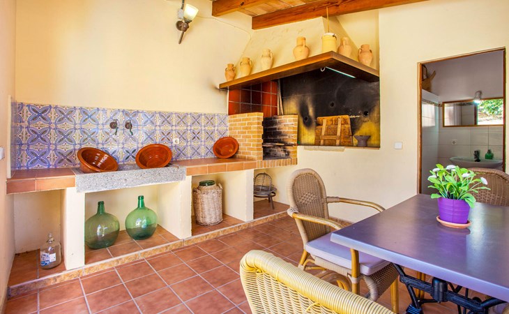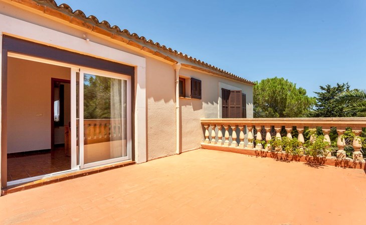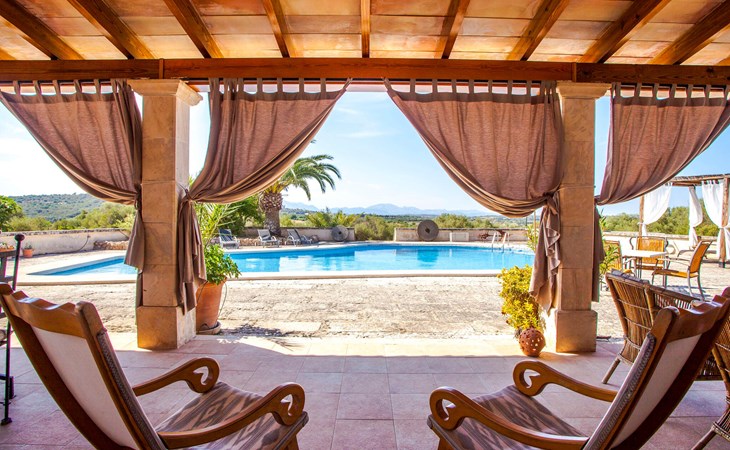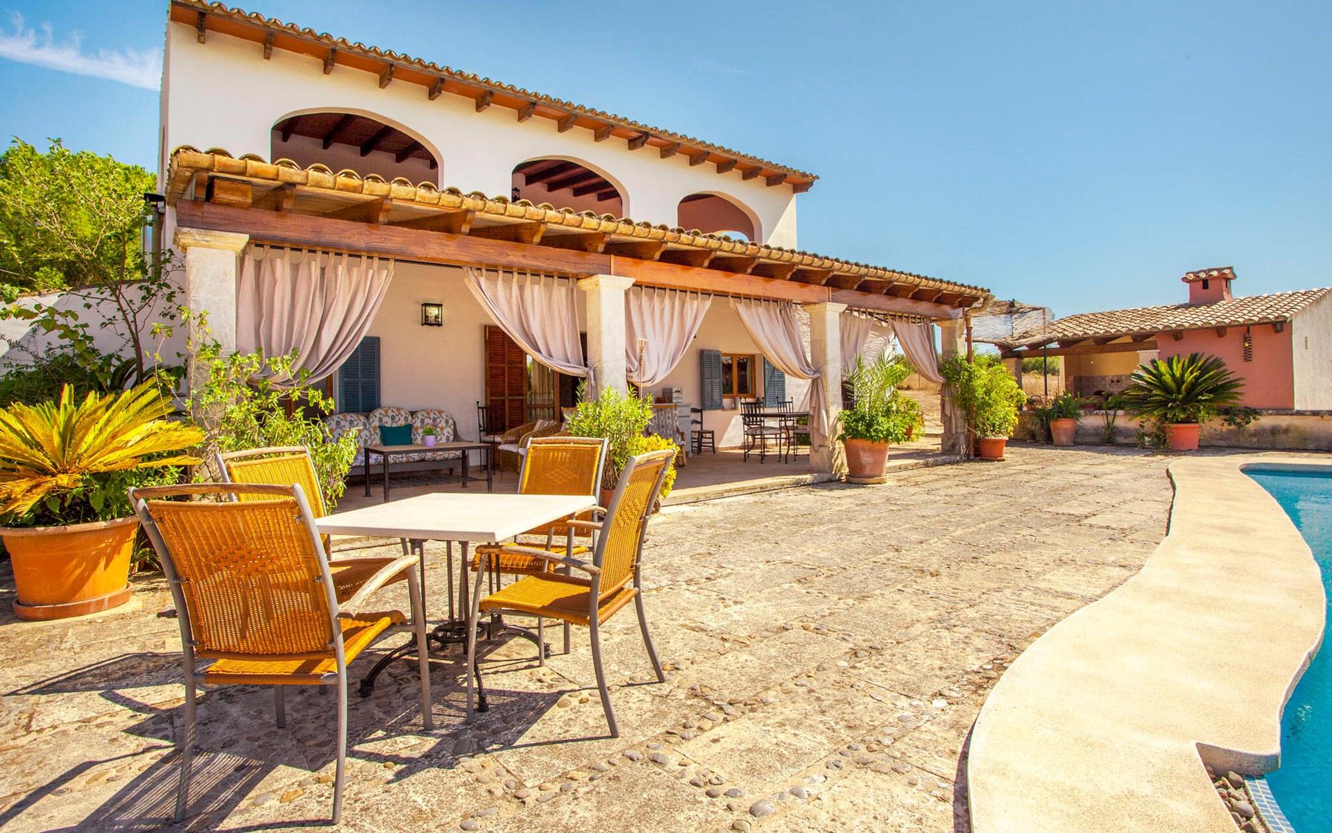 A villa holiday offers the perfect break from the hustle and bustle of the city, especially when the location is as close to nature as this pretty property is: the estate of Villa Son Bachs is surrounded by the rural Mediterranean plain of Pla de Mallorca, over which you can let your gaze wander. The beautifully curved pool is large enough to offer even ambitious swimmers a wonderful refreshment on a sunny day. Afterwards, you can take a break on one of the loungers either under the shade of a palm tree, which exudes tropical flair, or under the shady pergola. The garden combines various qualities, including a wild and romantic touch, while the seating and lounge area resembles a well-tended park. Thanks to the bungalow, which has a convenient outdoor kitchen with a built-in barbecue, the dream of a relaxed barbecue party can be realised in no time at all. There is a dining table right by the pool and another on the covered veranda, which also has a cosy seating area and a rocking chair. The covered terrace, which is accessible from the upper floor, invites you to relax in comfort.