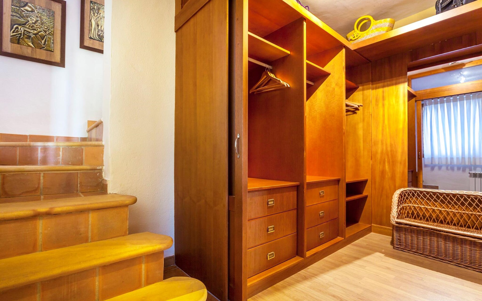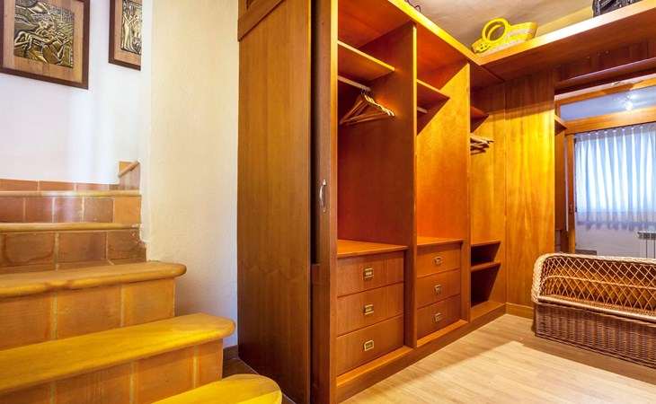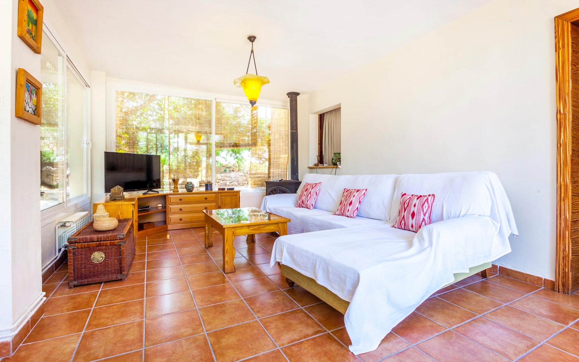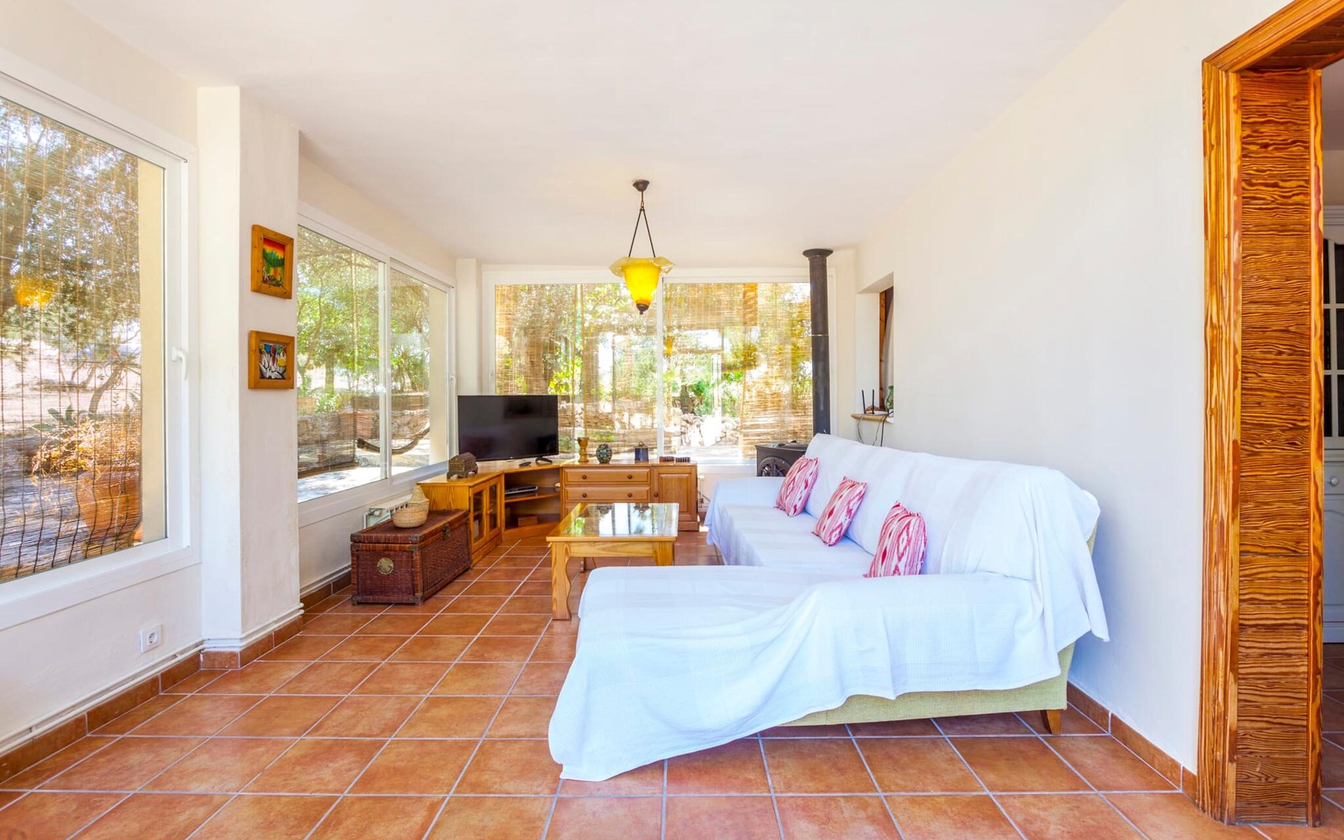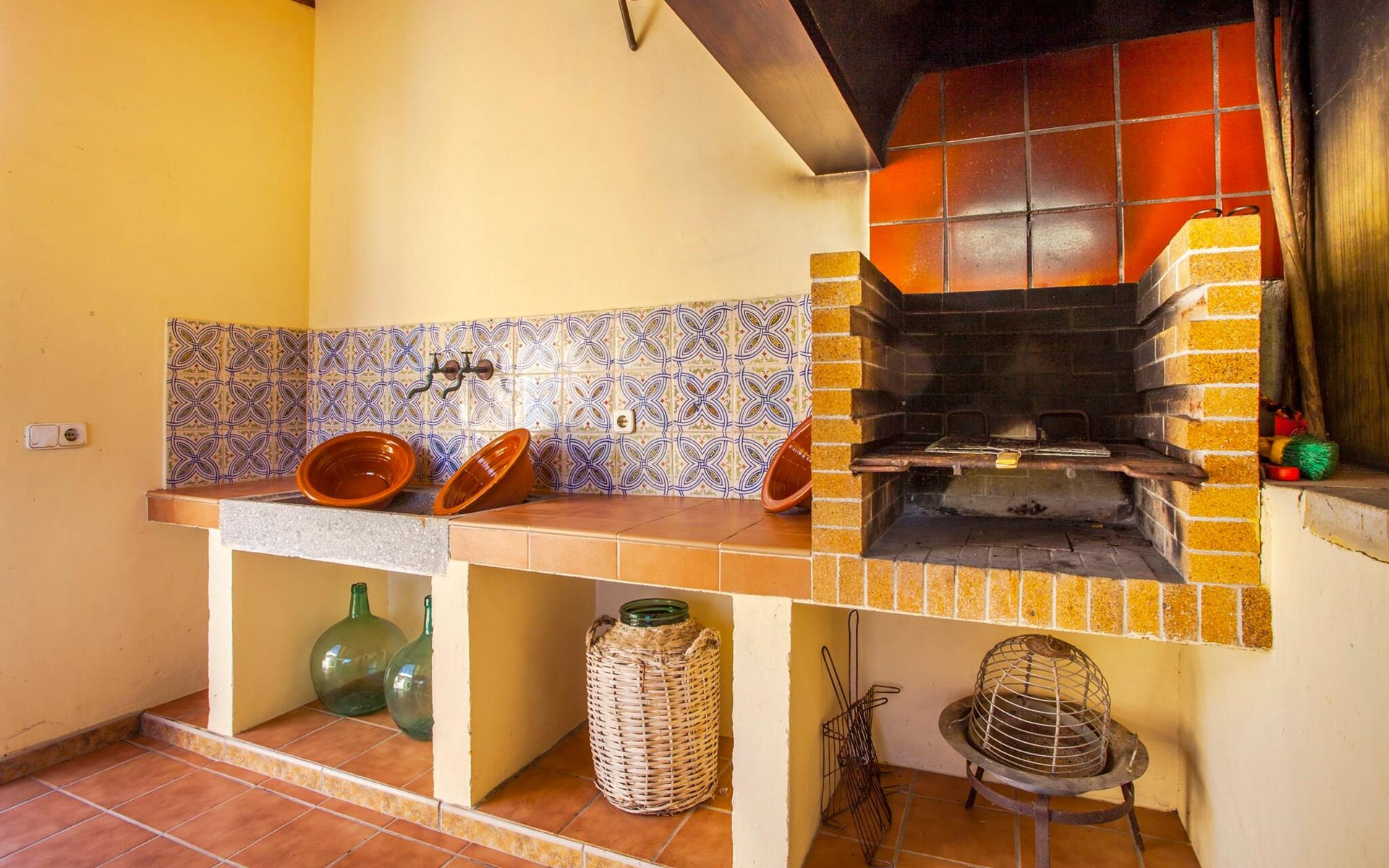 A villa holiday offers the perfect break from the hustle and bustle of the city, especially when the location is as close to nature as this pretty property is: the estate of Villa Son Bachs is surrounded by the rural Mediterranean plain of Pla de Mallorca, over which you can let your gaze wander. The beautifully curved pool is large enough to offer even ambitious swimmers a wonderful refreshment on a sunny day. Afterwards, you can take a break on one of the loungers either under the shade of a palm tree, which exudes tropical flair, or under the shady pergola. The garden combines various qualities, including a wild and romantic touch, while the seating and lounge area resembles a well-tended park. Thanks to the bungalow, which has a convenient outdoor kitchen with a built-in barbecue, the dream of a relaxed barbecue party can be realised in no time at all. There is a dining table right by the pool and another on the covered veranda, which also has a cosy seating area and a rocking chair. The covered terrace, which is accessible from the upper floor, invites you to relax in comfort.