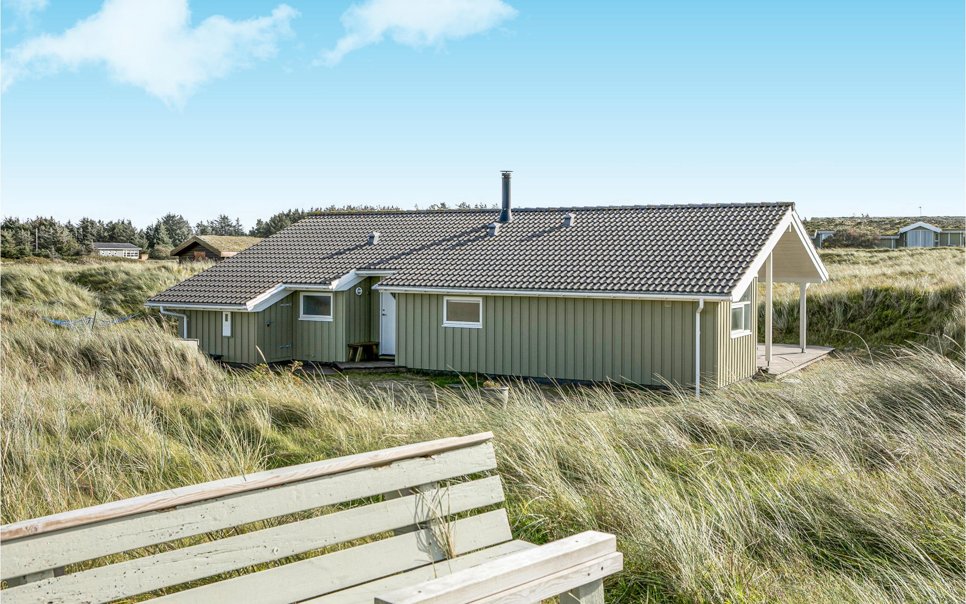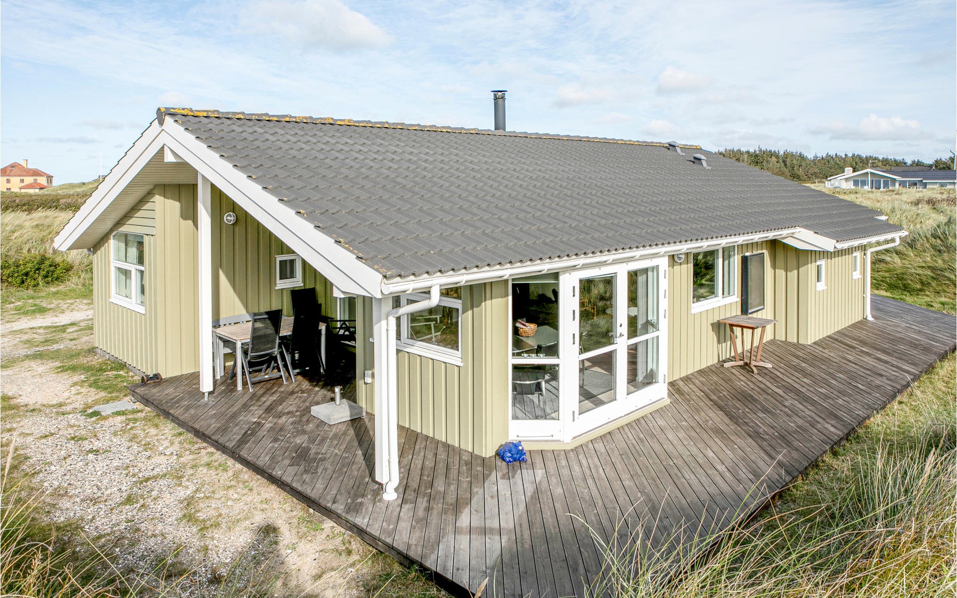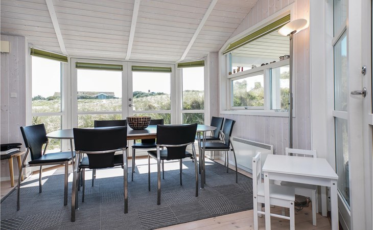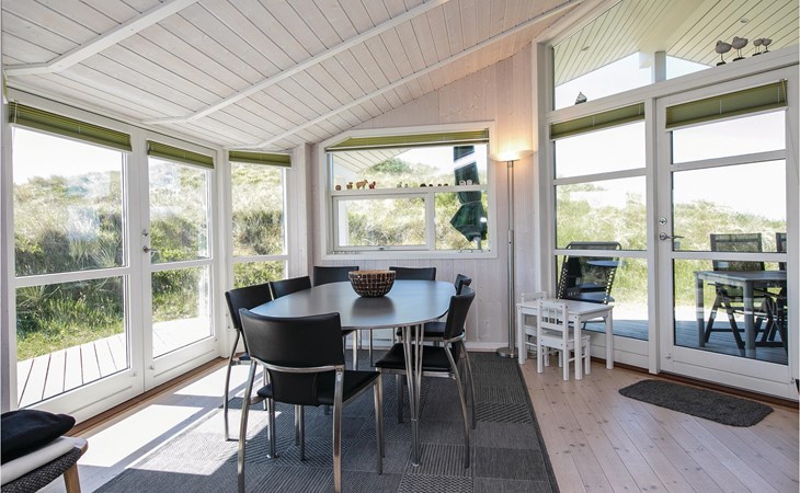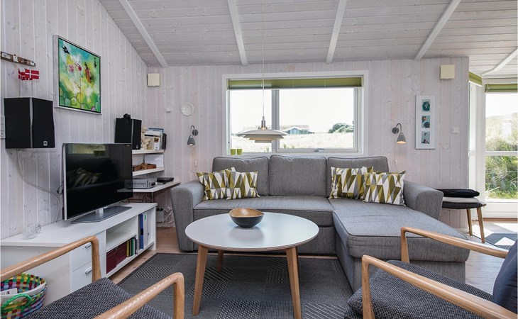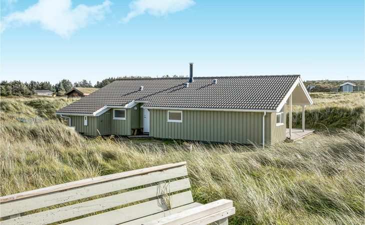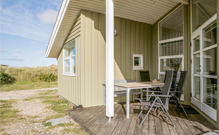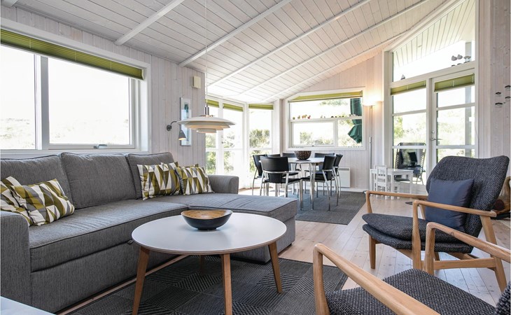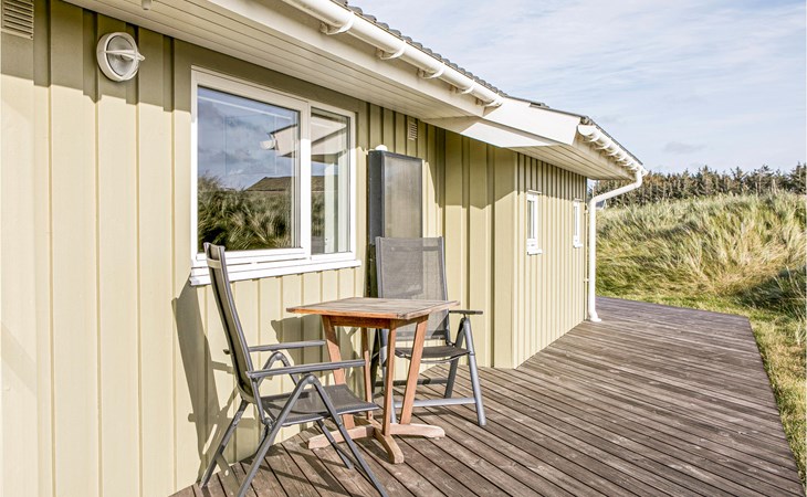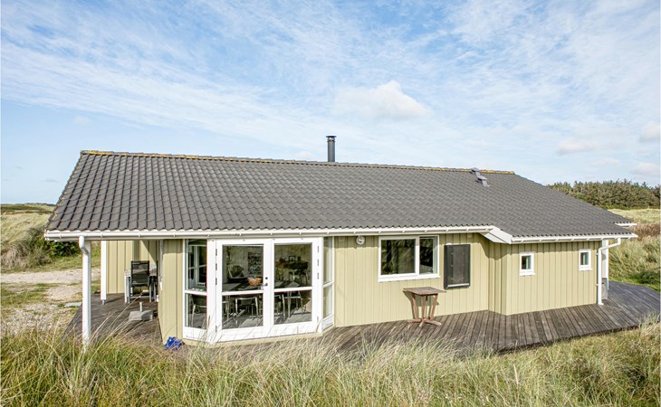 In the naturally beautiful Grønhøj, located between the seaside towns of Løkken and Blokhus, you will find this luxury house. From the hallway you enter a kitchen, which is open to the dining area and the living room. The large window sections provide plenty of light in the living room and through them you can fully enjoy the view. The living room and bedrooms have wooden floors and the rest of the rooms have clinker floors. A large wooden terrace surrounds most of the house. From a hilltop on the property you have a great panoramic view over dunes and sea.