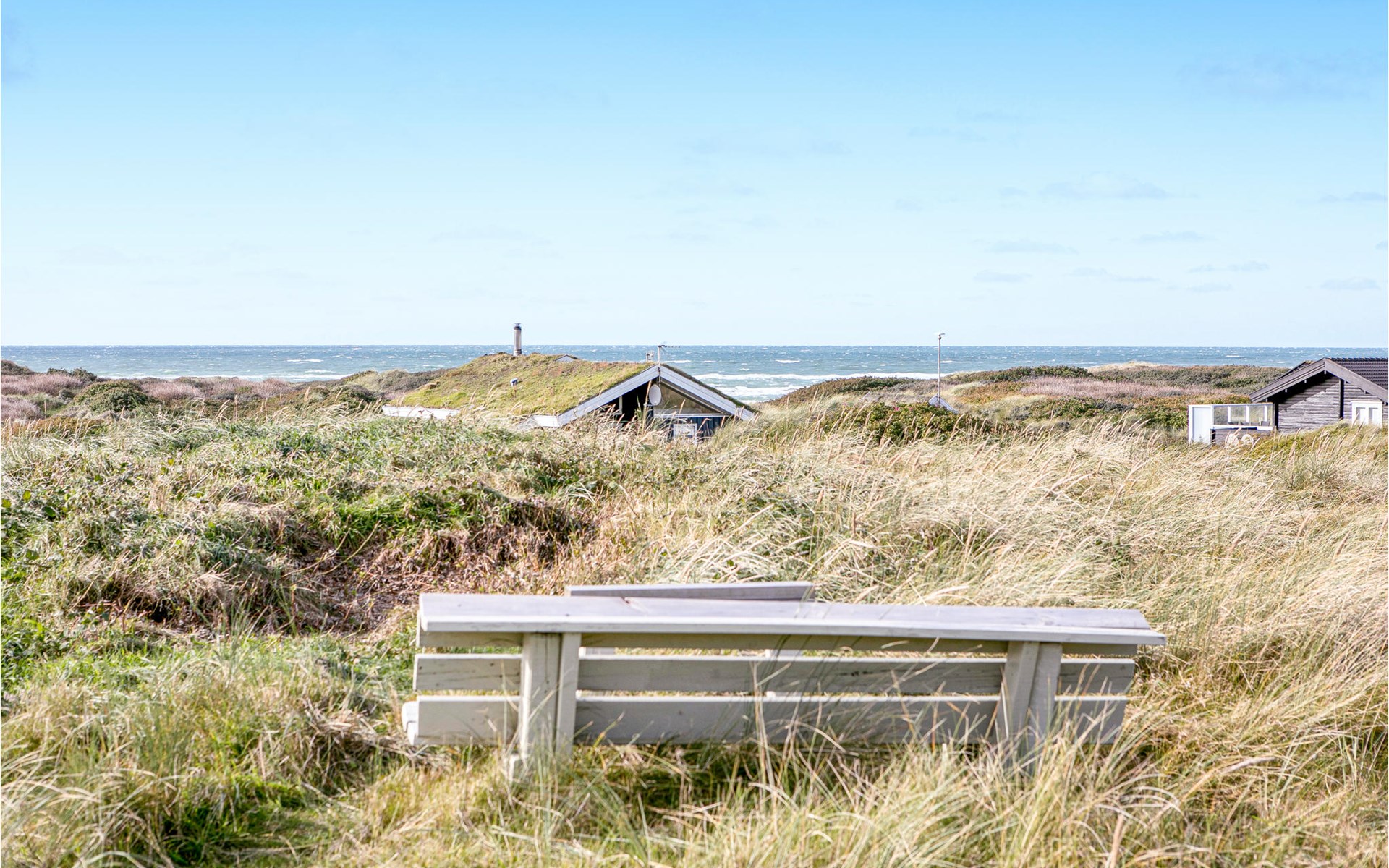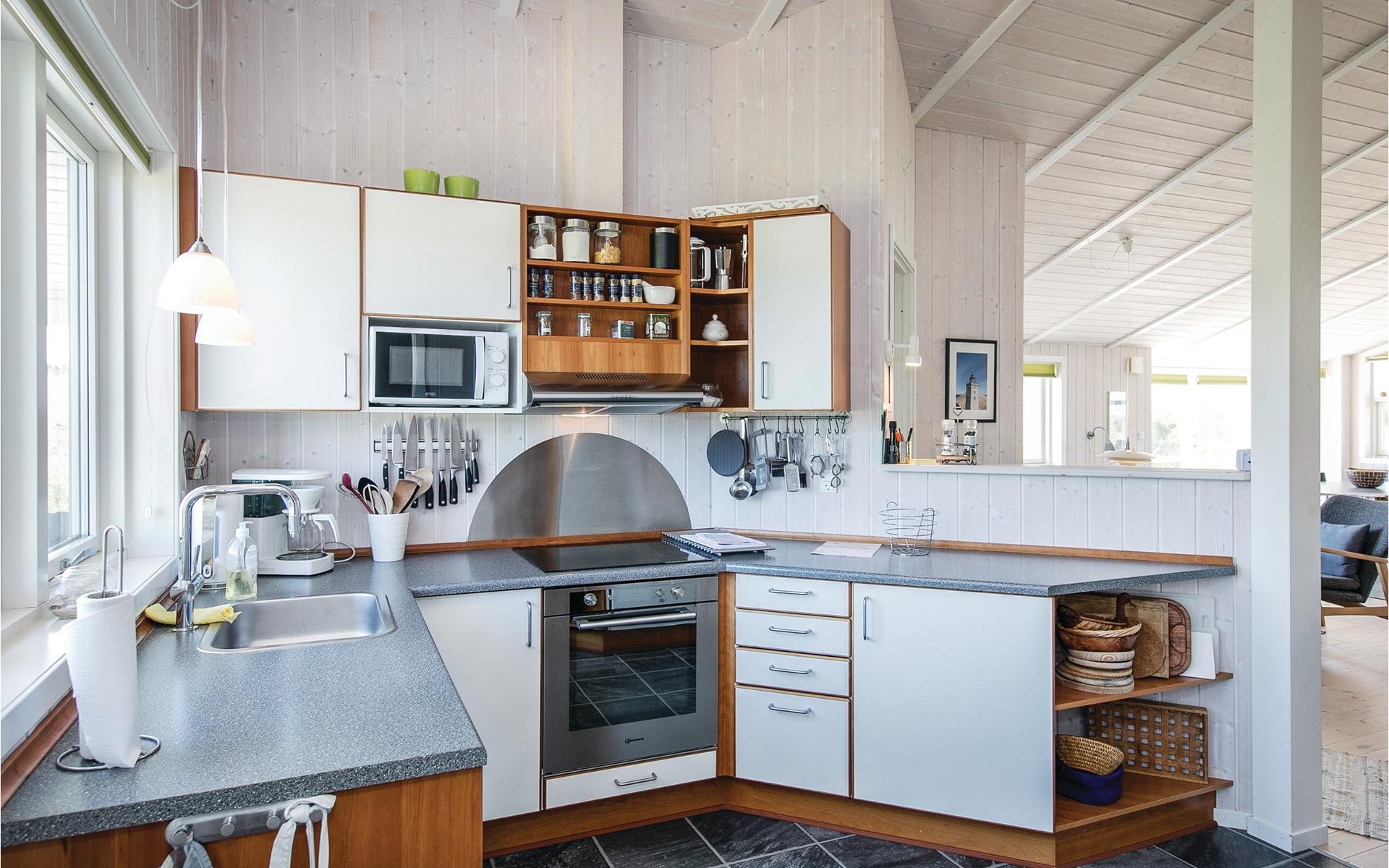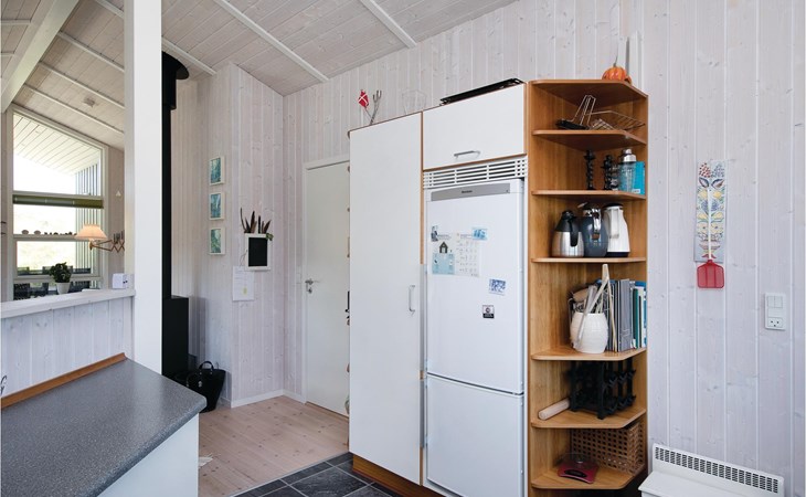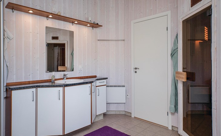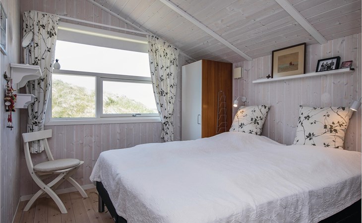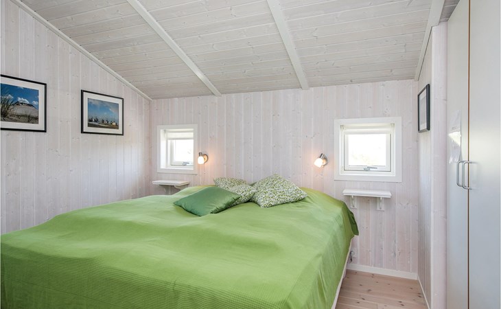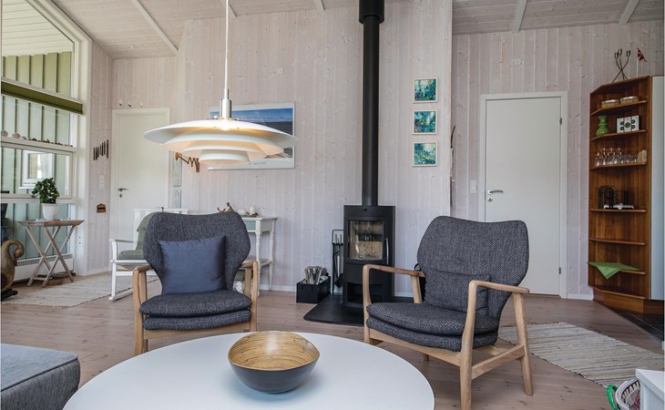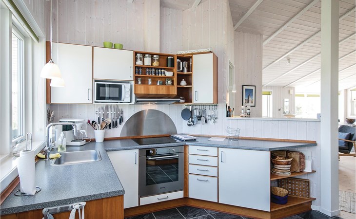 In the naturally beautiful Grønhøj, located between the seaside towns of Løkken and Blokhus, you will find this luxury house. From the hallway you enter a kitchen, which is open to the dining area and the living room. The large window sections provide plenty of light in the living room and through them you can fully enjoy the view. The living room and bedrooms have wooden floors and the rest of the rooms have clinker floors. A large wooden terrace surrounds most of the house. From a hilltop on the property you have a great panoramic view over dunes and sea.