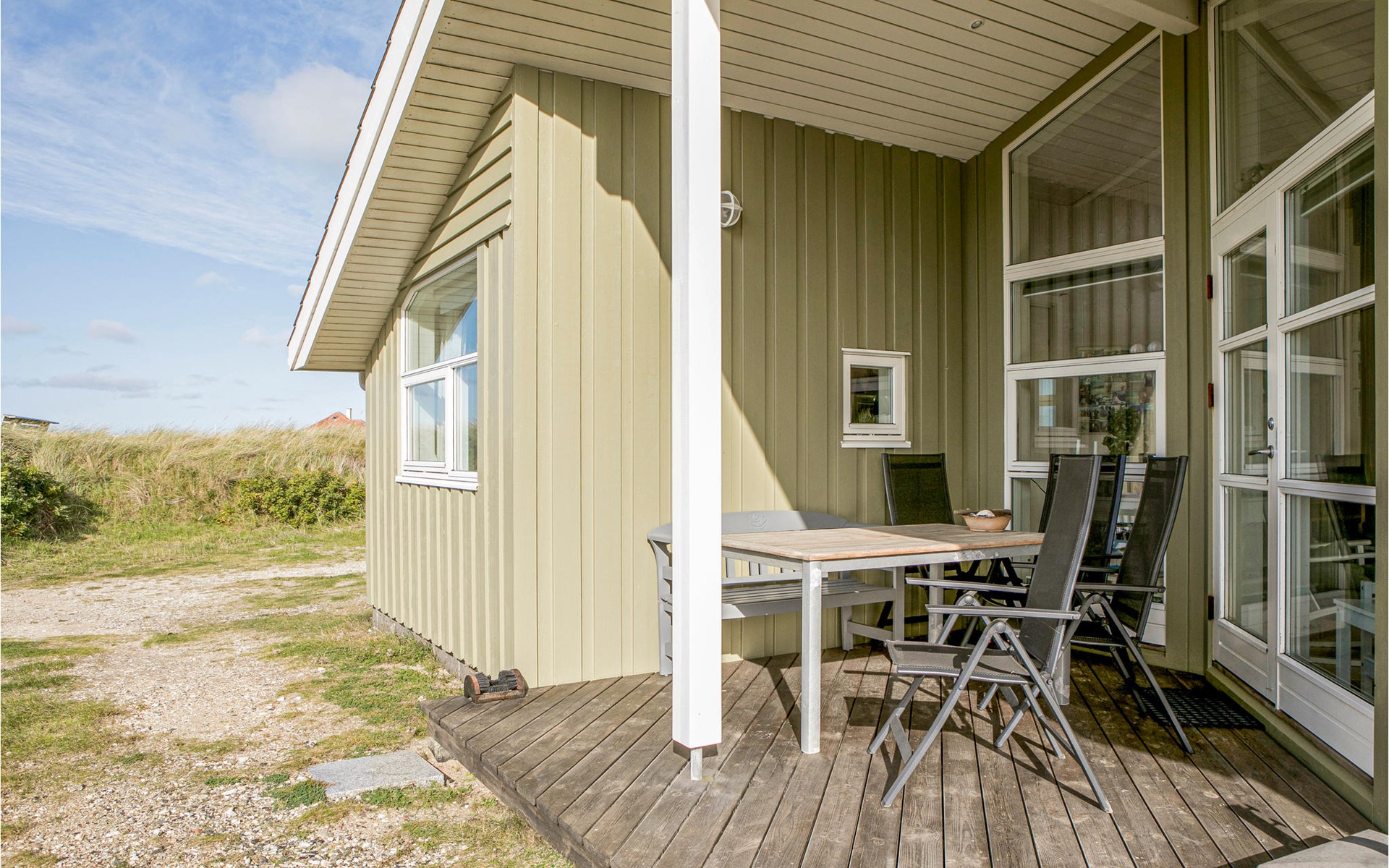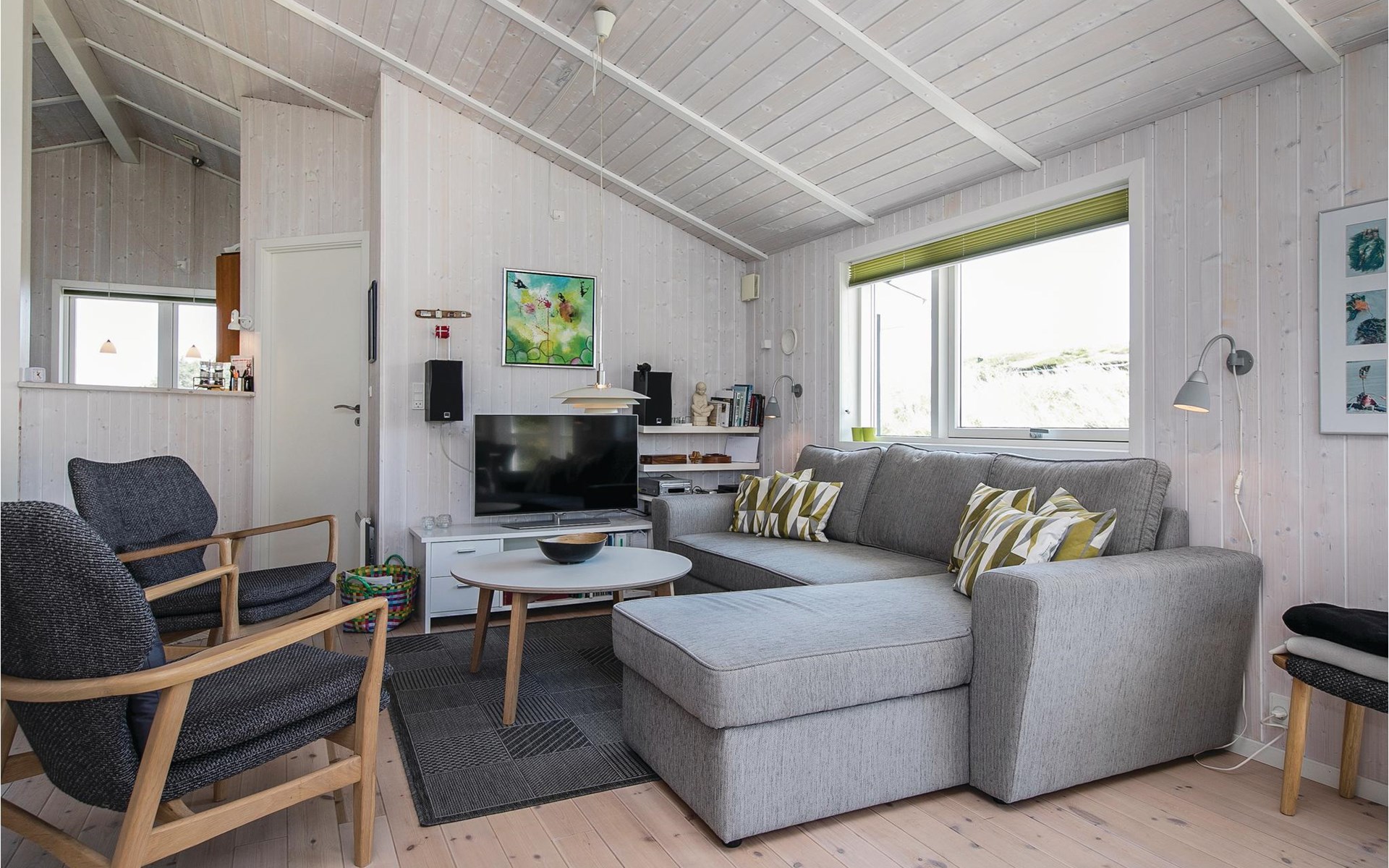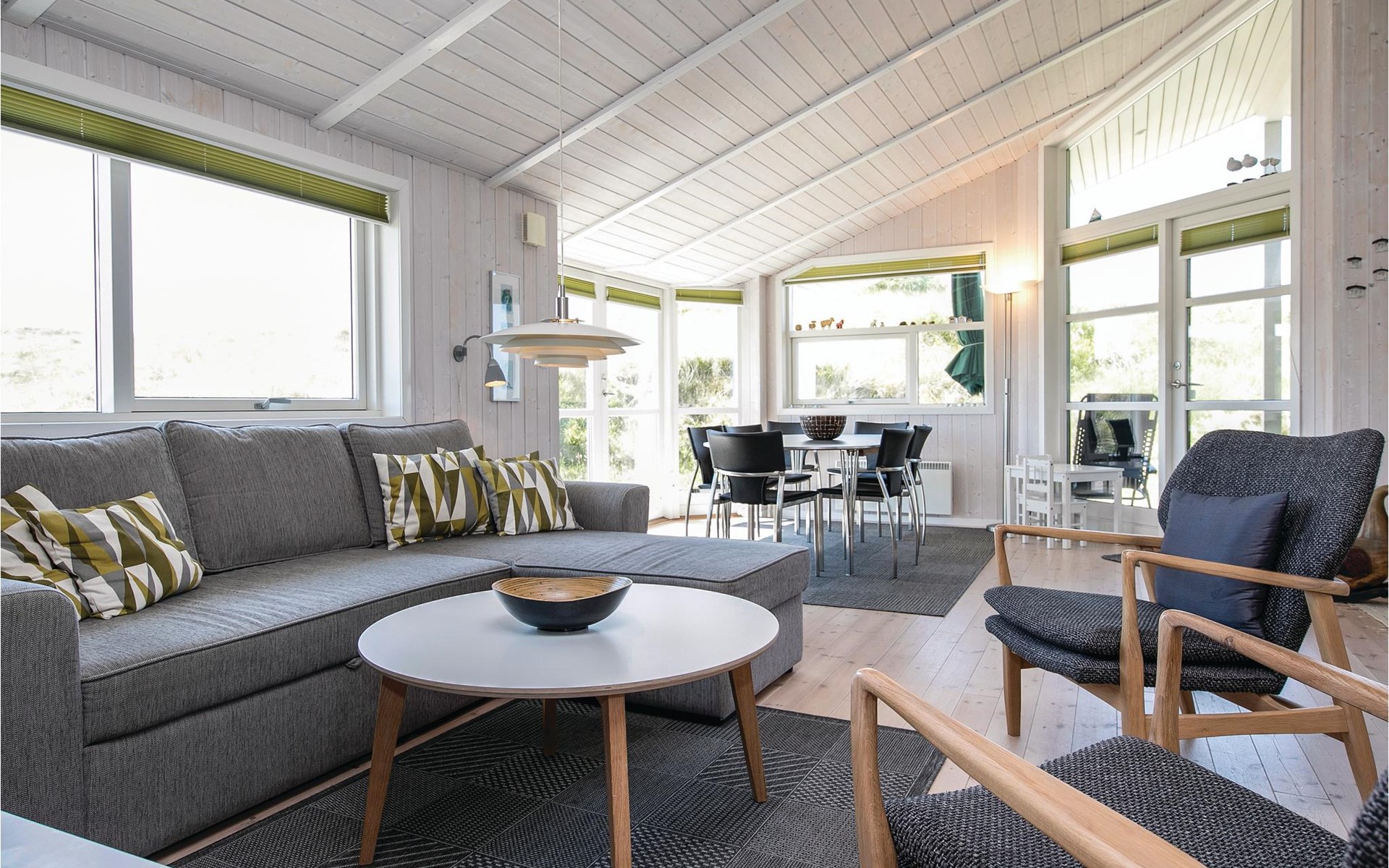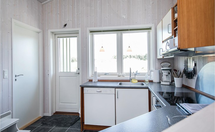 In the naturally beautiful Grønhøj, located between the seaside towns of Løkken and Blokhus, you will find this luxury house. From the hallway you enter a kitchen, which is open to the dining area and the living room. The large window sections provide plenty of light in the living room and through them you can fully enjoy the view. The living room and bedrooms have wooden floors and the rest of the rooms have clinker floors. A large wooden terrace surrounds most of the house. From a hilltop on the property you have a great panoramic view over dunes and sea.