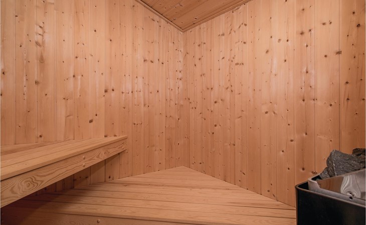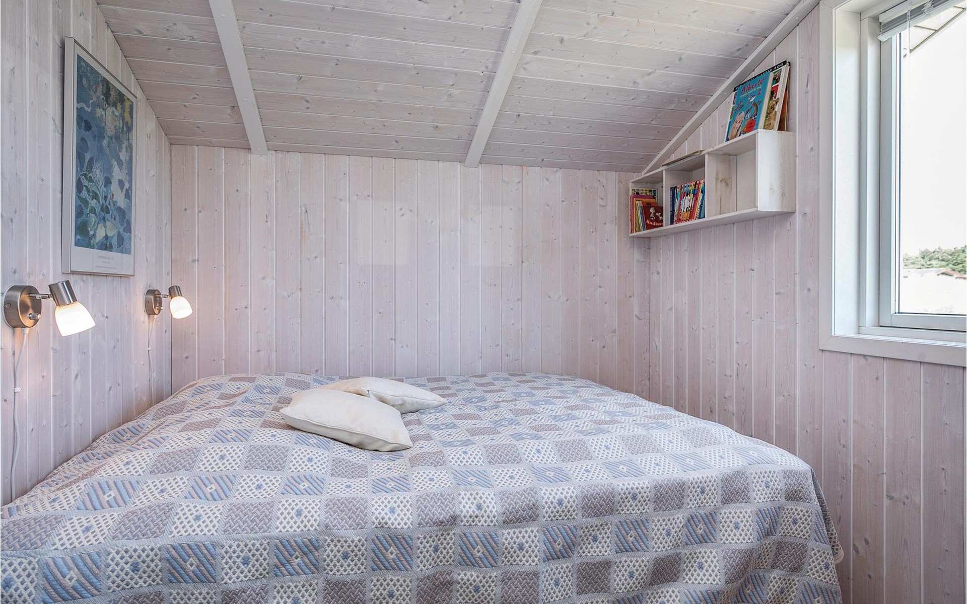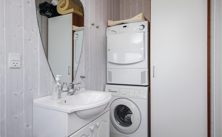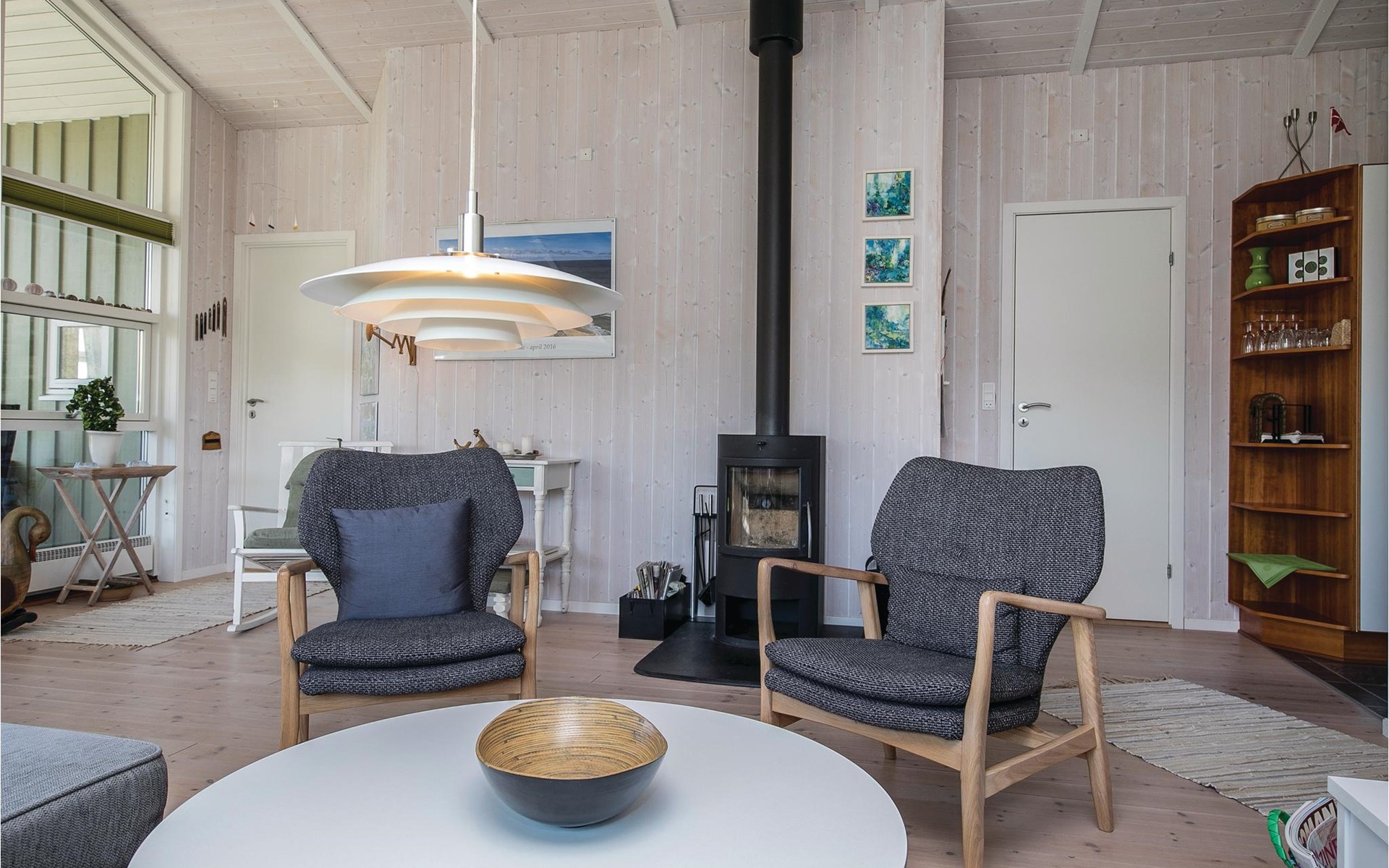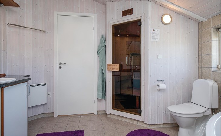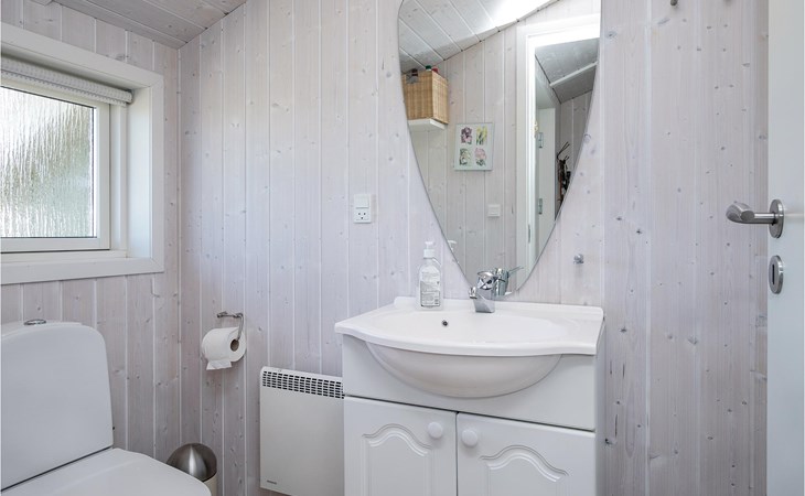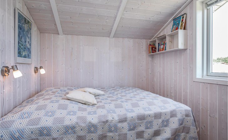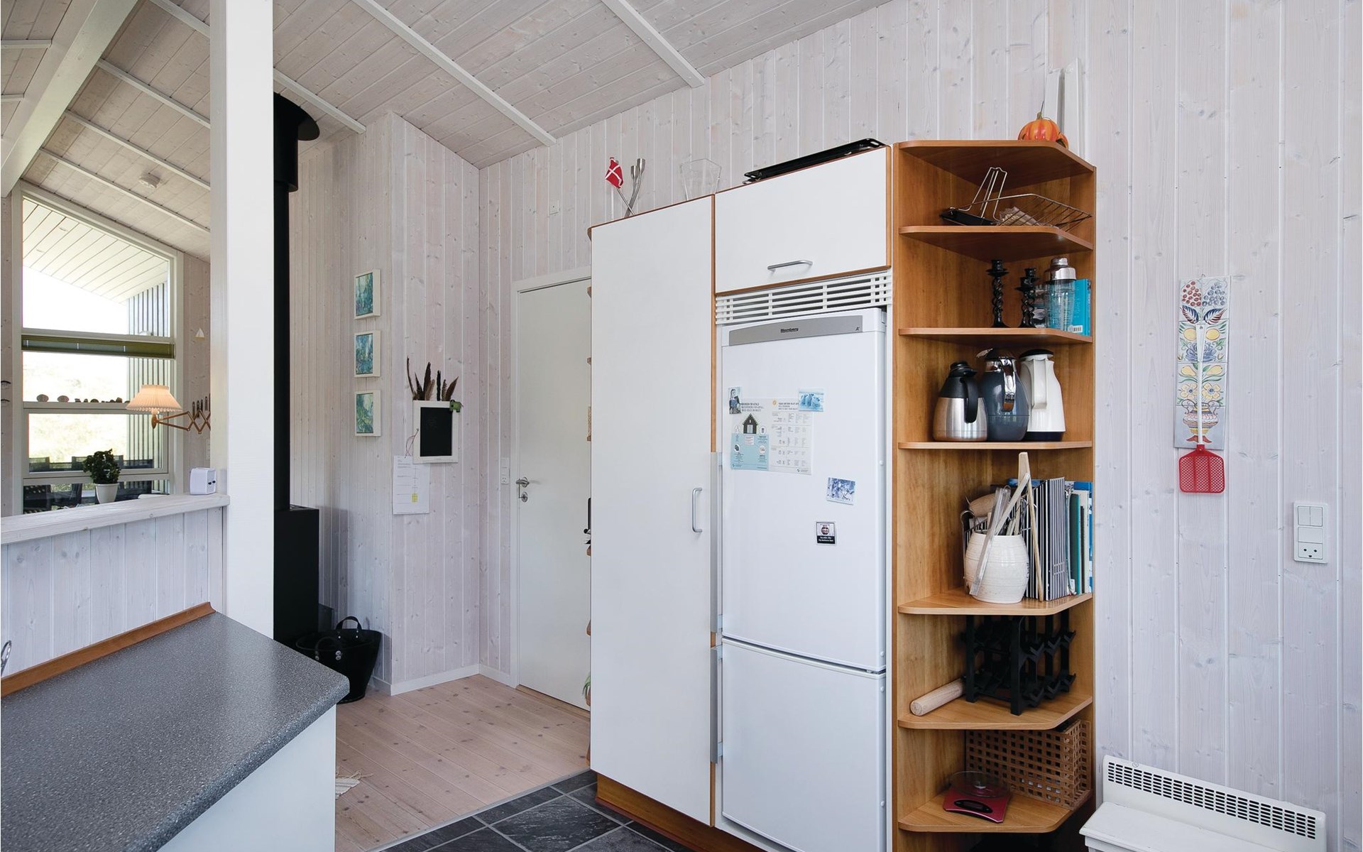 In the naturally beautiful Grønhøj, located between the seaside towns of Løkken and Blokhus, you will find this luxury house. From the hallway you enter a kitchen, which is open to the dining area and the living room. The large window sections provide plenty of light in the living room and through them you can fully enjoy the view. The living room and bedrooms have wooden floors and the rest of the rooms have clinker floors. A large wooden terrace surrounds most of the house. From a hilltop on the property you have a great panoramic view over dunes and sea.