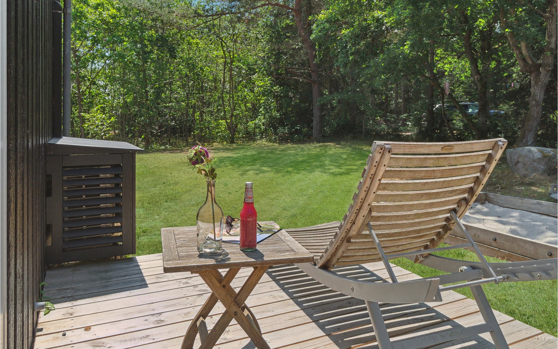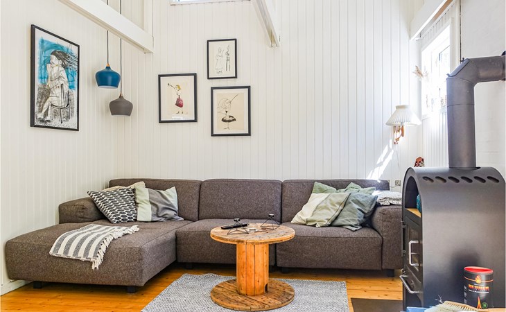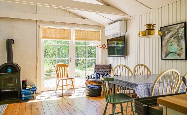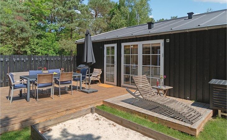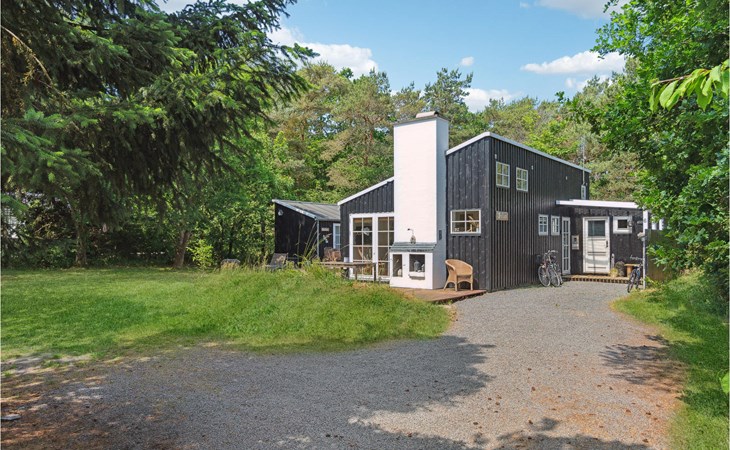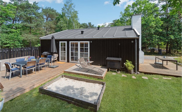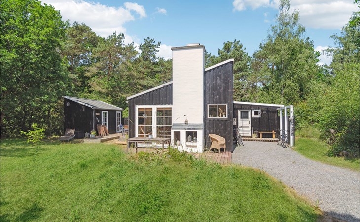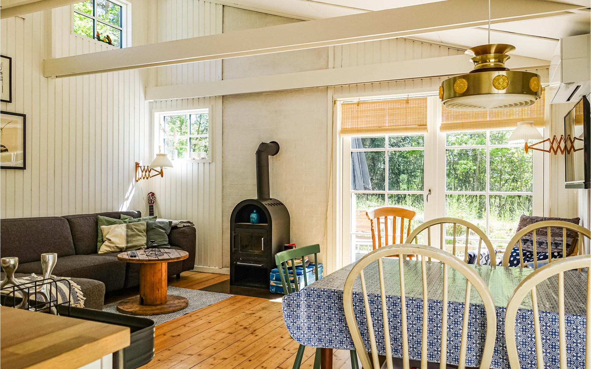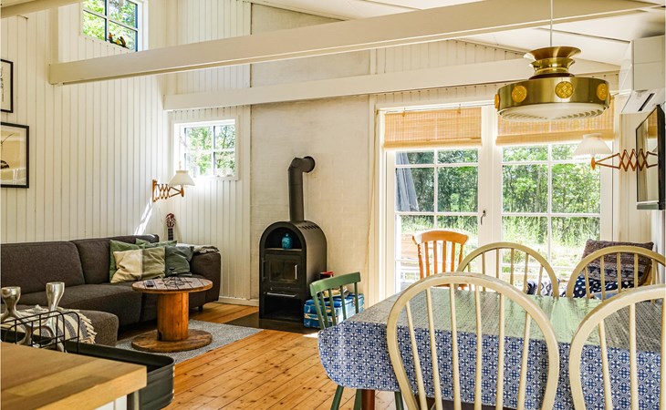 The house is secluded on a beautiful large natural plot, just 600 metres from the child-friendly sandy beach and the cosy surroundings. Relax in the beautiful living room, which is open all the way up to the gable and lets in light from many angles through windows in the ceiling. When it's raining and shivering outside, you can cosy up by the fireplace, and when the sun is shining, simply open the doors and step out into the greenery. You can also look forward to cooking up a storm in the well-equipped kitchen, while the rest of the house has several great facilities including a large bathroom with spa and sauna. In addition to the two bedrooms in the house, there is also a loft and an outbuilding with a double bed.