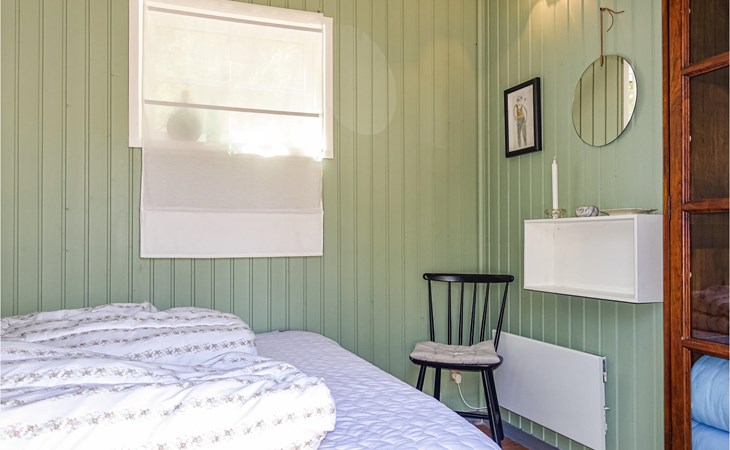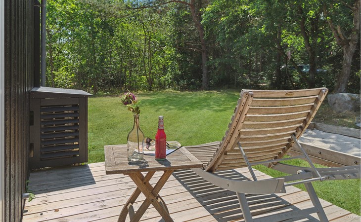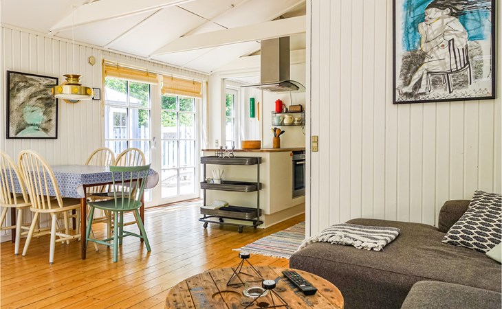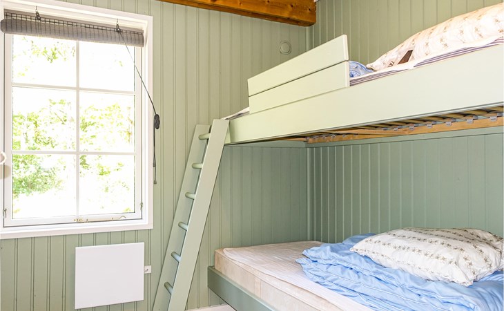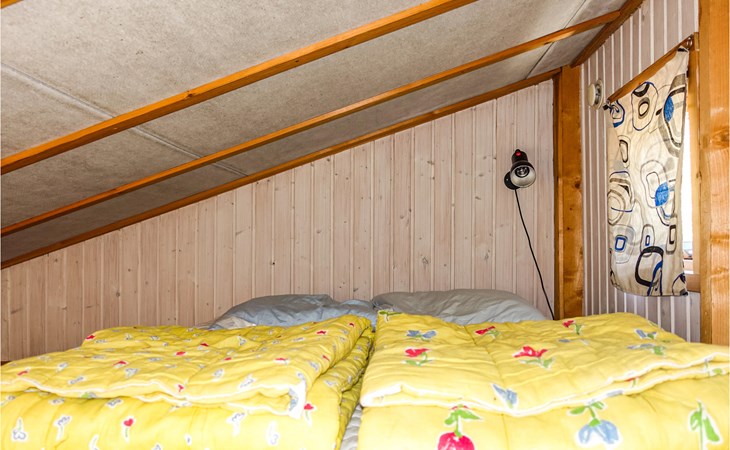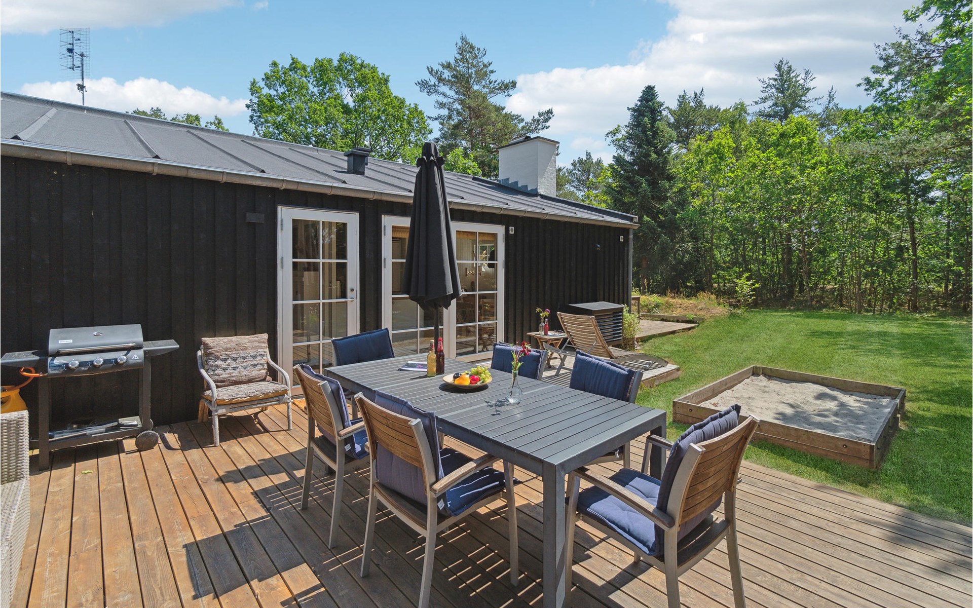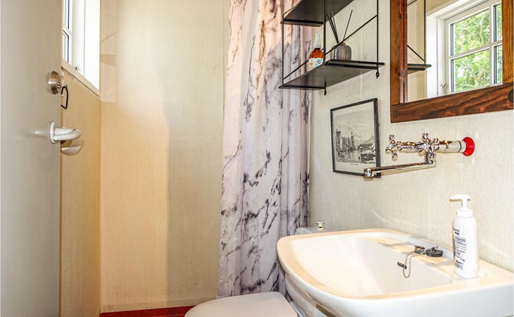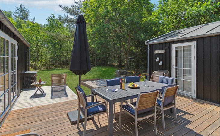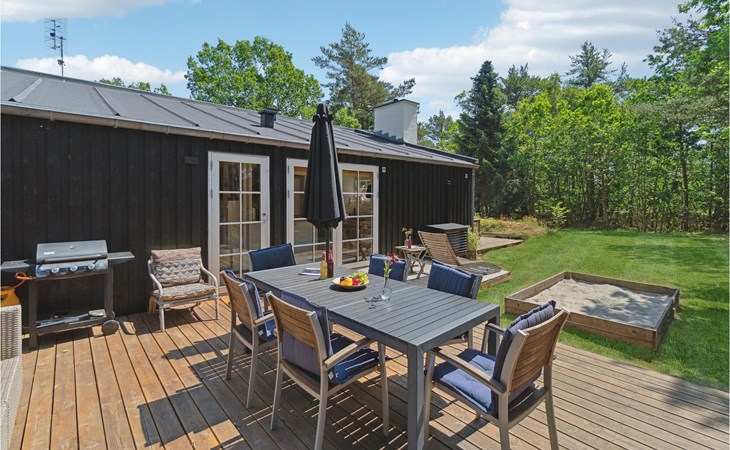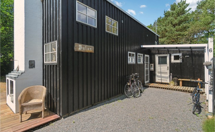 The house is secluded on a beautiful large natural plot, just 600 metres from the child-friendly sandy beach and the cosy surroundings. Relax in the beautiful living room, which is open all the way up to the gable and lets in light from many angles through windows in the ceiling. When it's raining and shivering outside, you can cosy up by the fireplace, and when the sun is shining, simply open the doors and step out into the greenery. You can also look forward to cooking up a storm in the well-equipped kitchen, while the rest of the house has several great facilities including a large bathroom with spa and sauna. In addition to the two bedrooms in the house, there is also a loft and an outbuilding with a double bed.