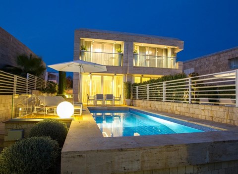 Two of the bedrooms - all with air conditioning and flat screen TVs - are located on the upper floor, with two lovely en-suite bathrooms with underfloor heating and a spacious terrace from where you can enjoy magnificent views over olive groves to the sea. The light-flooded, spacious first floor with its open-plan layout is tastefully divided into kitchen, dining and living areas with a cozy fireplace and forms the social hub of the house. The third bedroom is also located here, also with air conditioning and a flat-screen TV, as well as an en-suite bathroom. Almost all rooms and bathrooms are equipped with ambient LED lighting, which can be individually adjusted to suit the mood.