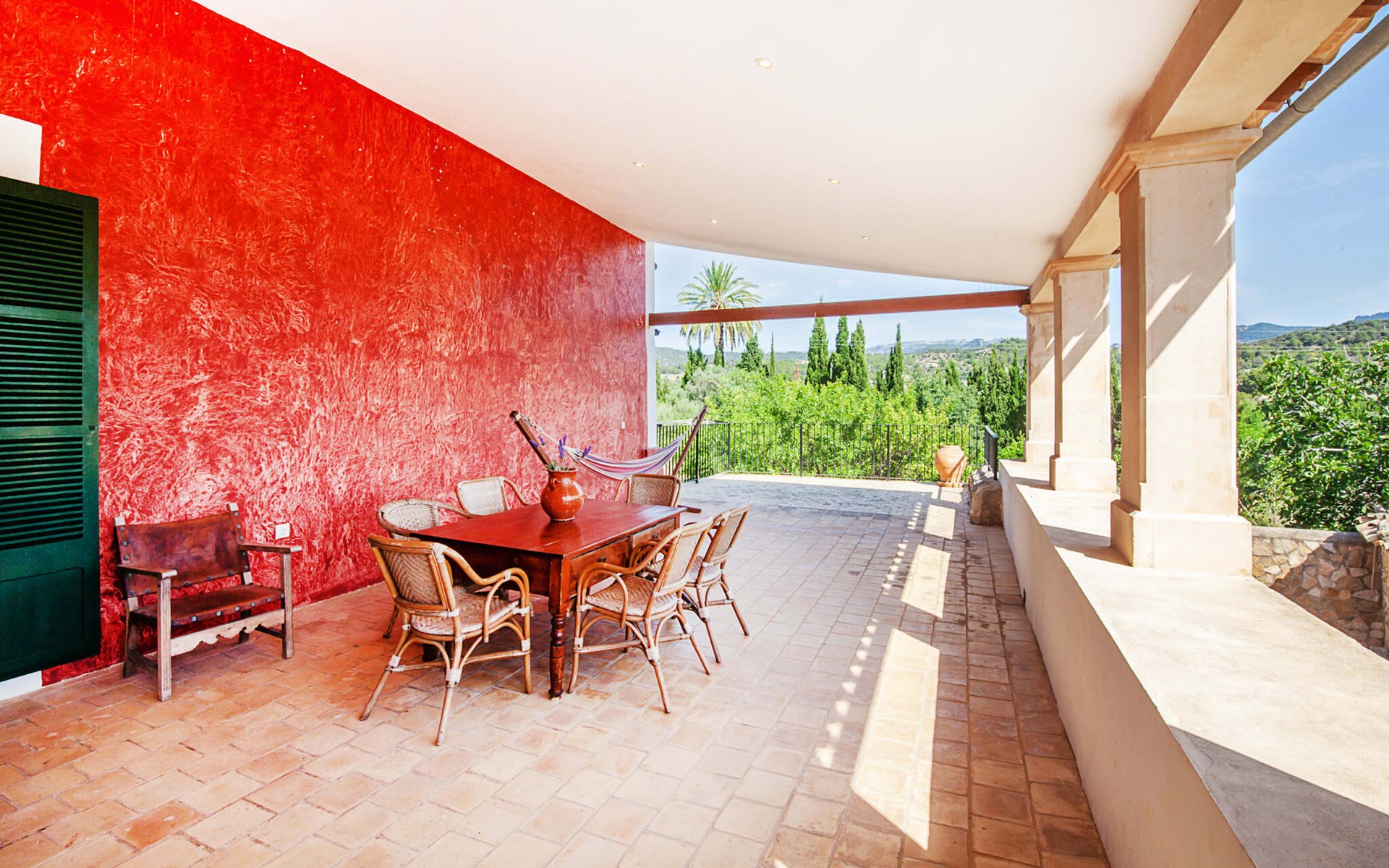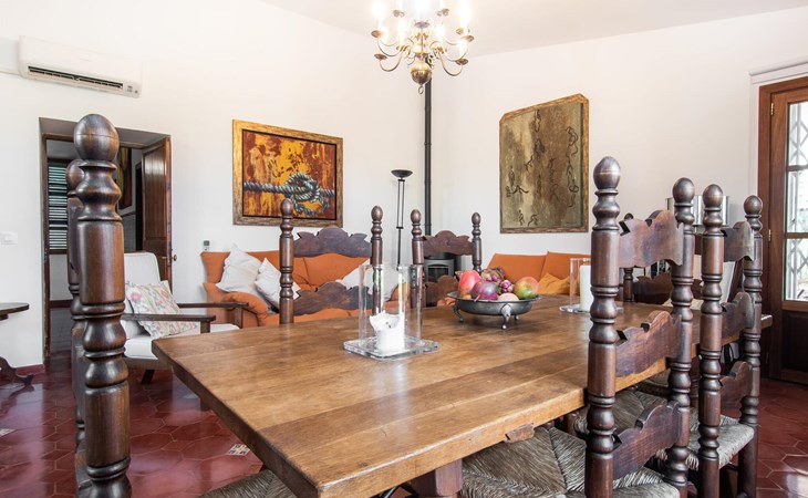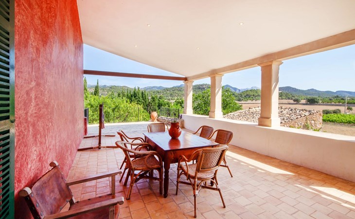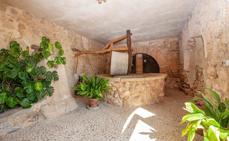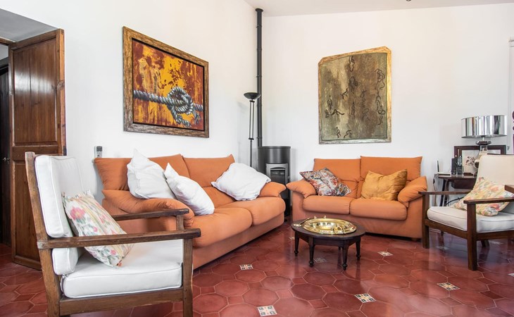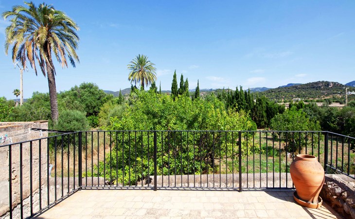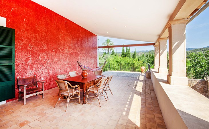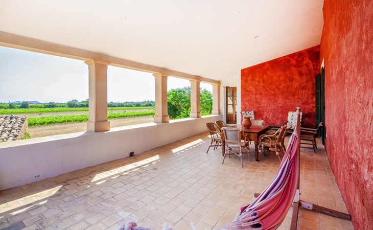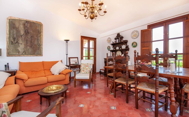 The lovingly restored Finca Son Corco in the heart of Mallorca offers a peaceful, rural retreat away from the hustle and bustle of the island. Situated on an old Mallorcan estate in the wine-growing area near Consell, this charming 200 m² guest house has its own private pool and a spacious, covered terrace where you can enjoy both privacy and breathtaking panoramic views. The magnificent, gently sloping pool is equipped with comfortable loungers and parasols. The property is surrounded by lush cypress, palm, almond and olive trees. The discreet neighbours, who live in the adjoining old farmhouse, have their own access road.