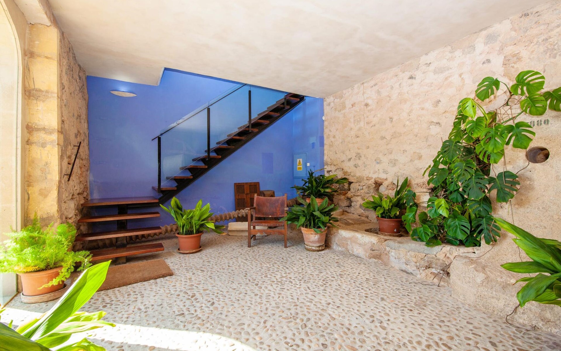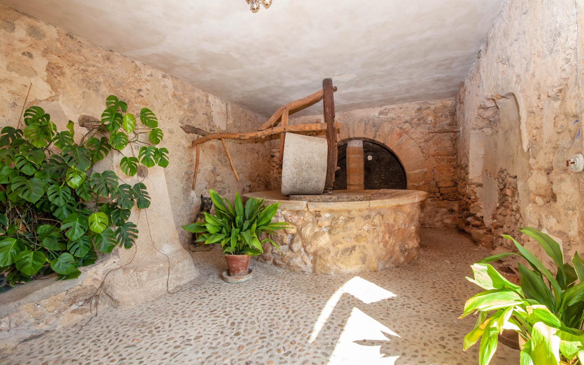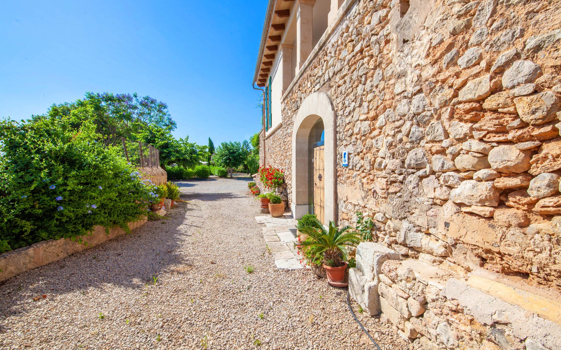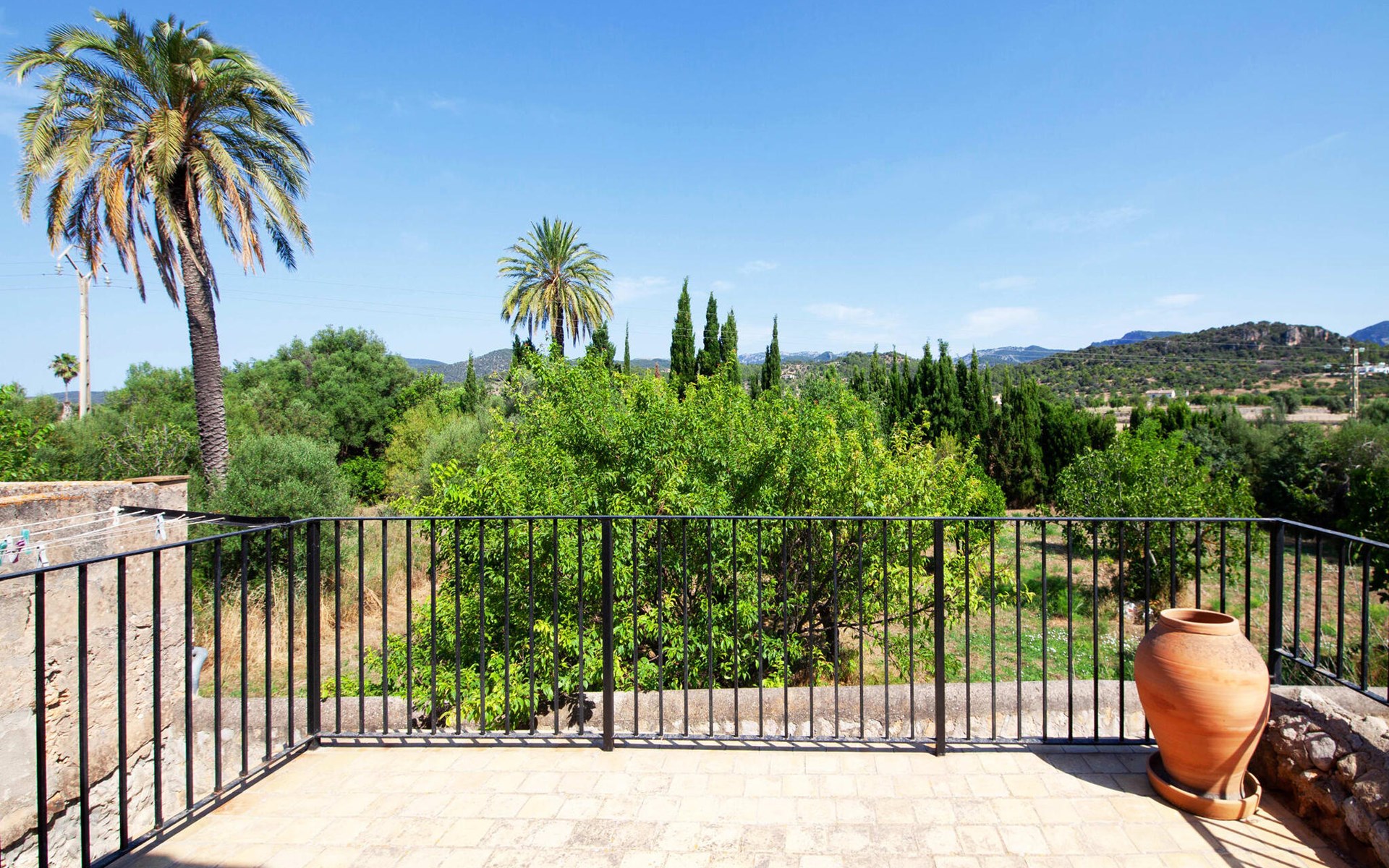 The lovingly restored Finca Son Corco in the heart of Mallorca offers a peaceful, rural retreat away from the hustle and bustle of the island. Situated on an old Mallorcan estate in the wine-growing area near Consell, this charming 200 m² guest house has its own private pool and a spacious, covered terrace where you can enjoy both privacy and breathtaking panoramic views. The magnificent, gently sloping pool is equipped with comfortable loungers and parasols. The property is surrounded by lush cypress, palm, almond and olive trees. The discreet neighbours, who live in the adjoining old farmhouse, have their own access road.