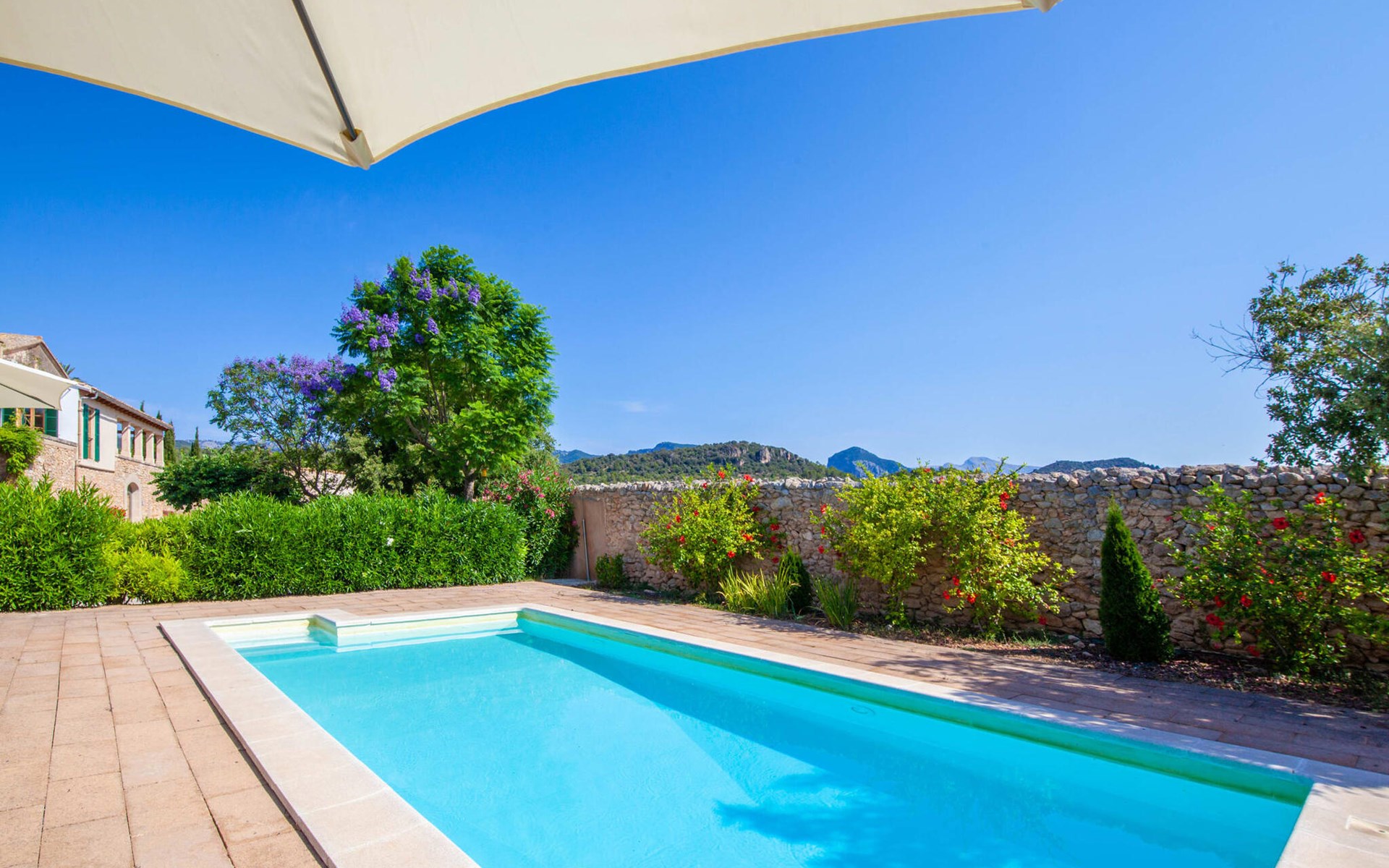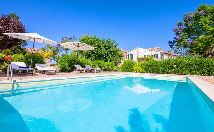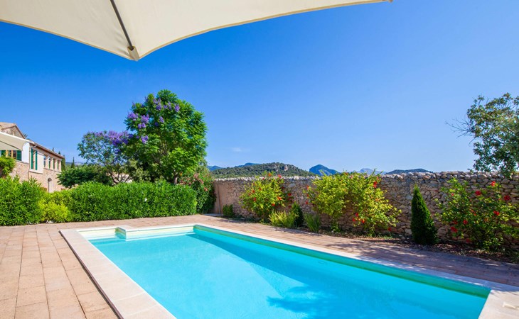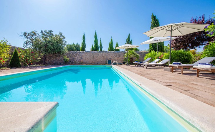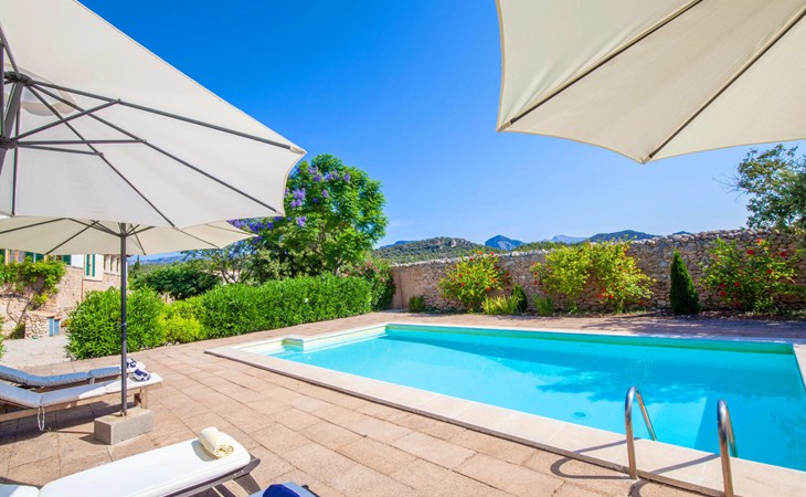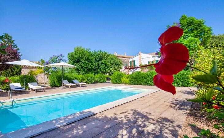 The beautiful, old natural stone villa Son Corco is located near the village of Consell in the north of the island. The large house with a stylish selection of classic Mallorcan furniture and modern elements was built in the middle of a marvellous, typically Mediterranean landscape, which you can explore on long walks or hikes. The pool, surrounded by lush, green oleander bushes, is a great place to cool off, or you can drive your hire car around 25.5 km to Ciudad Jardin beach.