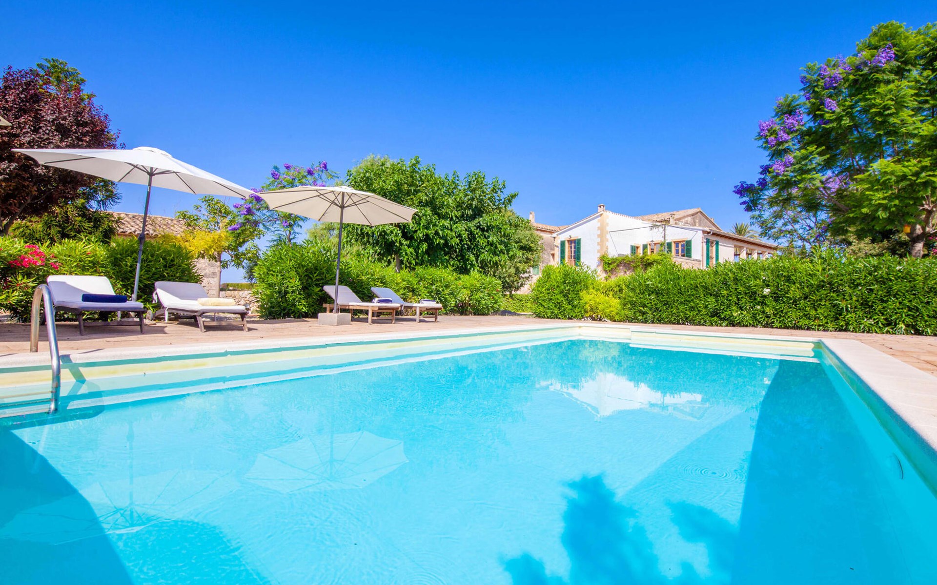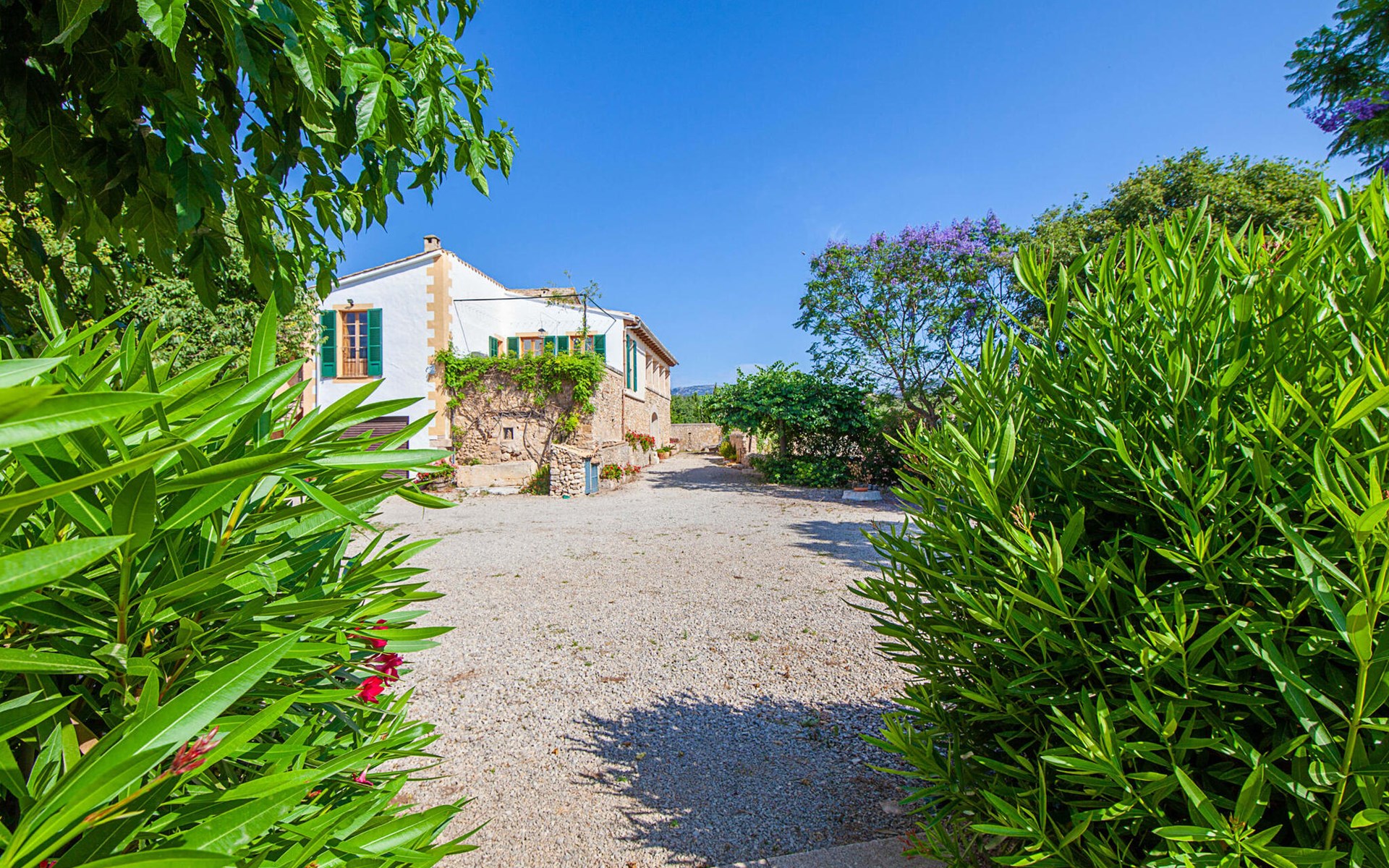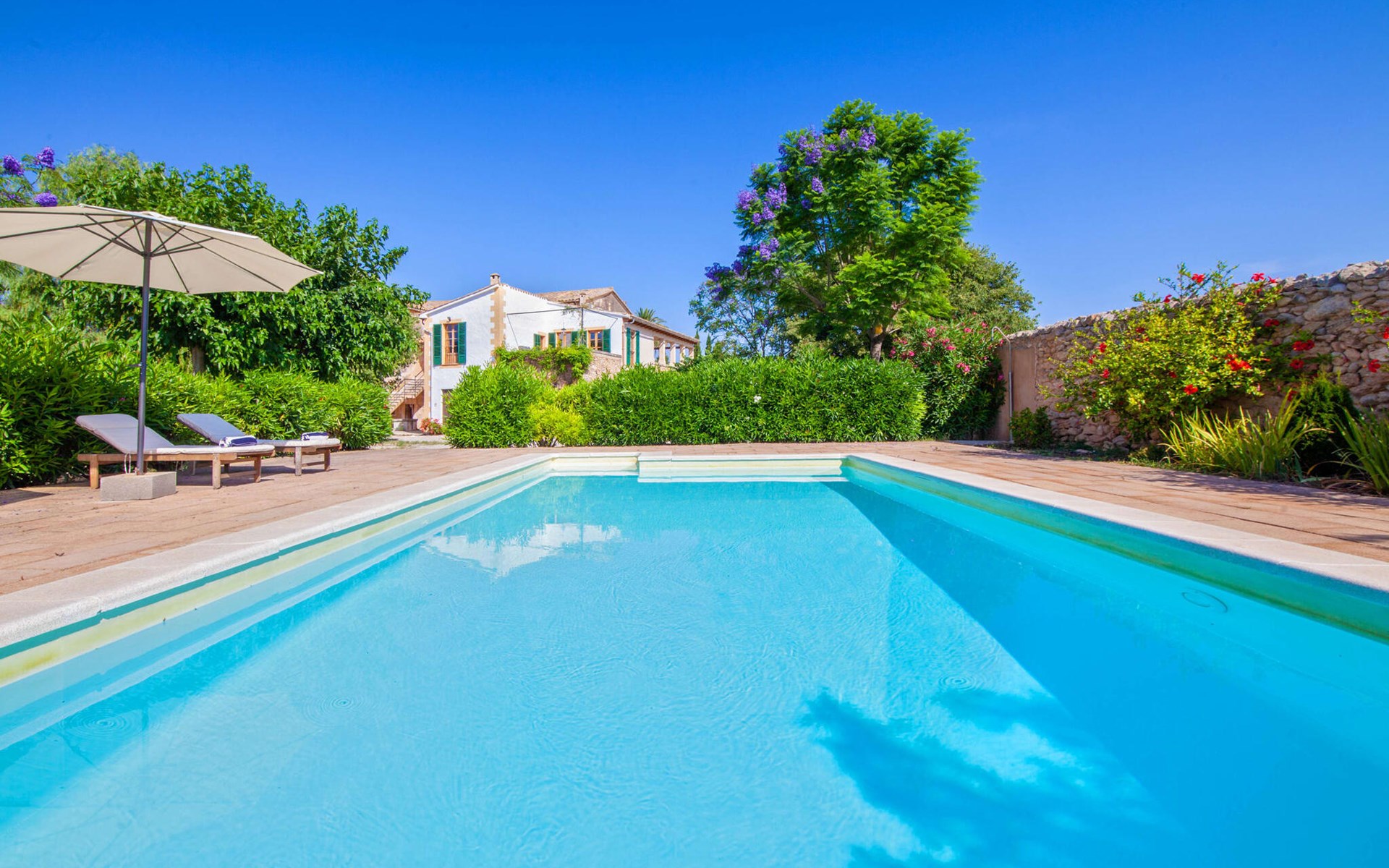 The beautiful, old natural stone villa Son Corco is located near the village of Consell in the north of the island. The large house with a stylish selection of classic Mallorcan furniture and modern elements was built in the middle of a marvellous, typically Mediterranean landscape, which you can explore on long walks or hikes. The pool, surrounded by lush, green oleander bushes, is a great place to cool off, or you can drive your hire car around 25.5 km to Ciudad Jardin beach.