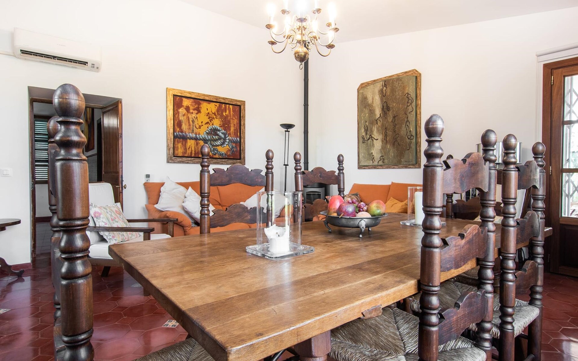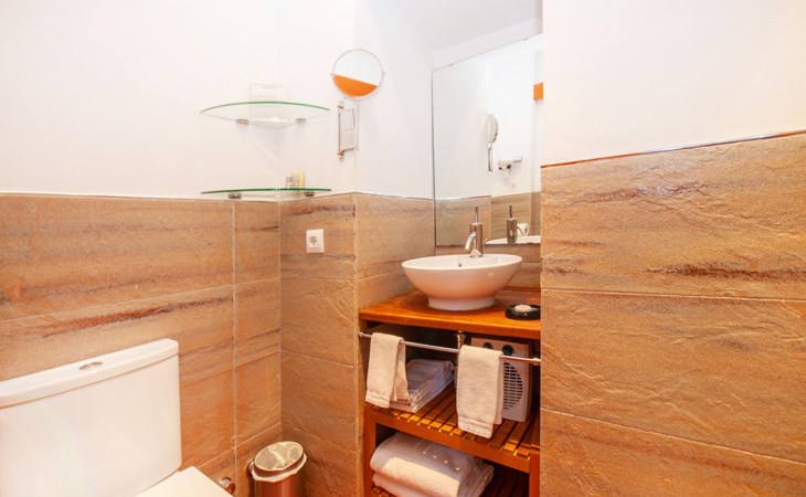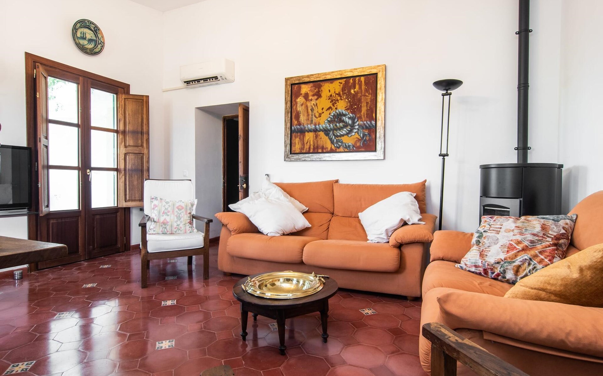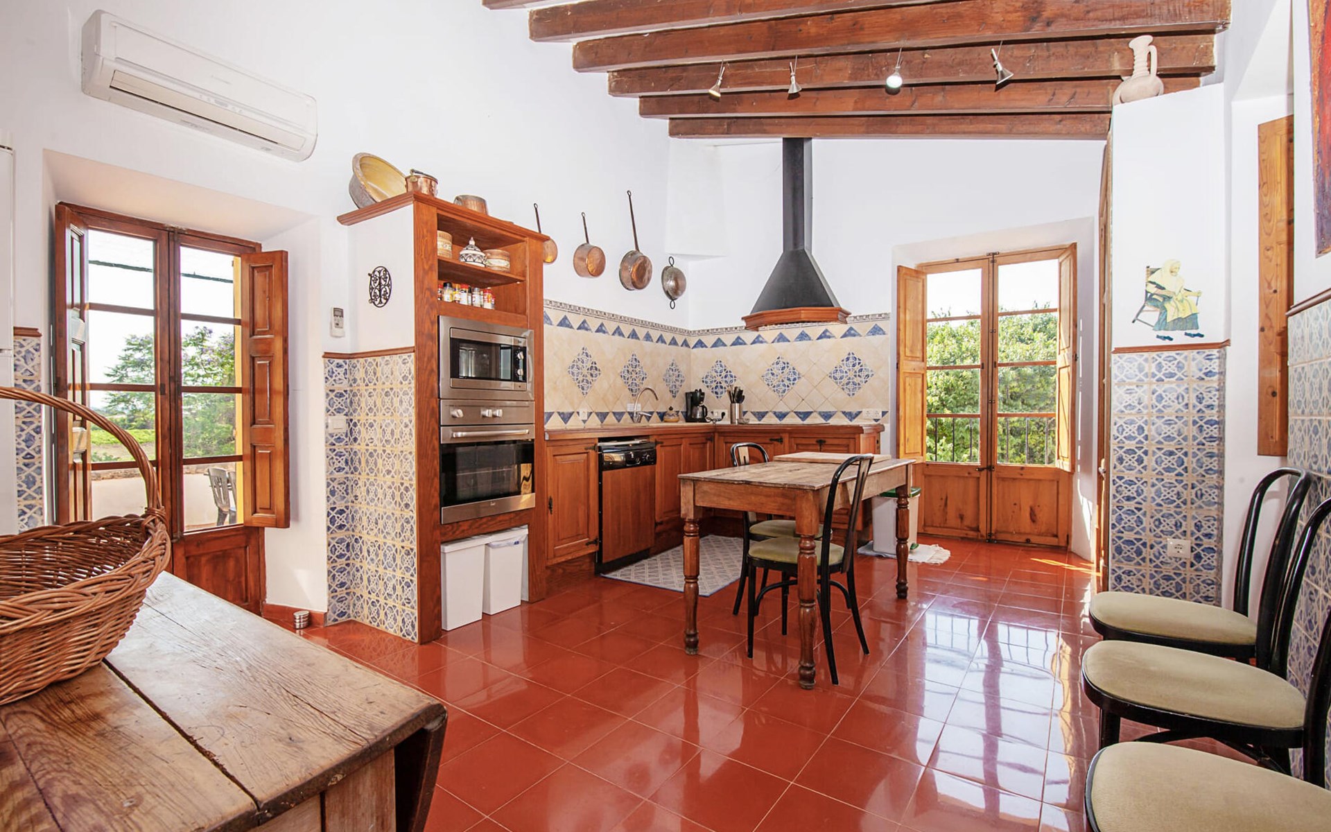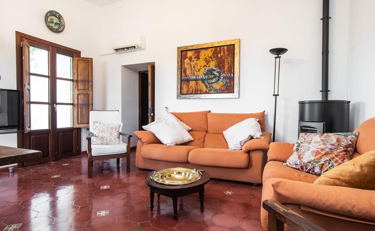 The rustic living area is tastefully furnished and creates an authentic and cosy atmosphere. Large windows allow plenty of natural light into the spacious rooms. The friendly country-style kitchen is equipped with modern appliances. The three en-suite bathrooms offer contemporary comfort and the spacious bedrooms are equipped with air conditioning, as is the living area. In the cooler months of the year, radiators and a pellet stove create a warm and cosy atmosphere. Your holiday home is located approx. 2 km from the tranquil village of Consell and can be easily reached by car via the road, which is acoustically perceptible depending on the wind direction. The surrounding lowlands invite you to take leisurely walks and cycle tours through the vineyards.