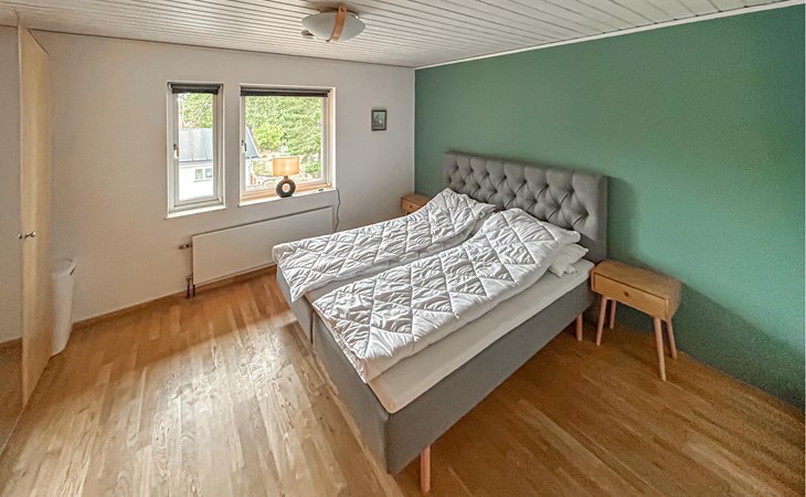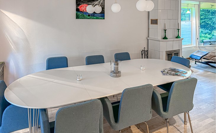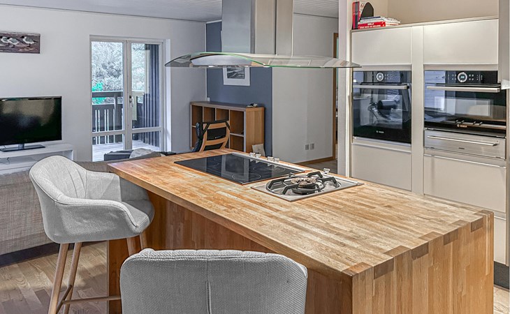 Be inspired by the bright and open design of the house and enjoy the stylish furnishings. The spacious living area welcomes you with cosy sofas, a large dining table and a wood-burning stove, which provides cosy warmth on cooler evenings. Use the modern kitchen with cooking island to prepare meals together. Relax in the seating area with TV or retreat to the sauna to recharge your batteries after an eventful day.