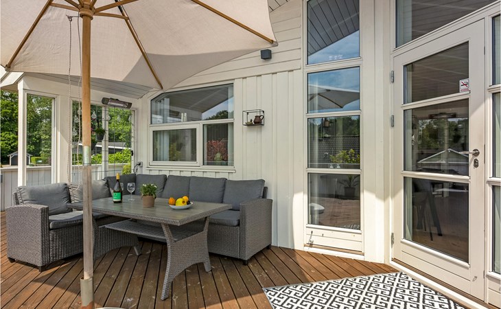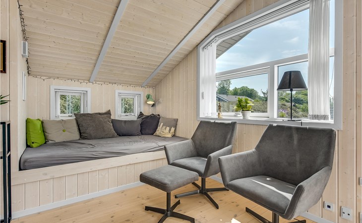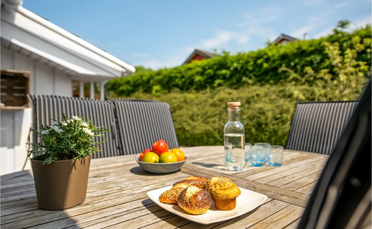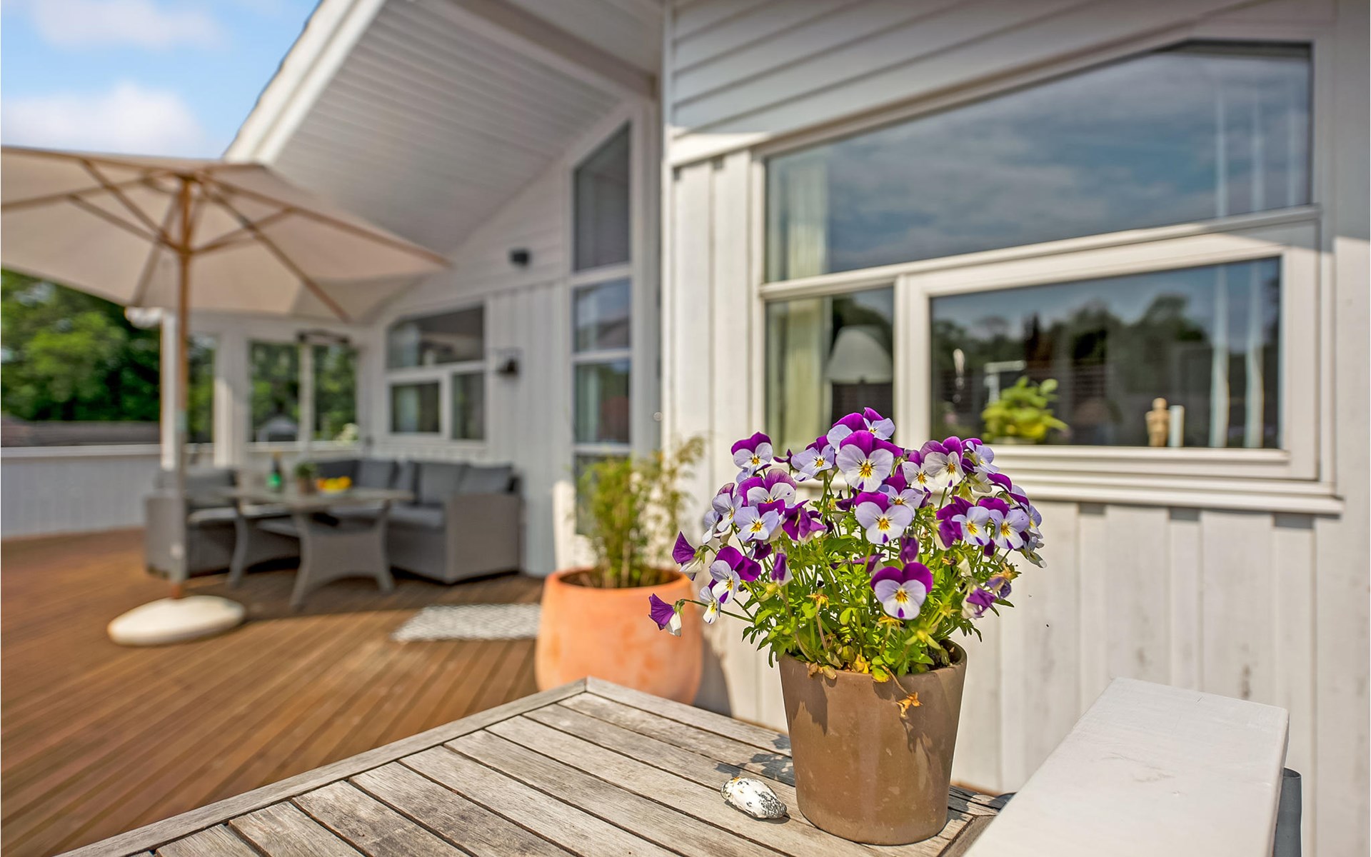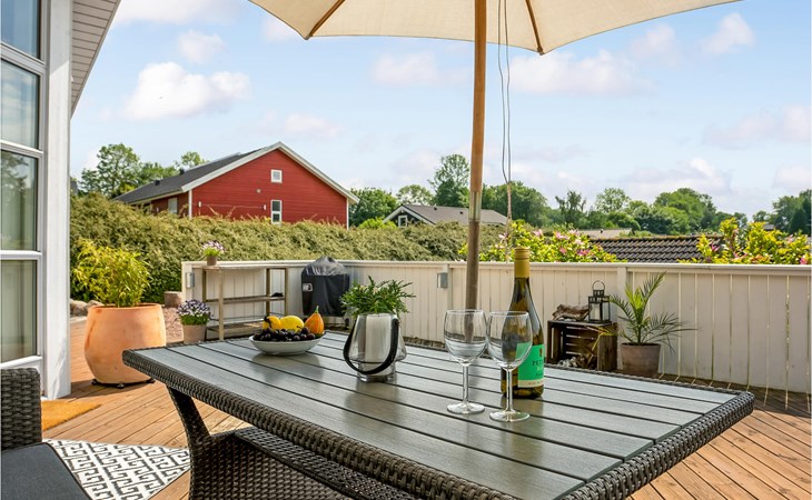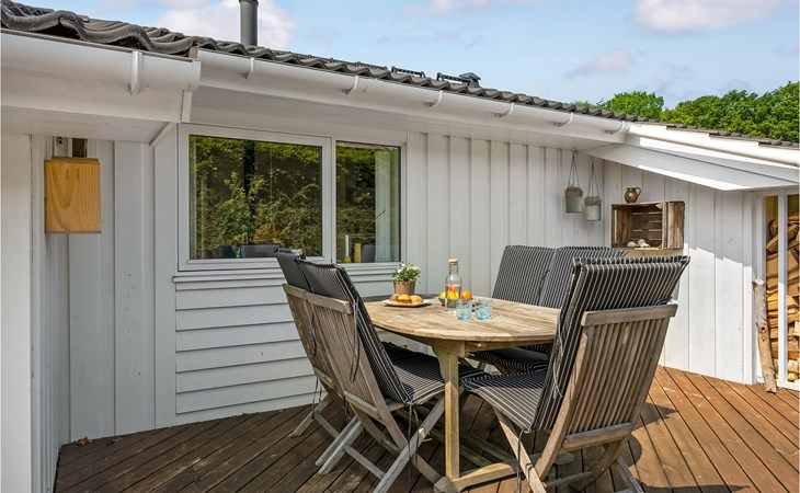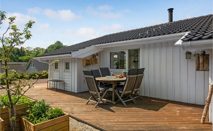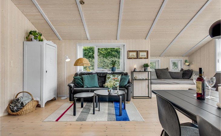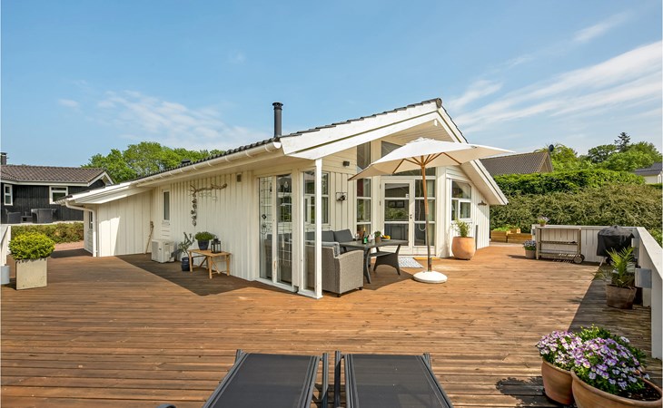 Highly situated vacation home with a spacious, view-protected terrace area, only 200 m from the gentle, Danish Baltic Sea coast.