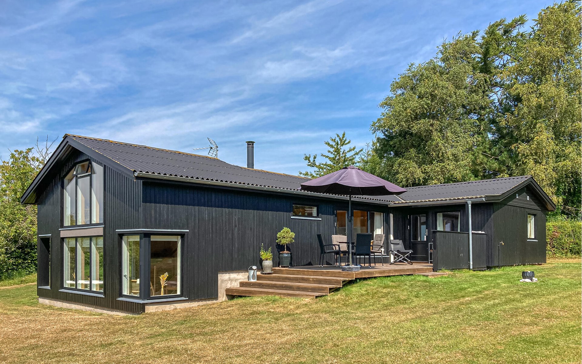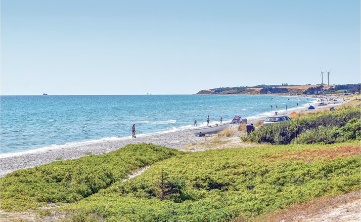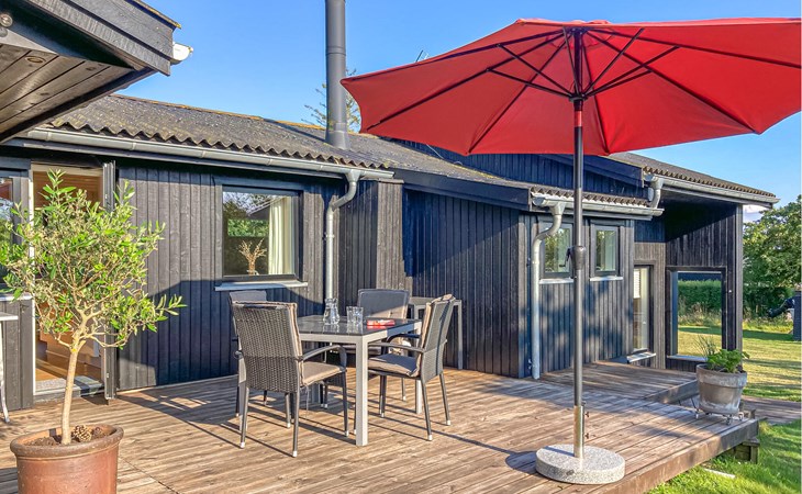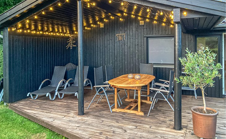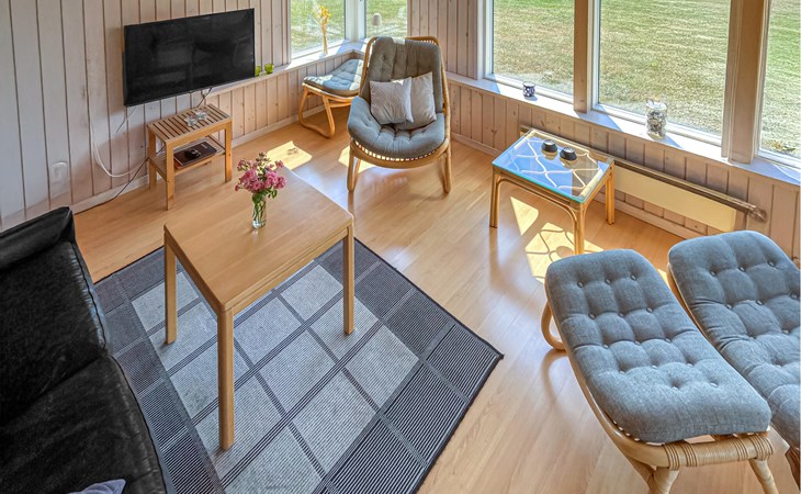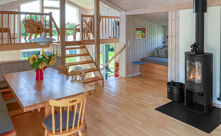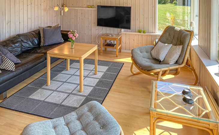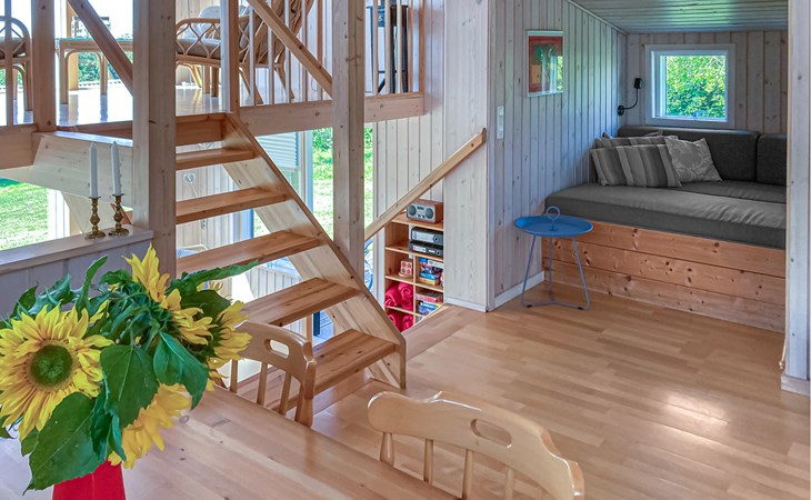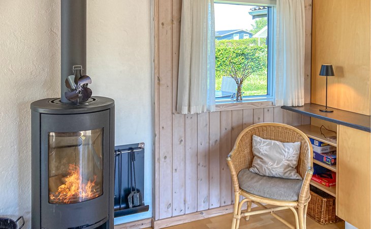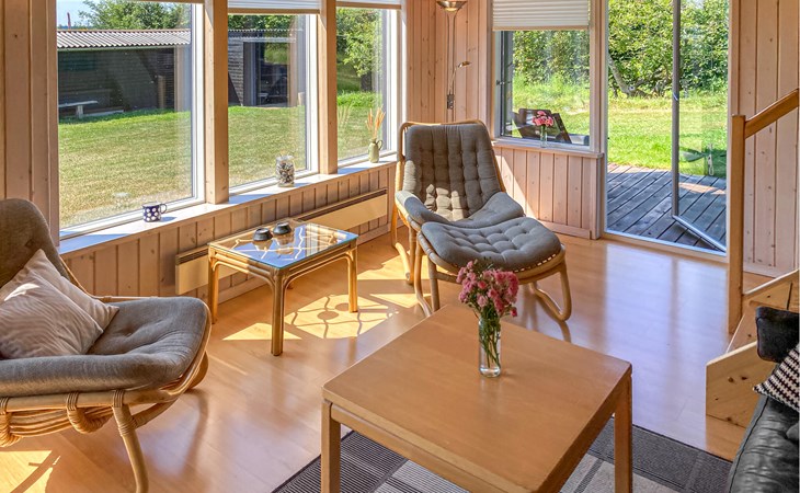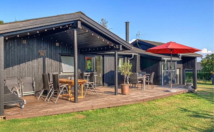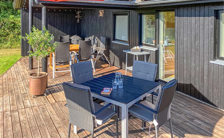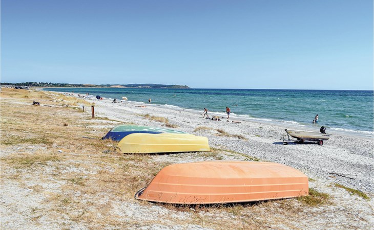 Completely renovated cottage with a view of the island of Hjelm. The beautiful property is located only 300 m from the beautiful swimming and fishing beach. There is also a good slip for your own boat. At the cottage there is a fish cleaning place. Living room is laid out on 2 levels and therefore you can easily spend your free time here. You will always find a quiet corner or a place for a board game. You can also enjoy the outdoor life on the large wooden terraces around the whole house. There is a hammock on the terrace. The property is large and is also suitable for playing soccer. There is a German TV channel. In the garden you have views from several tranquil corners.
